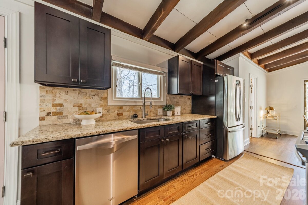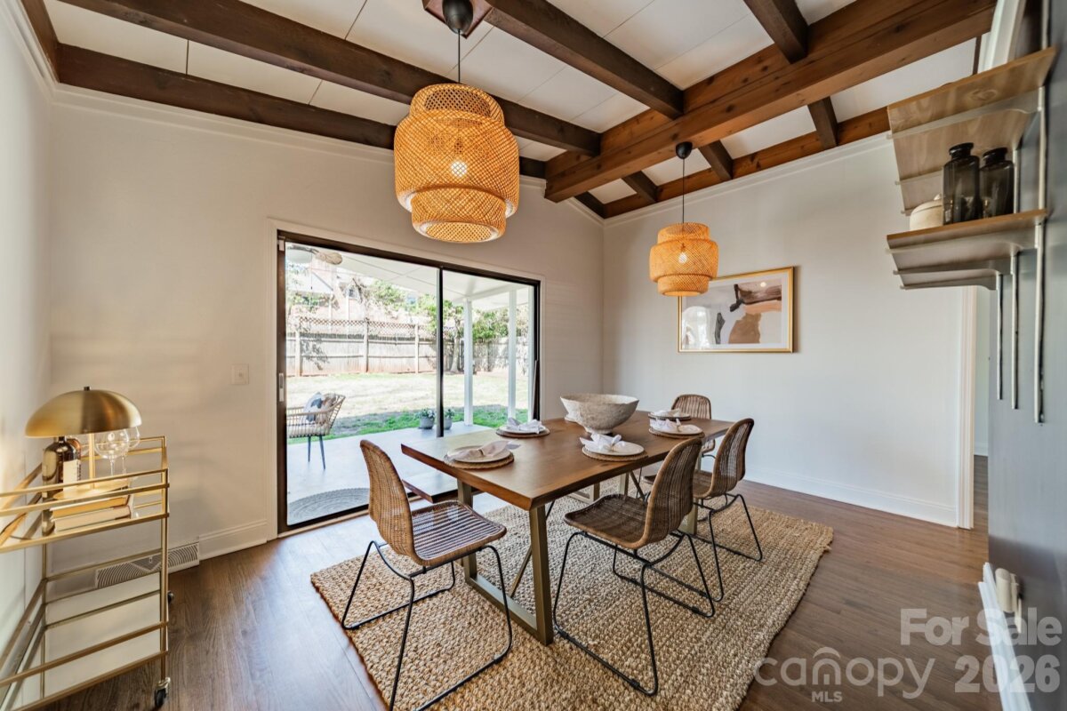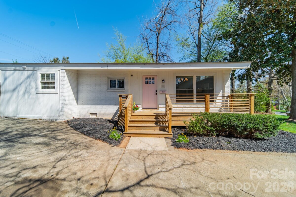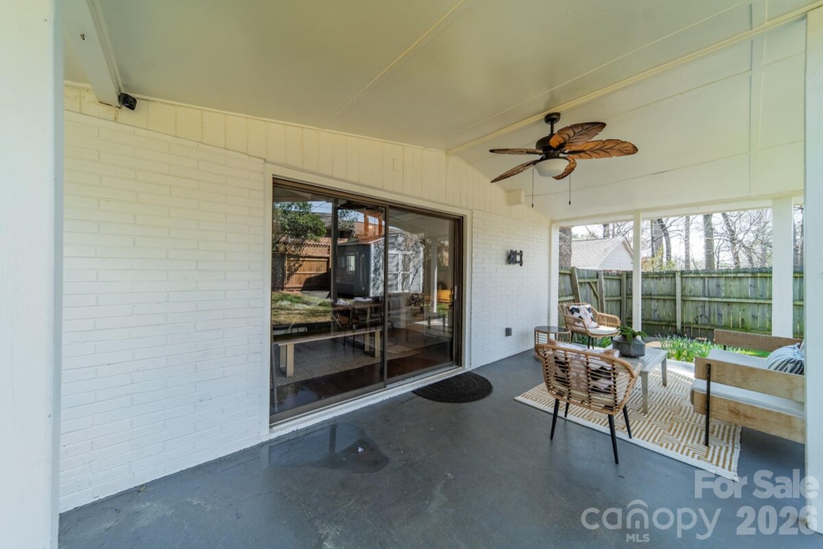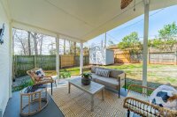 This charming 3-bedroom, 2-bath home blends mid-century vibes with modern livability. The open floor plan creates a bright, welcoming space perfect for everyday living and entertaining. The living room features large windows that fill the home with natural light and beautiful hardwood floors that add warmth and character throughout. Glass doors open to a covered patio, seamlessly connecting indoor and outdoor living. Step outside to a large, fenced backyard—ideal for relaxing, entertaining, pets, or play. The yard offers plenty of space while creating a peaceful neighborhood setting. Located in a desirable area close to dining and shopping, you’ll enjoy easy access to everything in South End and along Park Road.