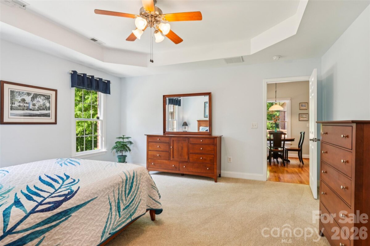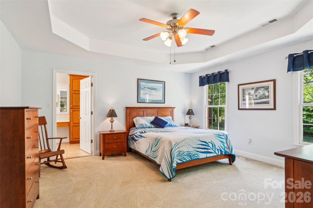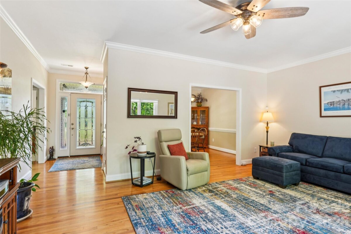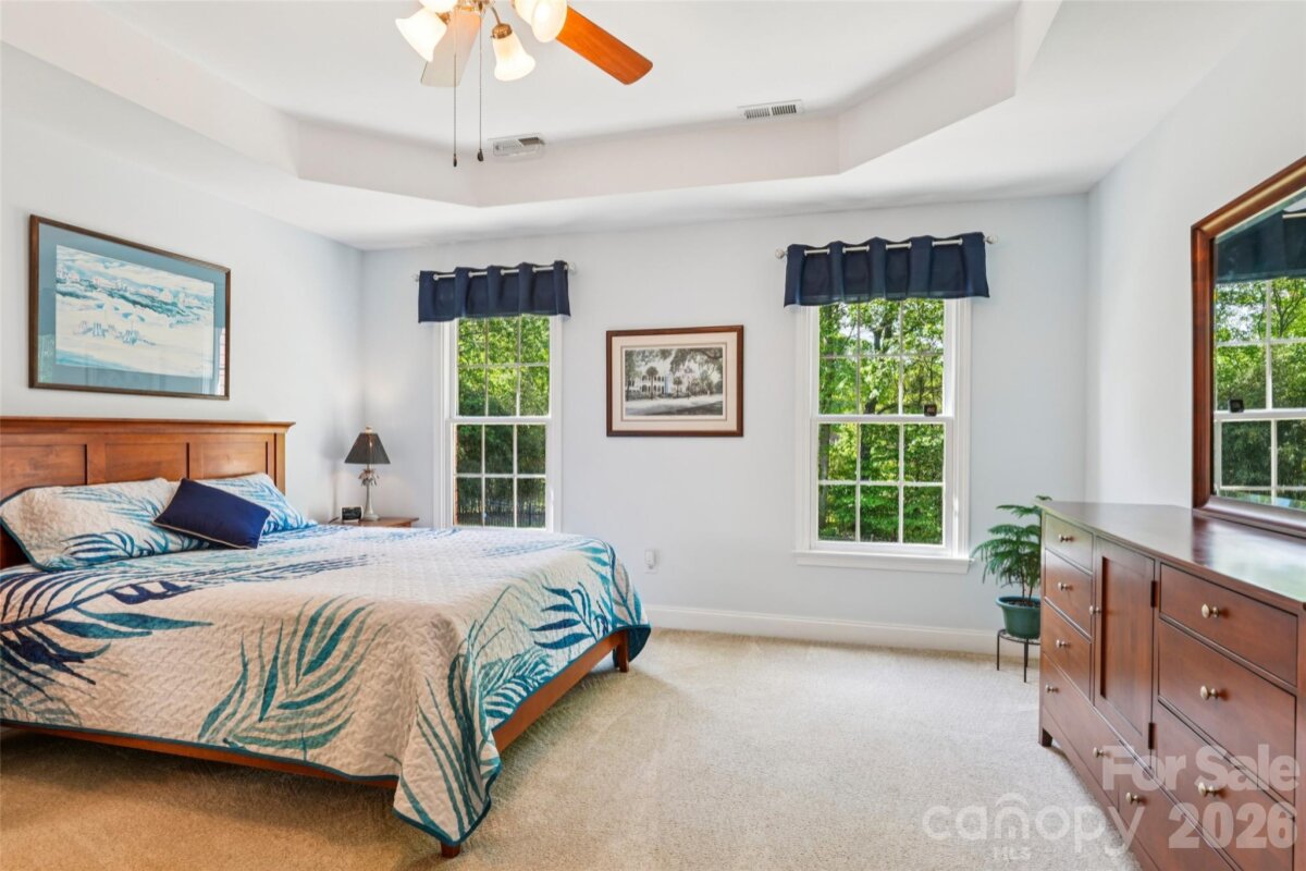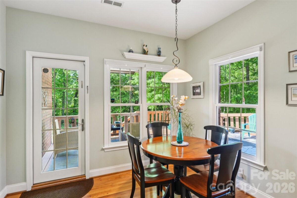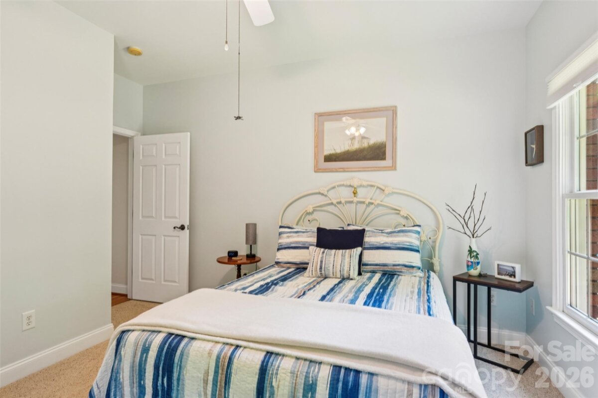 Welcome to this amazing home sitting on 1.5 acres with a peaceful setting and a fenced private backyard in sought after Spring Forest. Community includes walking paths. An all brick home subdivision in Cool Spring/North Iredell school districts. 2 car garage and a detached 2 car garage with a half bath and floored storage over it, 30 amp RV wiring. 3 bedroom 2.5 bath ranch plan with bonus room with a closet over the garage. Immaculate home with a split bedroom plan, eat-in kitchen with granite tops, stainless steel appliances including refrigerator and a pantry. Formal dining room. Hardwood floors throughout the main living areas. Primary bath features a jacuzzi tub and separate shower, tray ceiling in the primary bedroom. New roof with certainteed 40 shingles year on the house in 2025! Covered guttering and irrigation system. Tankless hot water heater. Water Boss water softener. Covered back porch and a large deck with sun screens. Beautiful landscaping with rhododendrons, azaleas, eucalyptus and banana trees! 1 Year home warranty also included!!
