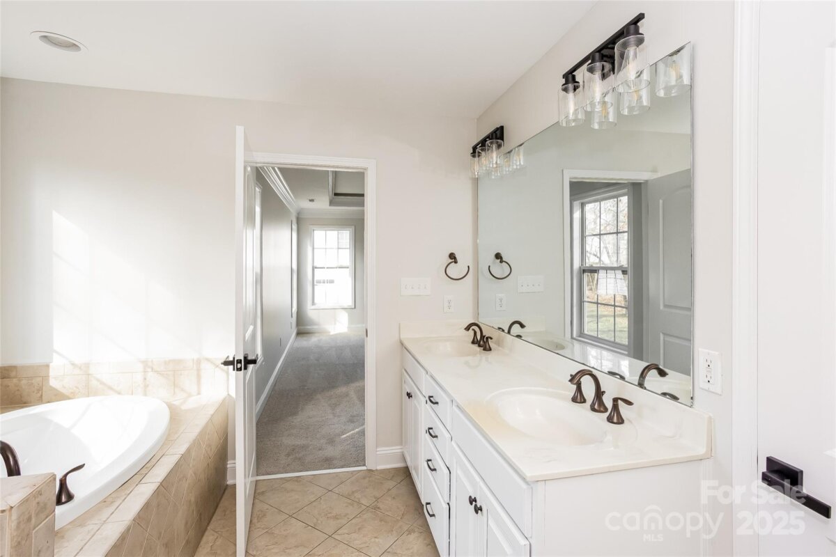 Fresh interior paint, new light fixtures, a new dishwasher and microwave, and freshly painted kitchen cabinets give this 5-bedroom, 3-bath home a bright, updated feel. The main level includes a bedroom with its own bathroom plus a den, while upstairs offers four spacious bedrooms. The primary suite features an en-suite with double sinks, a separate tub and shower, and a large walk-in closet for excellent storage.