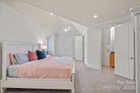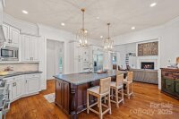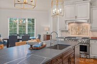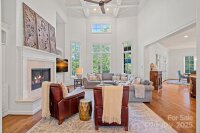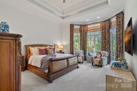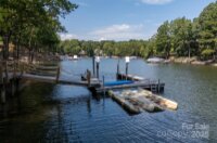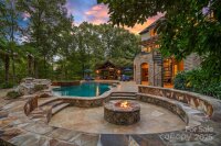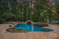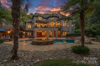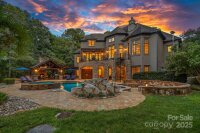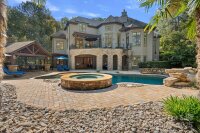 Magnificent 5-bedroom, 5.5-bath waterfront retreat in The Point, showcasing a stucco and stone veneer exterior with a private dock featuring a boat lift and two wave runner ramps, nestled on nearly 2.5 acres of secluded grounds with approximately 425 feet of shoreline. The expansive main level boasts soaring ceilings, modern lighting, and exquisite crown molding throughout. It includes a vaulted-ceiling office, a dining room with wainscoting and tray ceiling, plus a spacious great room with a gas fireplace and coffered ceiling. The kitchen dazzles with brushed gold pendant lighting, honed leathered steel gray countertops, a commercial 48" range, and a generous breakfast area. The primary suite, located on the main level, features a double tray ceiling and a door opening to the patio, accompanied by two guest bedrooms. Upstairs, an additional guest bedroom with a full bath provides extra comfort. The lower level offers a billiard room, family room, gym, two more bedrooms, ample storage, and a lake garage with a workshop. Outside, a luxurious oasis awaits with a heated, saltwater Pebble Tec pool, complete with a waterfall, tanning ledge, and bubblers. The backyard haven features a freestanding covered Travertine pavilion with a tongue-and-groove vaulted ceiling, a wood-burning stone fireplace, a built-in kitchen with Bull Grill, and a portico for al fresco dining. A stone seating area with a gas fire pit completes this breathtaking outdoor retreat.