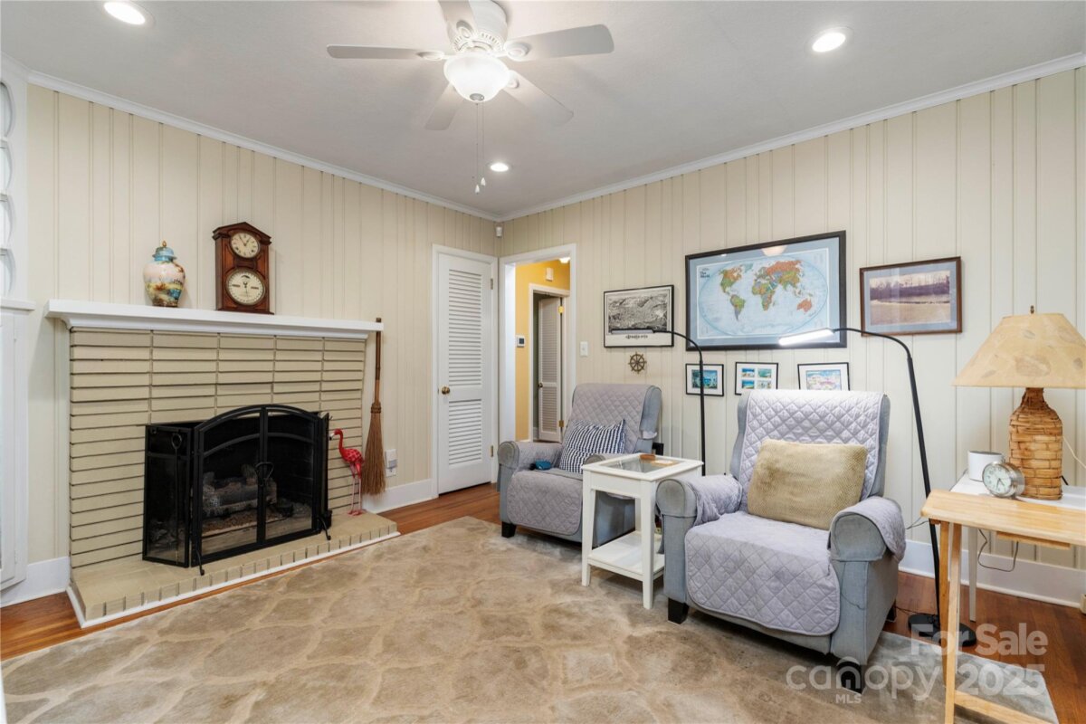 This charming brick ranch is in Windsor Park just off Central Ave. minutes from uptown and within walking distance of shops, groceries and restaurants and public transportation. The house has been well maintained and updated. The HVAC is under 10 years old and serviced regularly. Plumbing was replaced in 2023. New roof 5 years ago. Replacement windows. The gas water heater is 9 years old. Kitchen has range and 3rd bedroom/den with closet has gas fireplace A finished heated and cooled sunroom addition is off the den and overlooks the back yard and gardens which are well established and offer flowering surprises throughout the year. There is an attached garage/workshop with utility.laundry room and also a 9x12 shed. The house has hardwoods throughout other than laminate in kitchen and ceramic tile in baths. The full bath has a walk-in shower. The primary bedroom has a half bath. The attic has pull-down stairs and storage. Plenty of areas to entertain, including deck and fire pit area. Interior being painted and can lights going in living room and dining room.