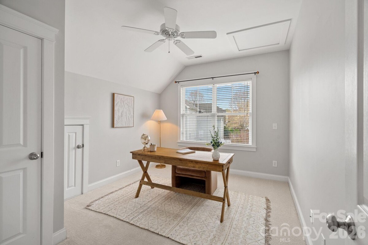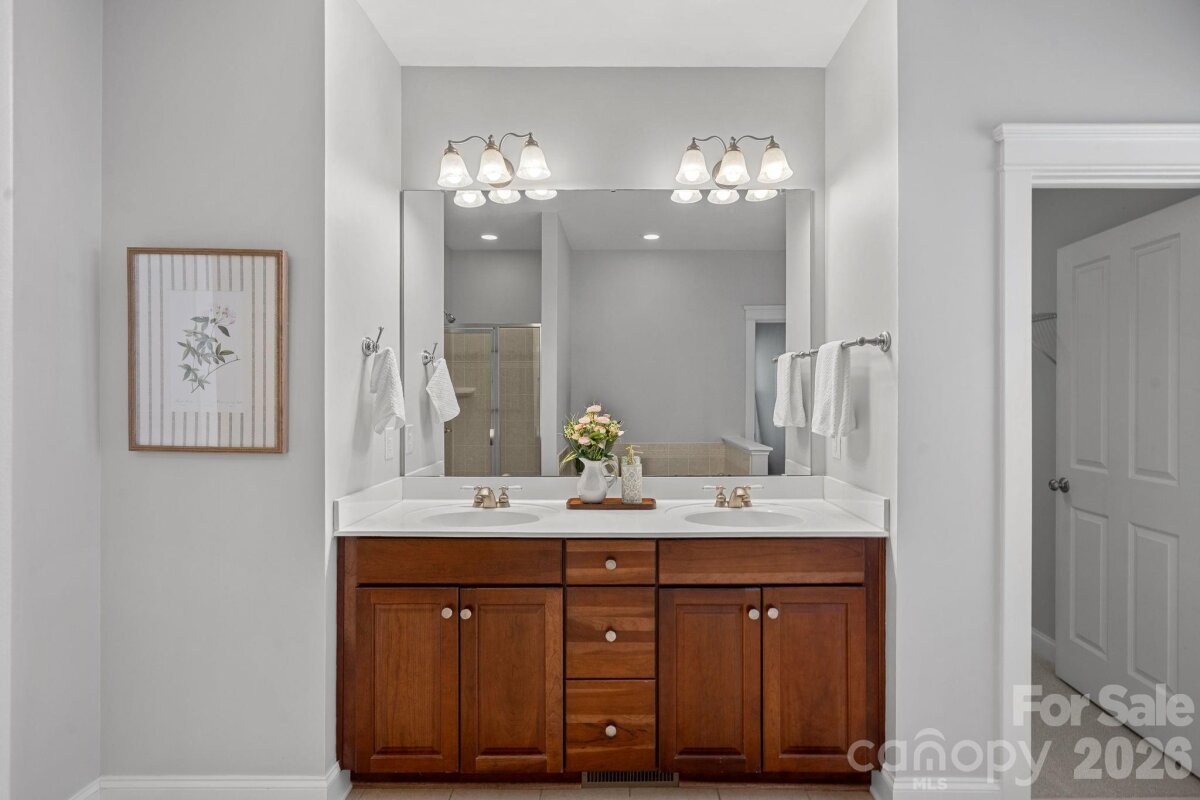 Welcome to this beautiful and spacious two story home in the highly sought after Water Oak community, perfectly positioned just across the street from the neighborhood pool and playground. Freshly updated with new paint and carpet throughout, this home is move-in ready and designed for comfortable everyday living. A standout feature of this home is the main level living, including a spacious primary suite and convenient laundry room. The primary suite offers a private retreat with a walk-in closet, soaking tub, separate shower, and dual sink vanity, while the nearby laundry room with utility sink adds ease and functionality to daily routines. The main level also features hardwood floors, a dramatic two-story great room with a gas log fireplace, and a formal dining room ideal for gatherings. The open kitchen offers an eating bar, breakfast area, stainless appliances and quality wood cabinets with custom pullouts for storage. Upstairs, you will find three spacious bedrooms, a full bath, a flex or office space and unfinished attic areas for excellent storage or future expansion potential. Enjoy outdoor living with a welcoming covered front porch and a rear stained cedar deck overlooking a low maintenance, private fenced yard. Water Oak is known for its tree-lined streets, sidewalks, and charming architecture. Community amenities include an outdoor pool, splash pad, covered pavilion, playground, and a brand new dog park. Conveniently located near shopping, dining, top rated schools, and I-77, with The Village at Byers Creek just next door for everyday essentials.