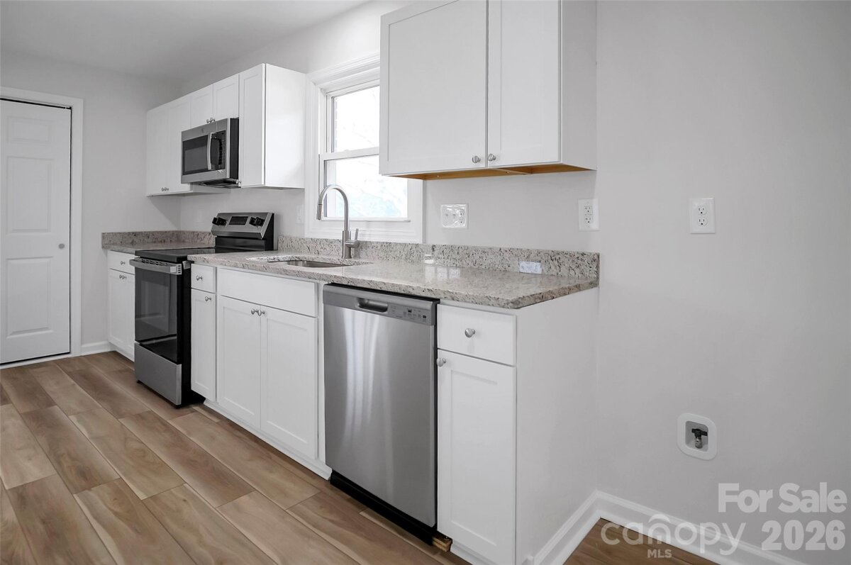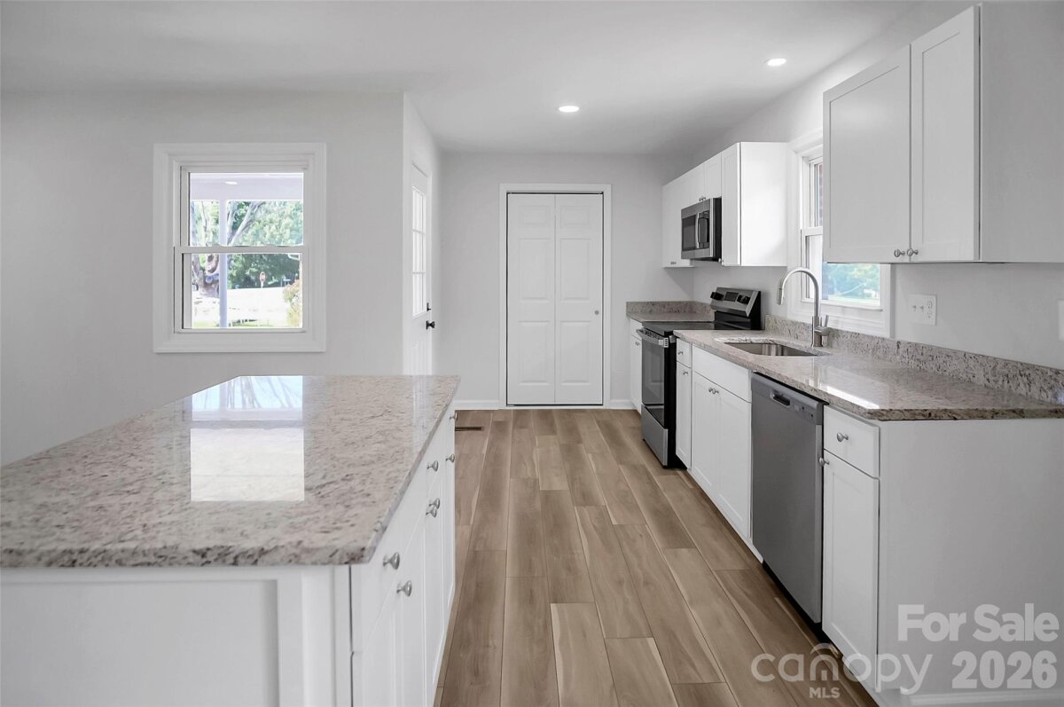 Welcome to this beautifully updated 3-bedroom, 1.5-bath brick ranch offering comfort, style, and an easy-living layout. The open floor plan connects the spacious living room, dining area, and a stunning new kitchen featuring white cabinetry, granite countertops, stainless steel appliances, and a center island perfect for gathering and entertaining. New LVP flooring runs throughout the main living areas, while all three bedrooms showcase classic hardwood floors. The primary bedroom includes its own private bath, and a conveniently located half bath serves guests. A dedicated laundry room adds everyday practicality. Step outside to enjoy the level, fenced backyard complete with two outbuildings—ideal for storage, hobbies, or pets. A wonderful blend of modern updates and timeless charm!
