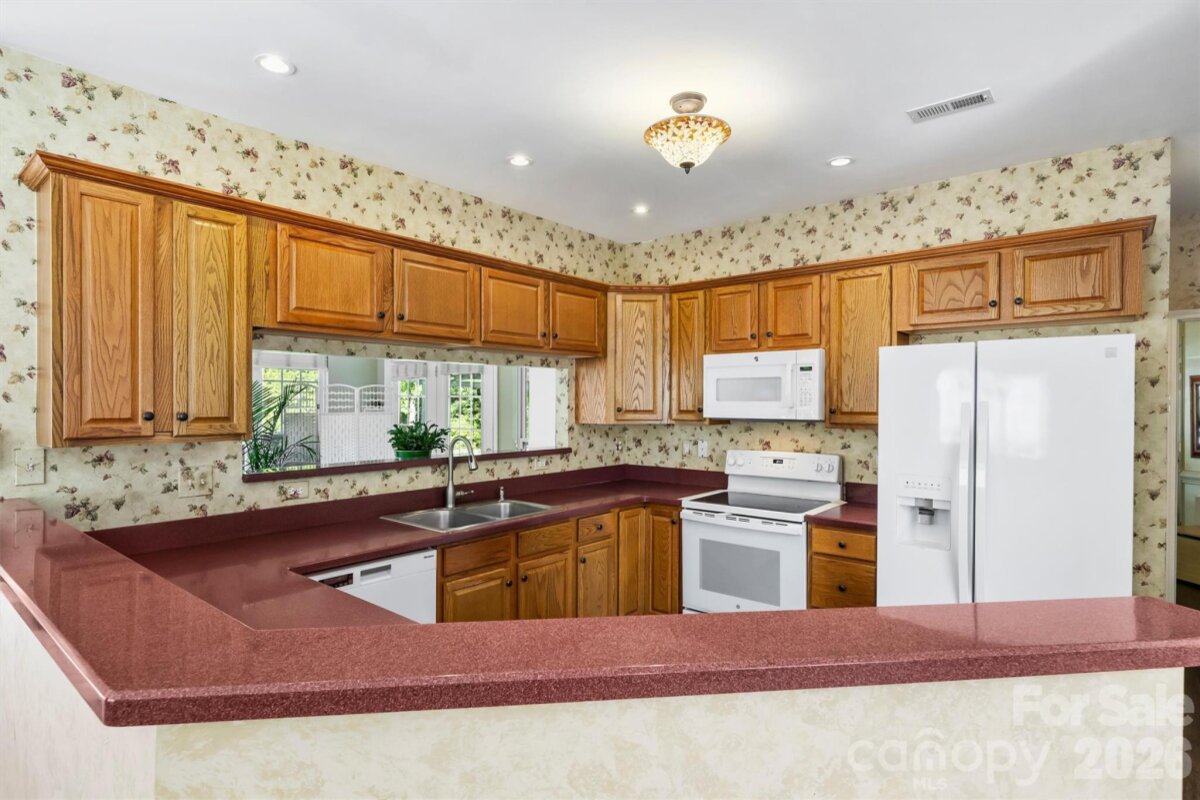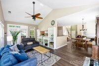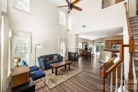 Located in the established Providence Glen community, this 5 bedroom, 3 full bath home offers the space, layout, and setting that make everyday living easy. The main level features a rare bedroom and full bath, ideal for guests, a home office, or multigenerational living. At the front of the home, the living room flows seamlessly into the dining area and is centered around a see-through fireplace, creating a comfortable and connected space for both everyday living and entertaining. Toward the rear, a light-filled family room overlooks the backyard and provides a more relaxed setting to gather. The kitchen is thoughtfully positioned between the living spaces and offers generous cabinetry, ample prep space, and easy flow to both the dining area and family room, making it functional for daily use while still ideal for hosting. Upstairs, the primary suite offers a spacious retreat with an ensuite bathroom featuring dual vanities, a soaking tub, separate shower, and a walk-in closet. Additional bedrooms are well-sized and provide flexibility for a variety of needs. Outside, the covered rear porch extends the living space and overlooks a flat, usable backyard that backs to a wooded area for added privacy. Whether for play, pets, or entertaining, the yard offers both space and versatility, along with a storage shed for added convenience. Close to shopping, dining, and everyday conveniences, this home offers the space, layout, and setting that are increasingly hard to find at this level. Come experience it in person!
