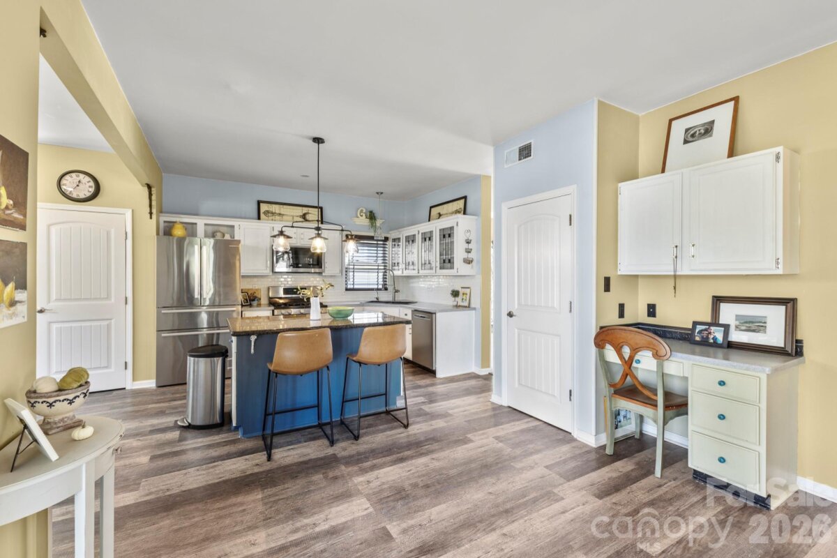 Lake living with a deeded boat slip (B34) that transfers with the property in the desirable, water-access community of Bridgeport of Lake Norman. This spacious 4-bedroom 2.5 bath, open-concept home offers an abundance of natural light through full-length windows on the main level, creating a bright and inviting atmosphere. The expanded kitchen and dining area feature granite countertops, a stylish tile backsplash, custom stained-glass cabinet doors, and stainless-steel appliances, including a gas range-perfect for cooking and entertaining. The primary suite is generously sized with an expanded en-suite bathroom showcasing ceramic tile, a relaxing garden tub, and a large walk-in closet. Additional living space includes a comfortable den with a wood-burning fireplace, easily convertible to gas logs if desired. Enjoy outdoor living on the huge backyard patio, complete with a freestanding stone fireplace-ideal for cool evenings and entertaining guests. The fenced backyard adds privacy and functionality. A two-car garage provides ample storage space, and the HVAC system was replaced in 2023. This roomy, light-filled home combines comfort, style, and an unbeatable water-access lifestyle-perfect for everyday living and entertaining.