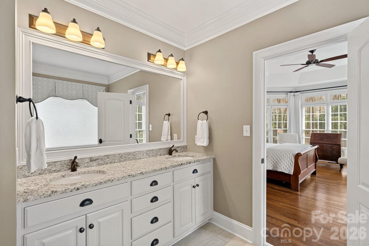 Located on a quiet culdesac street and perched on a hill, seasonally overlooking golf course and water in the distance, this full Brick home offers expansive living space. The home has been meticulously maintained by the original owners and curb appeal is 5 stars! Entering the main level you're greeted by a 2 story open Foyer, formal Dining and french doors leading to a large Study/Office. The Great room is 2 story and offers a gas log Fireplace and door to backyard Deck. Kitchen is concealed with the breakfast area overlooking the backyard. Neutral solid surface countertops accentuates the beautiful backsplash. Refinished cabinetry with bronze hardware. Updated Stainless Steel appliances. The natural light is captivating. Primary Suite is on main level and offers a beautiful bay window overlooking the backyard. Primary Bath has been renovated with neutral tiles and refinished cabinetry. Closet will impress. Upper level offers a Guest bedroom with Ensuite Bath and oversized closet. Secret attic storage is accessed within closet and sizable for all your storage needs. 2 additional large Bedrooms with a shared Bath. Shared Bath has dual sinks and private water closet/tub/shower. The spacious Bonus room has a closet and could serve as a 4th guest Bedroom if needed. 2 car Garage with epoxy floor, garage cabinets and separate entry door. Short distance to River Run clubhouse for golfing or Greyton Sports center for other activities. Hardwoods throughout except Bonus that has carpet. All custom solid core doors. Level backyard will accommodate a pool. Exterior Painted in 2023. Natural gas line to outdoor grill. Some features listed in Community features are available through River Run Country Club for additional fees.