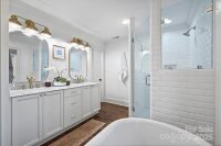 Set on one of Plaza Midwood’s charming sidewalk-lined streets, this classic 1948 Tudor blends enduring architectural charm with thoughtful, high-end updates. Inside, original character shines through 9-foot ceilings, hardwood floors throughout, graceful arched openings, detailed moldings, and an abundance of natural light. The main level offers a beautifully balanced layout with a cozy living and dining rooms, family room with tons of windows, custom built-in and off the kitchen. With a full bath and bedroom down, this is a versatile main-level room perfect for guests, home office, or playroom. The heart of the home is the kitchen—both functional and inviting—featuring custom cabinetry, honed black granite countertops, a generous wooden butcher-block island, new light & plumbing fixtures, and a 48" commercial-style gas range. The kitchen flows seamlessly into a spacious family room, creating a natural gathering place for everyday life and entertaining. Upstairs, the generous primary suite offers a peaceful retreat with hardwood floors, a walk-in closet, and a well-appointed bath featuring marble countertops, a pedestal soaking tub, and glass shower. Two additional bedrooms with new custom closets, a Jack/Jill full bath, and a conveniently located laundry complete the upper level. Outdoors, the private rear yard has been thoughtfully redesigned to create a serene extension of the home: new turf grass, a gazebo wired with string lights, new 6ft wooden privacy fence, gorgeous natural stone steps, a large paver patio—perfect for quiet evenings, playtime, or hosting friends. A charming detached cottage provides 240 additional heated square feet, ideal for a home office, creative studio, or flexible bonus space. The ADU has hardwood floors, vaulted ceilings and custom-built desk/bookshelves. Well maintained and rich in character, this home offers a rare opportunity to enjoy timeless architecture, functional living spaces, and walkable access to Plaza Midwood’s beloved breweries, coffee shops, dining, and Midwood Park —an exceptional setting for those drawn to the energy and community of this iconic neighborhood. *Open House Sat. 1/10 from 11am-1pm*