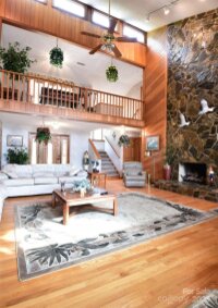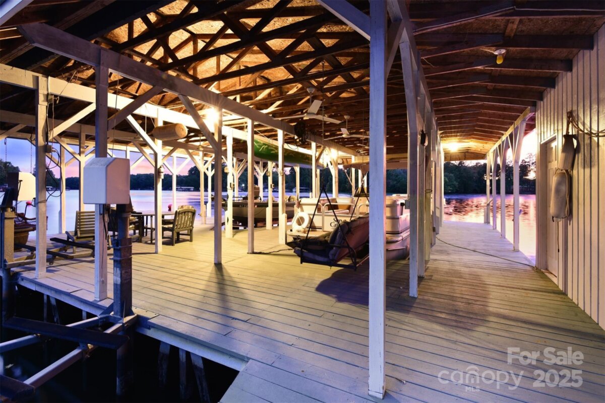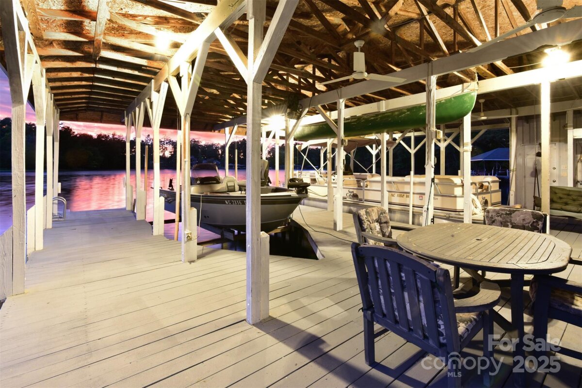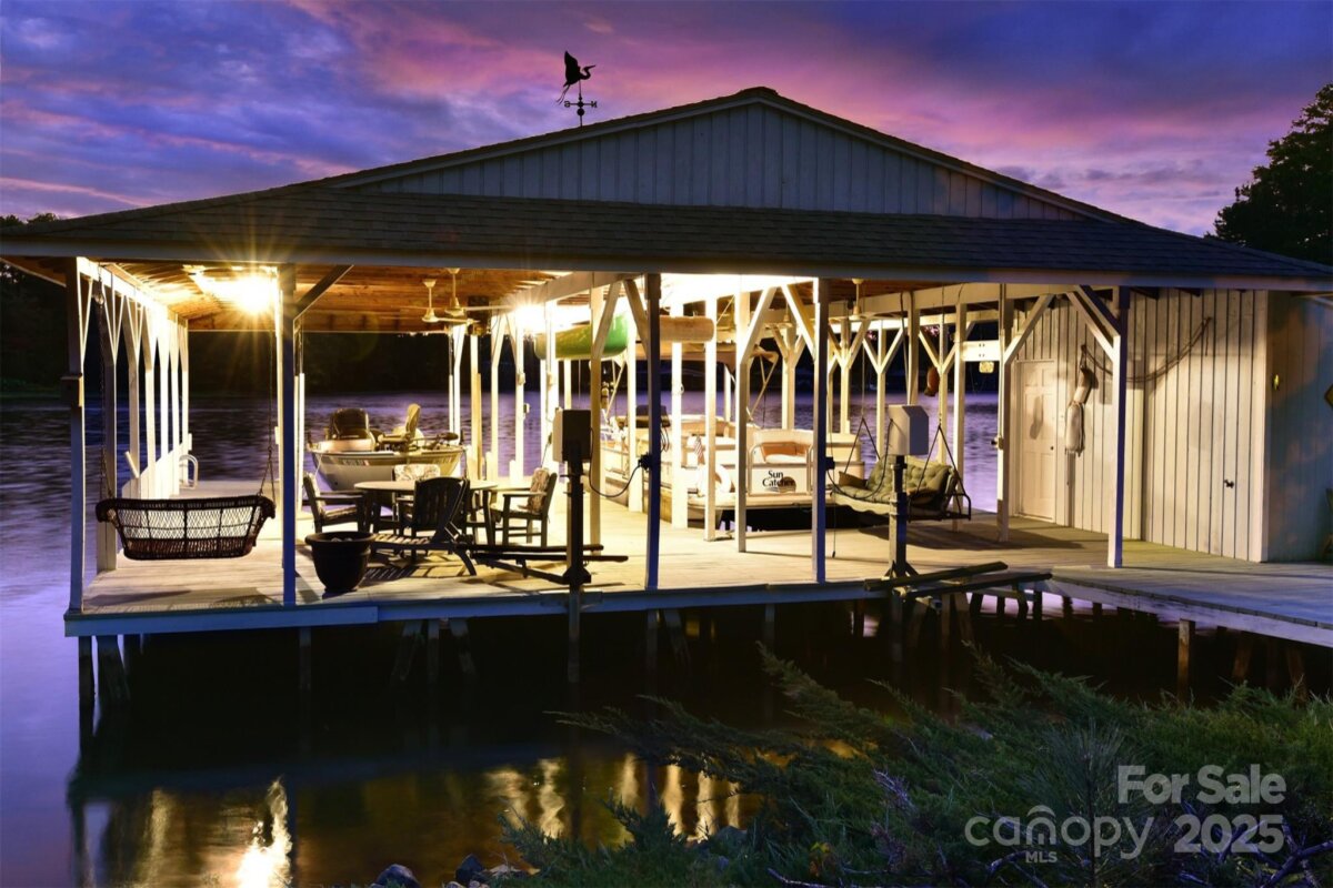 Welcome to your waterfront retreat on Lake Tillery! This warm and inviting home is filled with character, featuring cedar board siding and fir wood interior details. The two-story great room showcases a stunning stone fireplace with gas logs, perfect for gathering. Outdoors, the impressive boathouse offers two boat lifts, two jet ski lifts, and plenty of space to relax by the water. Rarely found features include a level lot, 2-car garage, and large 1,550+ sq ft boathouse with deep water. Enjoy the serenity of a peaceful cove while entertaining on the expansive back deck or in the spacious great room. Lake views can be found in almost every room of the home! This location is convenient to the local marina and waterfront restaurant. Home is being sold mostly furnished and includes the pontoon boat—move right in and start living lake life!