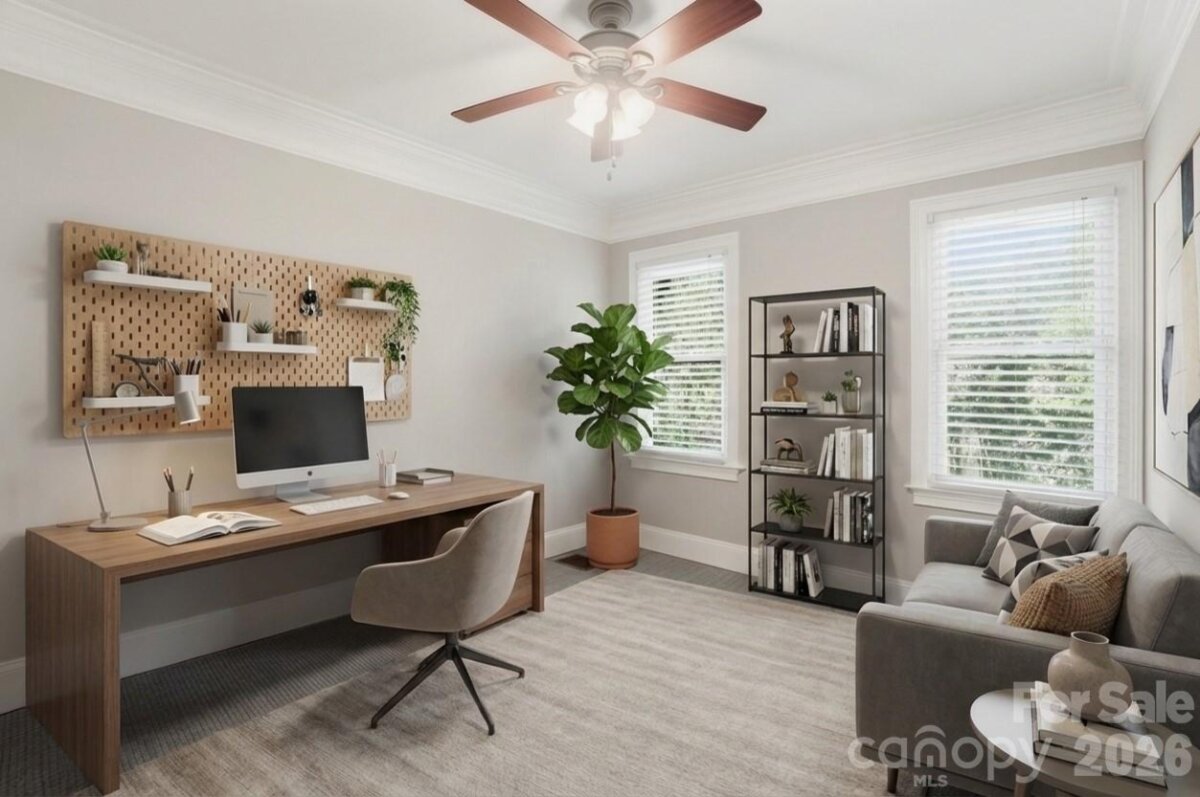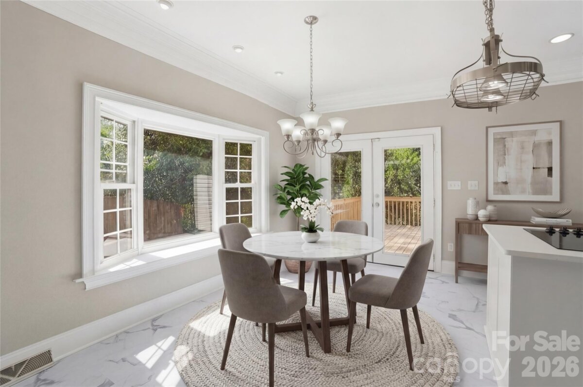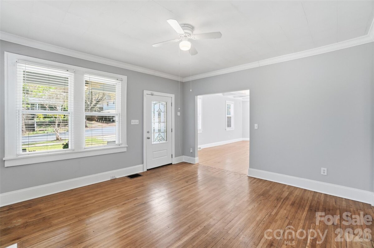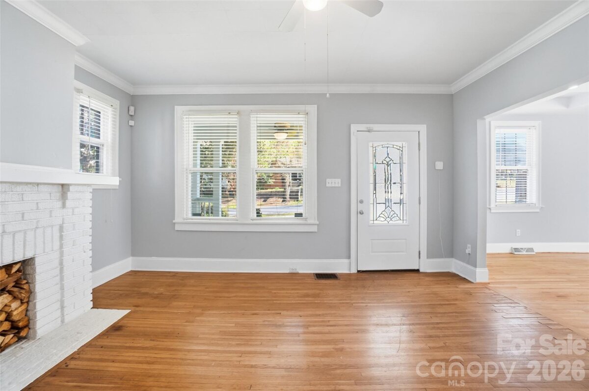Charming bungalow in the highly desirable Historic Wilmore neighborhood. Move-in ready 3 bedroom, 2 bathroom home located minutes from Southend, NODA, Uptown, restaurants, shopping, parks, and more! Welcome your guests on the inviting front porch. As you step inside, you’ll find a cozy living room with original hardwood floors and fireplace. The adjacent family room boasts a coffered ceiling and hardwoods, with a convenient kitchen pass-through facilitating effortless entertaining. Bask in the natural light filled kitchen with a bay window in the dining area and French doors leading out to the deck, ideal for outdoor gatherings. The kitchen features new LVP flooring, quartz countertop and stylish subway tile backsplash. The interior has been freshly painted a neutral color throughout. The primary bedroom includes the added comfort of an ensuite bathroom, while secondary bedrooms offer serene views of the tranquil backyard. The 958 sq ft unfinished basement presents endless potential and has been fully waterproofed with a lifetime warranty and structurally reinforced in 2025. Seller improvements: HVAC and Invisible Fence (2023) Roof (2024) Hot water heater and Breaker Box (2025), Vinyl Siding (2026) Non- functioning fireplace sold as is. 3 gravel parking spaces.