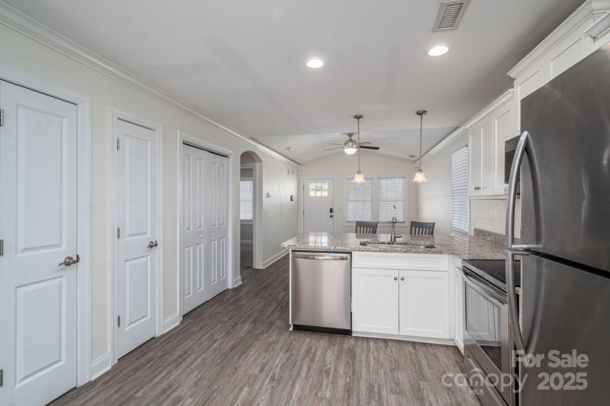 This move-in ready ranch in the heart of Hickory offers low-maintenance living just minutes from everything. Built in 2021, the home features two bedrooms, one bathroom, and a layout that makes the most of its space. The open layout connects the living room, kitchen, and dining area, creating a comfortable and functional flow. The kitchen includes granite countertops, stainless steel appliances, and a breakfast bar, ideal for quick meals or casual conversation. The bathroom offers a dual-sink vanity and connects to both the main living area and one of the bedrooms for a semi-private, en-suite feel. Vinyl and stone siding adds to the home’s easy upkeep, and the 0.09-acre lot keeps yard maintenance simple without giving up outdoor space. A back patio provides a nice spot to relax or entertain. Located just minutes from local schools, shops, and restaurants, you’ll appreciate the easy access to Hickory’s best amenities. Enjoy nearby parks, Lake Hickory’s outdoor adventures, and downtown attractions, all within a short drive. Whether you're looking for your first home, downsizing, or just want to be close to dining, shopping, and city parks, this house offers convenience without the hassle of an HOA.
