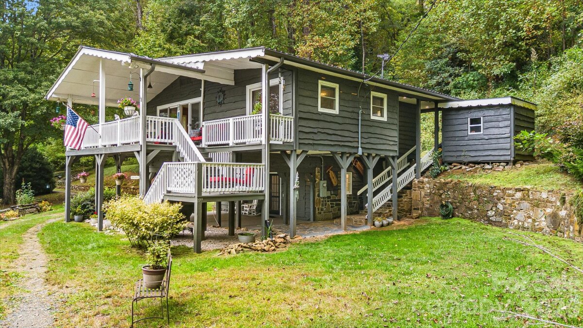 Introducing a secluded estate with long range views - nestled in the heart of the coveted Little Switzerland community, this one-of-a-kind storybook cottage offers unparalleled blend of rustic elegance, privacy, in a neighborhood that has direct access to the Blue Ridge Parkway. This wood and stone residence is a sanctuary designed for those who appreciate authentic craftsmanship and serene mountain living. This home exudes warmth and character from the moment you arrive. Enjoy ever changing, breathtaking vistas of the Blue Ridge Mountains from multiple vantage points throughout the property. Situated on a 2 private, park like acres with level ground, this estate offers both seclusion and walkable access to the Blue Ridge Parkway for endless hiking and exploration. Multiple outdoor spaces include a sturdy deck perfect for sunrises, a stone patio for evening gatherings, and tranquil spots throughout the level property to immerse your self in nature. There are two bedrooms, each with its own private ensuite bathroom. A highly sought after feature, there is a separate bedroom and bathroom, accessible only from the outside, offering ultimate privacy for guests or a home office. The open living area features knotty pine paneling, large windows that frame magnificent views, creating a cozy yet expansive atmosphere. The is is a rare opportunity to own a piece of Little Switzerland magic. A home that feels a world away, yet is just a short walk from one of America's most scenic drives. This house is immaculately maintained! Please note -this neighborhood does not allow short term rentals BUT it does high high speed fiber-optic cable!