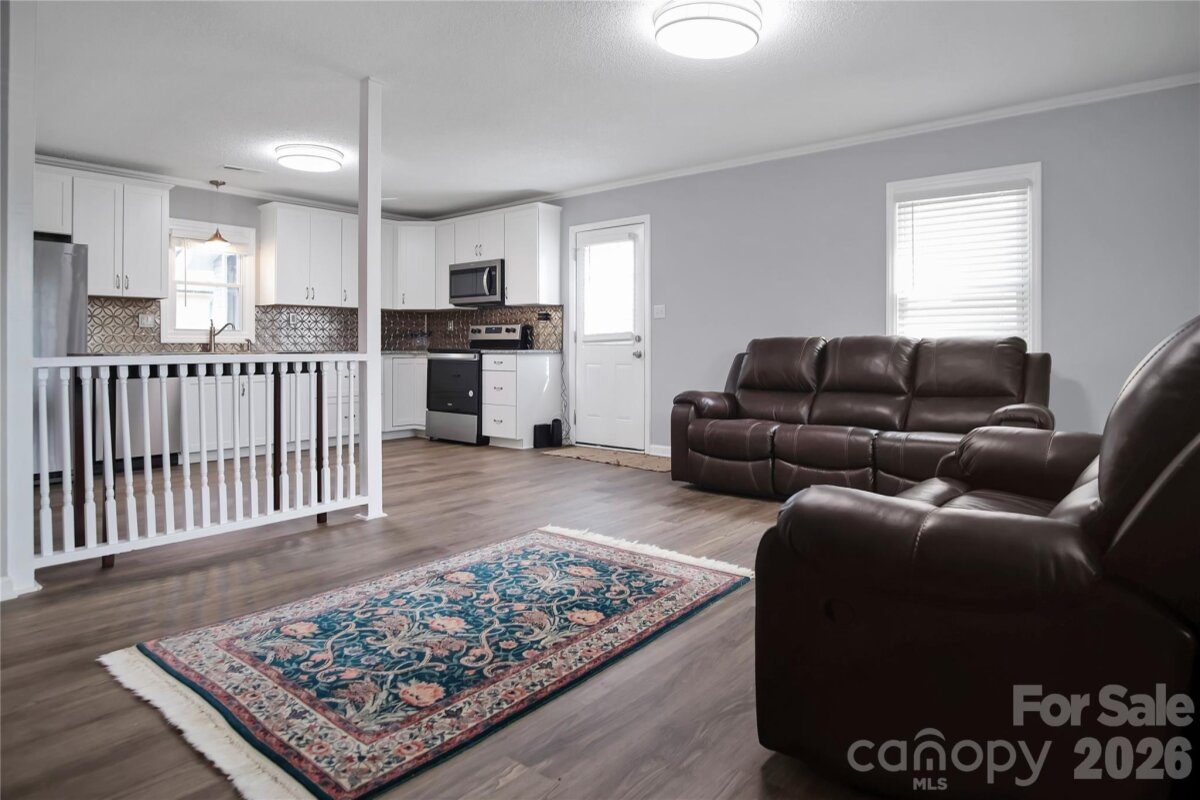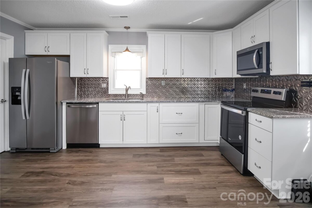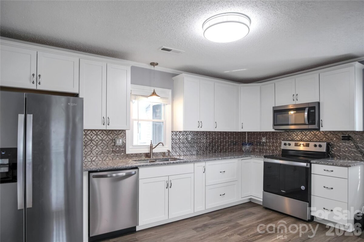 Discover charm and modern comfort in this brick ranch on a corner lot in Shelby! This 2-bedroom, 1-bathroom gem was completely remodeled in 2022 & boasts a stylish living room, a sleek kitchen with granite countertops, white cabinets, and stainless steel appliances, including a electric range, dishwasher and mounted microwave. The laundry room off the kitchen also features shelves to use as a pantry. Outside, has an outdoor storage room and a concrete driveway. Embrace the perfect blend of classic and contemporary living in this inviting home!