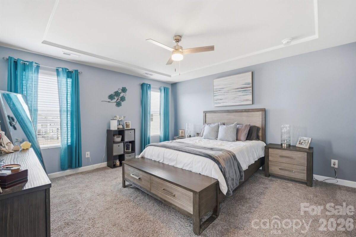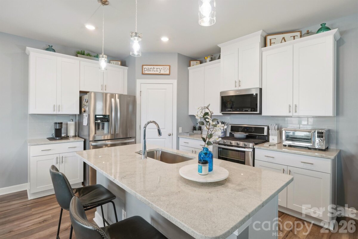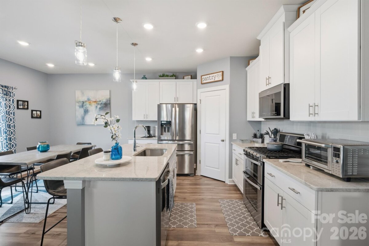 Welcome home to this beautifully maintained, energy-efficient 2021 Meritage Homes residence in the sought-after Larkhaven Hills community! This move-in-ready two-story home offers 3 bedrooms, 2.5 bathrooms, and 1,887 sq ft of open-concept living on a quiet cul-de-sac with one of the neighborhood’s longest driveways—easily fitting 4+ cars. Inside, the bright, open main level is perfect for everyday living and entertaining. The gourmet kitchen features white/gray granite countertops, a large island, a walk-in pantry, and modern finishes. Upstairs, you’ll find a spacious primary suite with dual sinks, a walk-in shower, and generous closet space, plus two additional bedrooms, a full bath, and a versatile loft ideal for a home office, play area, or bonus space. Modern touches include durable EVP flooring, plush multi-tone carpet, and thoughtful upgrades throughout. The 2-car garage offers built-in overhead storage, and the low-maintenance newer construction means more time to enjoy life. Added peace of mind comes with the HomeTeam Pest Defense in-wall system (exterior treatment injected directly into the walls) and a transferable termite bond. Residents love the community amenities—clubhouse, outdoor pool, playground, sidewalks, street lights, and walking trails. Much of the home’s furniture throughout and appliances (refrigerator, washer, and dryer) are available for sale (to be negotiated separately). Conveniently located on the edge of Mint Hill with quick I-485 access, you’re minutes from downtown Mint Hill, Charlotte shopping/dining, parks, and major employers. This home offers comfort, convenience, and value in a family-friendly neighborhood. Don’t miss your opportunity—schedule a private showing today!