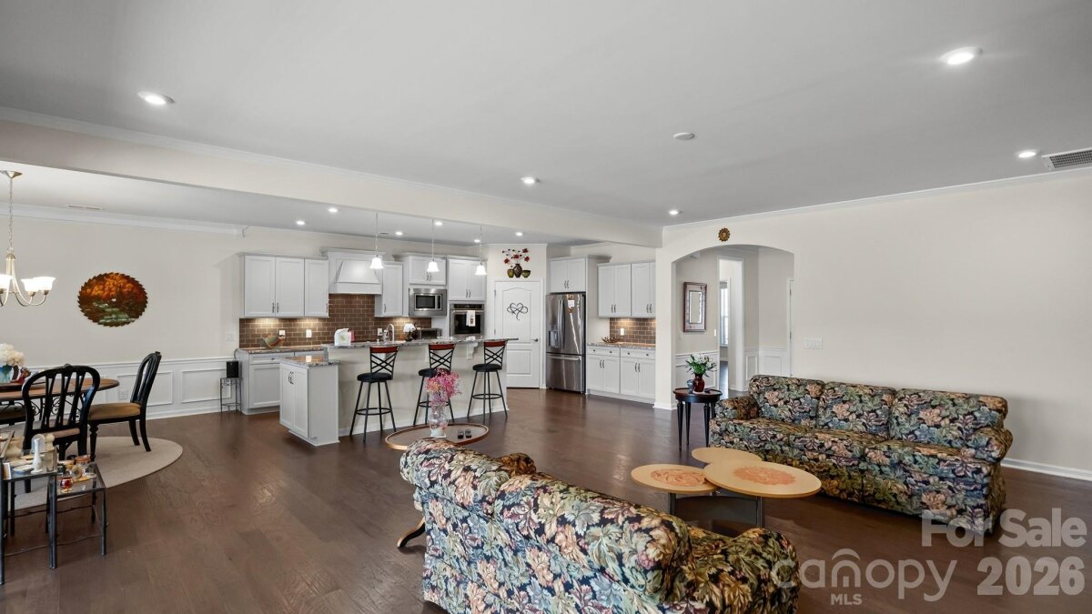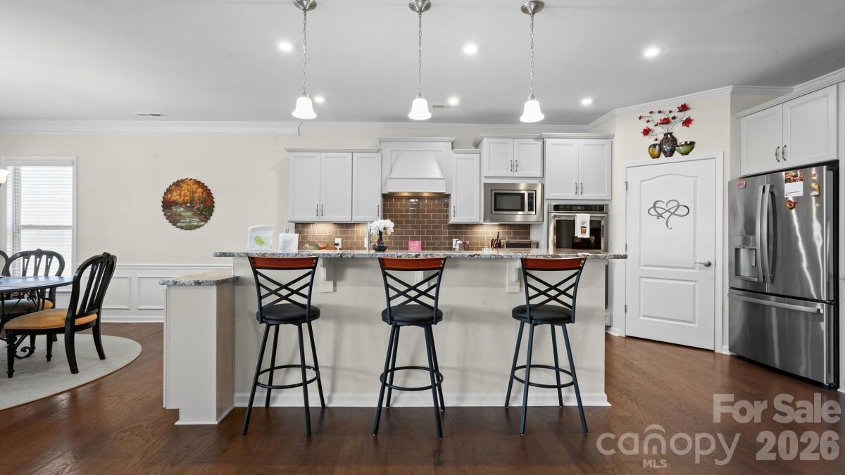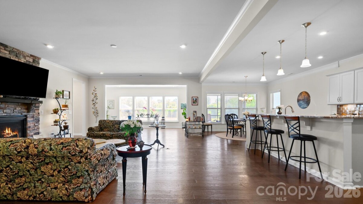 Much sought-after Dunwoody Way. 3 Bedrooms and 3 Full Baths. Sunroom leading out to your Screen Porch overlooking your back yard. Beautiful, level, landscaped fenced yard. Gourmet Kitchen with stainless KitchenAid appliances that include double ovens, microwave, gas cooktop with a direct vent hood, FARM SINK, soft close cabs, pull-outs, under cab lights. Thee is a true dedicated front office w/French doors for privacy. Your Great Room with stone fireplace & raised hearth is ready for entertaining. Your Primary Bedroom features a tray ceiling and overlooks your back yard. Your Primary Bath has a walk-in spa-like shower and walk-in closet with custom shelving. An extensive trim package and tile and engineered hardwood flooring throughout - no carpet. Laundry Room is complete with built-in cabinets, sink + drop zone - all leading to a 2 car + 4' extended garage with walk up attic storage. The Garage door has windows to let in the natural light and a keypad entry, and a tankless water heater. There is radiant barrier sheathing in the attic for energy efficiency. AMENITIES include: 8 lit pickleball courts, 4 lit tennis courts, indoor/outdoor pools + hot tubs, 2 bocce courts, dog park, event lawns, grandkids play area, fitness center, aerobics room, ball room, meeting + club rooms. Full Time Activities Director. Come join us in the Orchards. Great people + amazing amenities = the perfect place to call home.
