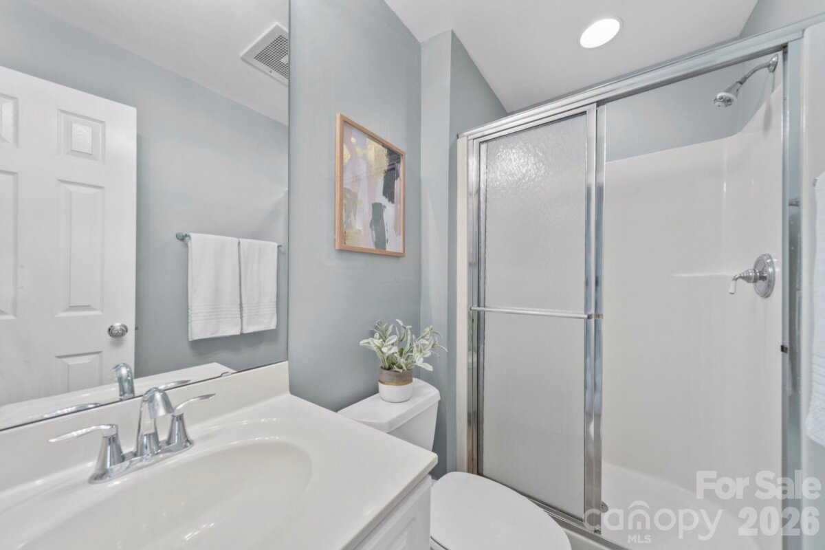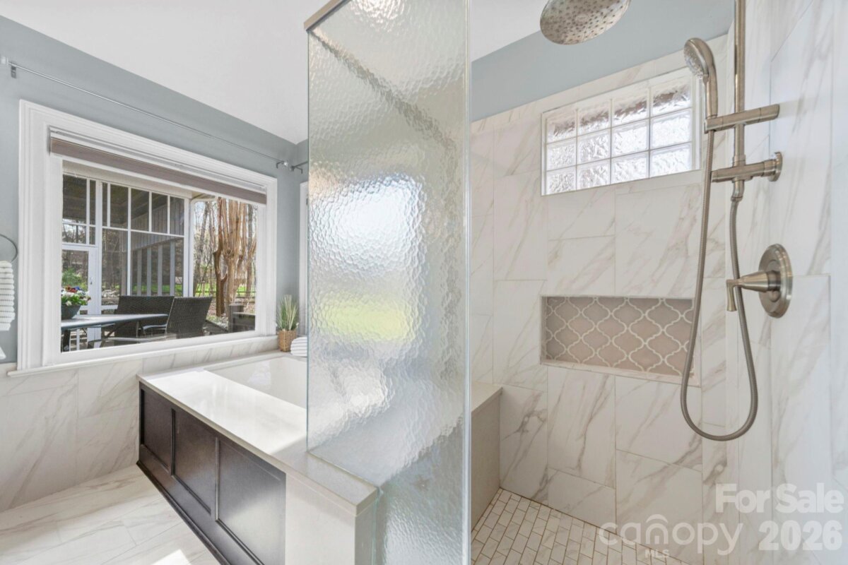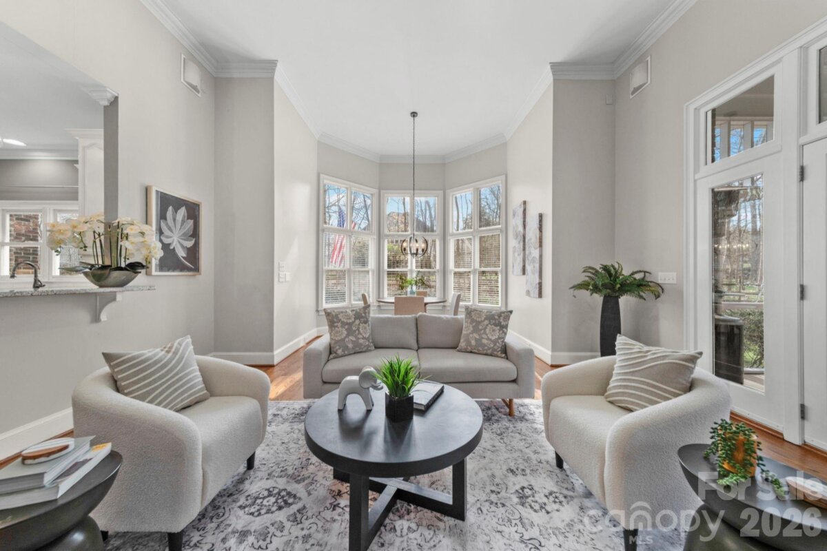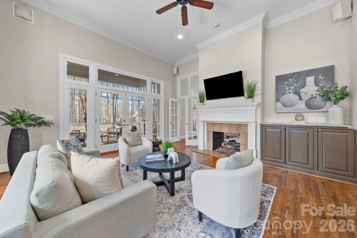 Tucked among mature trees of desirable Walden Pond, this elegant brick home delivers over 3,700 square feet of beautifully designed living space where natural light pours through soaring windows and vaulted ceilings. Inside the hardwood floors guide you into a two story great room centered around a warm dual fireplace and dramatic wall of windows overlooking the wooded backyard. The kitchen is where life gathers. Granite countertops. Backsplash. Stainless steel appliances. A large island with gas cooktop. Plenty of room for cooking, conversation, and connection. Morning coffee in the breakfast area surrounded by bay windows adjoining a central keeping room. Evenings on the screened porch. Weekend dinners with friends on the deck surrounded by quiet trees. The main-level primary suite offers a peaceful retreat with a spa-inspired bath featuring dual vanities, a soaking tub, walk-in shower, and custom cabinetry. The dedicated office offers a private entrance off the side porch. Upstairs, spacious bedrooms and additional living space provide flexibility for guests or growing families. A three-car garage, long driveway, and beautifully landscaped yard complete the picture. For buyers seeking a balance of elegance, space, and privacy, this property stands apart.
