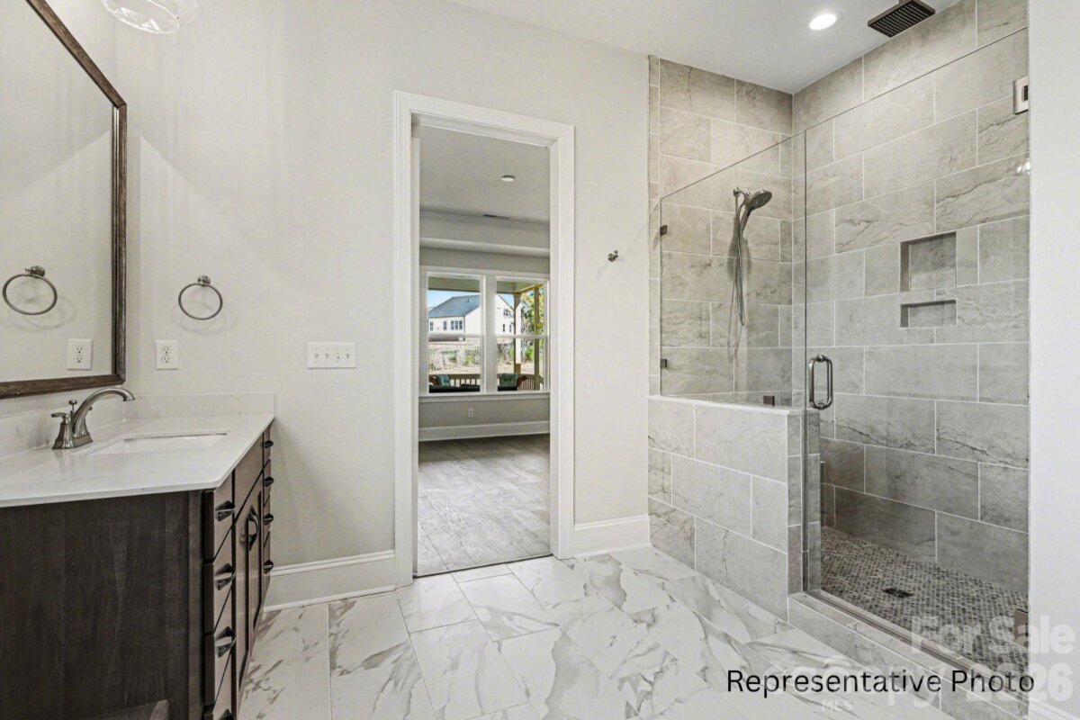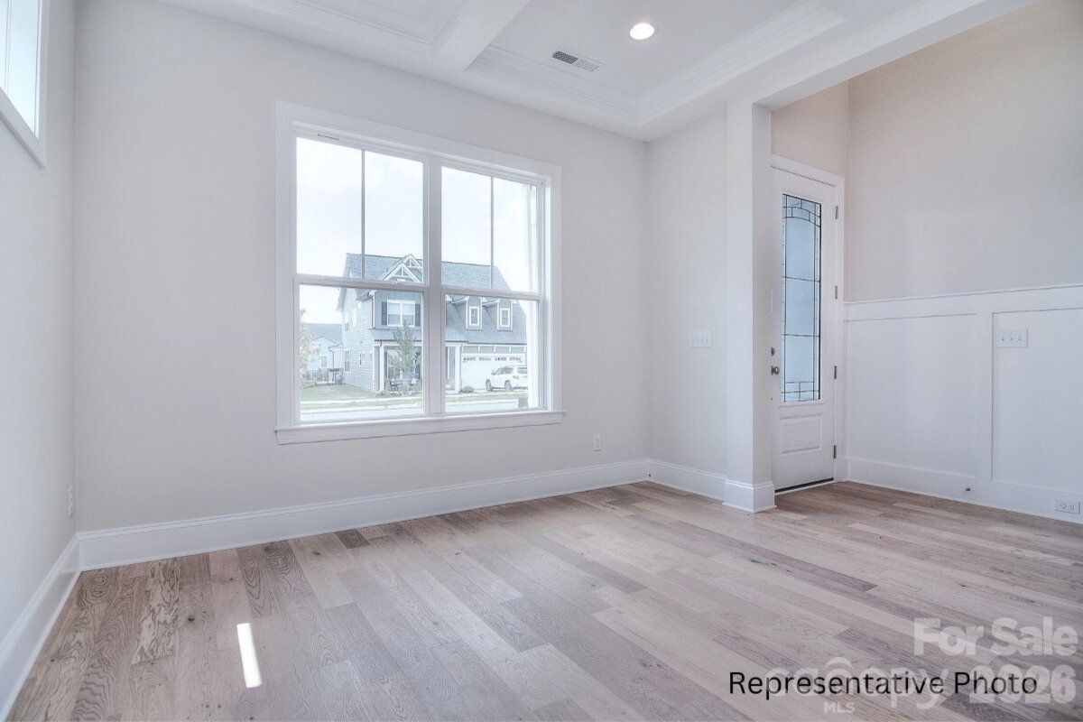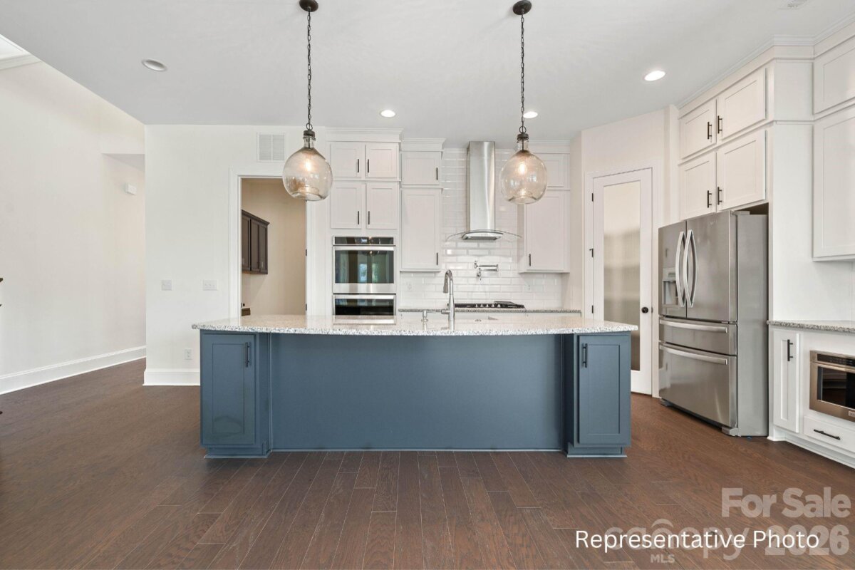 This stunning new construction home in Cornelius, 4 months from completion, offers a prime location just minutes from both Downtown Cornelius and Downtown Davidson, nestled within an exclusive cul-de-sac enclave of only five new homes. The 4-bedroom, 3.5-bath layout features a highly desirable primary suite on the main floor and a floor plan that truly elevates open-concept living. The gourmet kitchen showcases floor-to-ceiling cabinetry, quartz countertops, and a large island, flowing seamlessly into the dining area and onward to the spacious family room with its coffered ceiling and modern fireplace. A covered rear deck extends the living space outdoors. The main-level primary suite includes a tray ceiling and a luxury bath with dual vanities, a walk-in tiled shower, and a generous walk-in closet. Hardwoods run throughout the first floor, including the primary suite, with tile in the bathroom. Upstairs, a large loft provides flexible space ideal for a game room, exercise area, media lounge, or other entertainment needs, along with an additional workstation area. The exterior is beautifully finished with black windows and gutters, and rough-sawn cedar stained columns, creating a striking and modern curb appeal. Photos are artist renderings and/or representative of previous build and some details may differ. Photos may show some items not scheduled for this property but may be available as upgrades depending on date of contract. Depending on contract date, there may be time to make some selections. ACT NOW TO MAKE AS MANY SELECTIONS AS POSSIBLE! Please verify selection availability with builder representative.