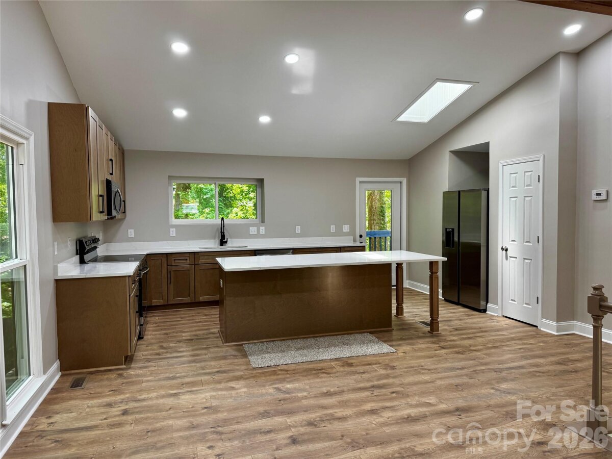 There is so much to love about this beautiful home in Fort Mill with NO HOAl!! With a unique split level design and vaulted ceilings, this home features an open, bright floorplan and a brand new kitchen with all new cabinets, quartz counters and appliances! The roof, gutters, windows and doors have also all been replaced in the past year, and the flooring and bathrooms are also recently renovated. The main level features new recessed lighting, beautiful LVP flooring, a stunning stone wood-burning fireplace, fresh neutral paint, a primary suite, two additional bedrooms and a hall bath. The lower level features a large bonus room with a kitchenette, a fourth bedroom, and a full bathroom with a laundry area. The 0.40 acre lot is fenced and backs to woods for tons of privacy. The quiet community is just minutes from everything in Fort Mill, including the Anne Springs Close Greenway, shopping and restaurants, and is an easy commute to Charlotte. Zoned for highly rated Fort Mill Schools and low SC taxes! Don't let this beautiful home get away!