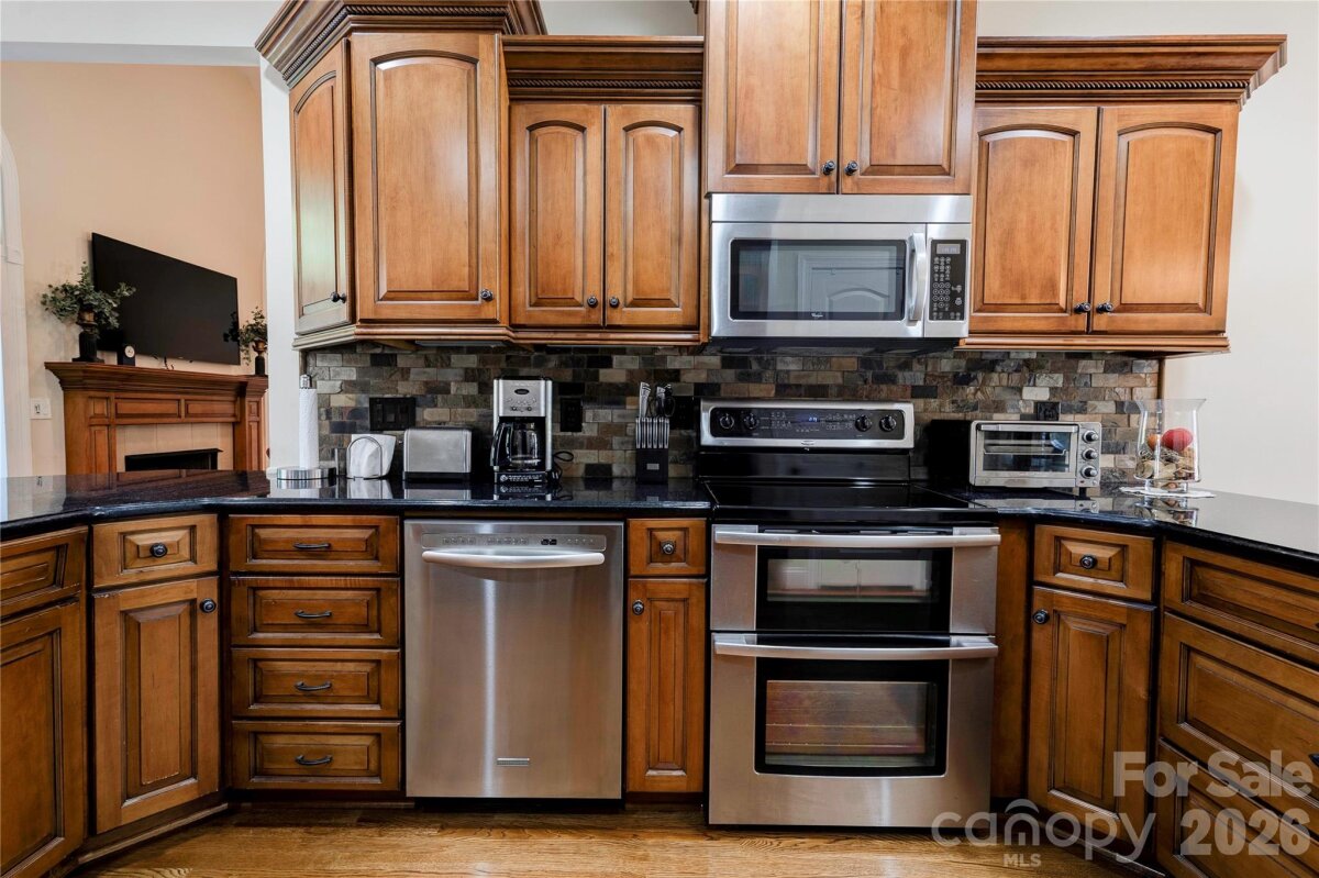 Gorgeous 3BR 2.5BA brick home on a corner lot in The Pointe subdivision near Moss Lake. This home has it all! Gleaming hardwoods. Vaulted ceilings & all others are 9'. Granite countertops. LR has vaulted ceiling & gas log fireplace. Custom kitchen with stainless appliances, granite counters pantry, breakfast bar & brick-like backsplash. Breakfast area & formal dining room with trey ceilings. Split bedroom plan. Large primary suite has vaulted ceiling, sitting area, huge walk-in closet, granite dual vanity with make-up desk, soaking tub, tile walk-in shower & water closet. Large laundry room with overhead cabinets & fold-down ironing board. Spacious office with vaulted ceiling. Bedrooms 2 & 3 each have walk-in closet & share a jack-n-jill bath with tile walk-in shower & granite counter tops. Large sun room has tile flooring & beaded board vaulted ceiling. Huge bonus room has a large walk-in closet and attic access. Home has a covered front porch (with tile floor), rear deck, rear patio & oversized triple garage. Main level of home has gas heat & the upper level bonus room has a heat pump. There are 2 electric water heaters. Home has a central vacuum & a security system. Refrigerator, washer, dryer, and living room TV remain. This home is truly a MUST SEE! Come make this your new DREAM HOME.