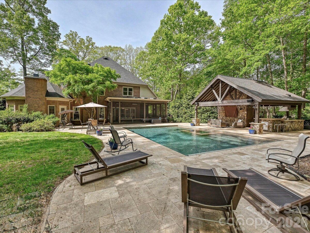Tucked away on over an acre in lovely Walden Pond, this full brick custom-built home offers a rare blend of timeless elegance and resort-style living. From the moment you arrive, the home invites a sense of retreat. Mornings begin in the main-level primary suite with a cozy fireplace and sitting area, and natural light fills thoughtfully designed, beautifully appointed spaces, ideal for both quiet moments and entertaining. At the heart of the home, the gourmet cook’s kitchen showcases nice quartz countertops (2022) and striking leathered marble countertops on the island and built-in hutch and professional appliances. Paired with a sunlit breakfast room, this space is designed for everything from relaxed mornings to effortless gatherings. Upstairs, expansive and versatile living areas offer endless possibilities for a private theater, fitness studio, or recreation retreat. The true showpiece lies outdoors. A stunning backyard oasis features a saltwater pool and hot tub with new travertine surround and retractable cover (2025), complemented by a beautifully crafted stone cabana complete with outdoor kitchen, creating the ultimate setting for relaxing and entertaining. Evenings unfold on the spacious screened porch with skylights, infrared heaters, and a retractable movie screen, seamlessly blending indoor comfort with outdoor luxury. With a new architectural roof covering on both the home and cabana (2025), a private fenced backyard, and a prime location just minutes from Waxhaw, Marvin, and Ballantyne, plus highly sought-after Marvin Ridge schools, this exceptional property delivers an elevated lifestyle defined by comfort, privacy, and refined living.