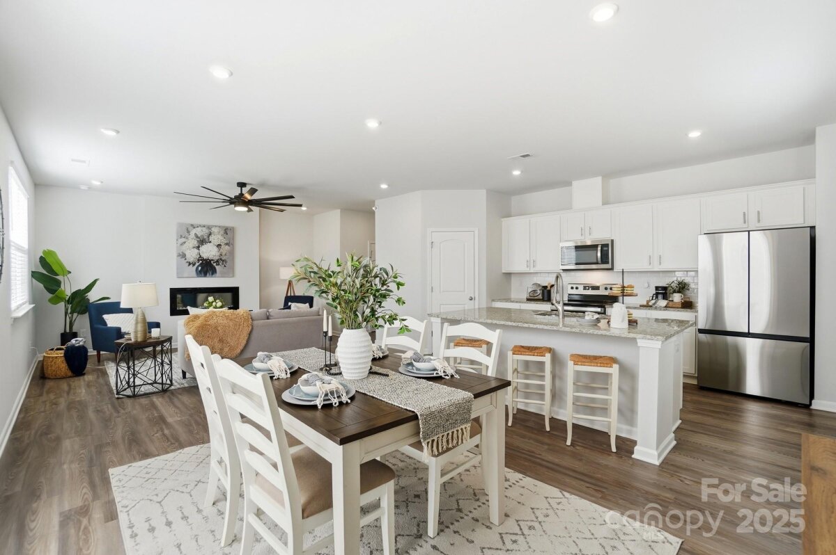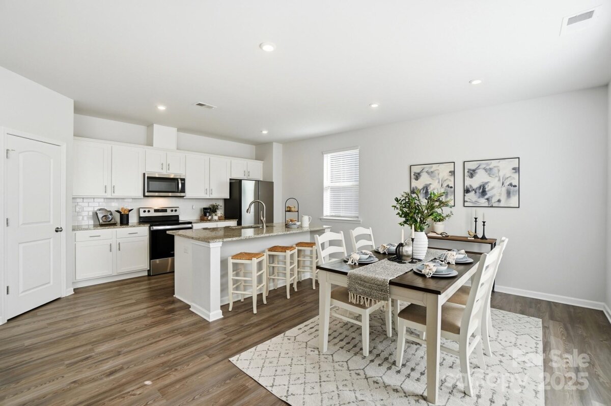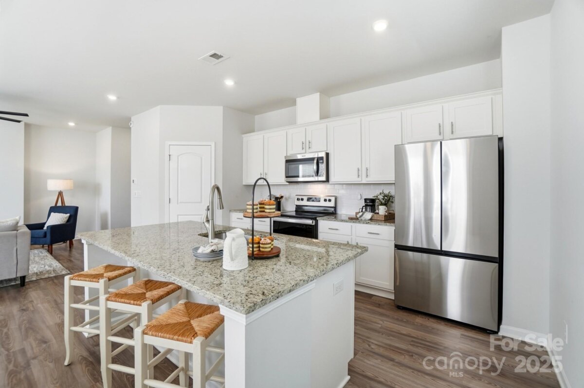 Welcome to this nearly new home in the sought-after Blue Sky Meadows community, where modern style meets the warmth of home. Just two years young, this beautiful home feels fresh, bright, and move-in ready. The rare four-bedroom version of the Kephart floor plan offers plenty of room to grow and live comfortably, with thoughtful touches throughout. Ideally located just minutes from the Highway 74 Expressway, it offers easy access to Uptown Charlotte—perfect for a quick commute or a night out in the city. Step inside and you’ll immediately notice the open, airy layout with wide hallways and 9-foot ceilings. The heart of the home is the bright, inviting kitchen, featuring white shaker cabinets, stainless steel appliances, quartz countertops, and an oversized island that’s perfect for family gatherings or casual entertaining. Durable LVP flooring flows seamlessly through the main living areas. Upstairs, you’ll find four spacious bedrooms, two full baths, and a convenient laundry room—all designed to make daily life easy. Outside, enjoy a large, tree-lined flat backyard, offering privacy and a peaceful setting for play or relaxation. Smart home features with cameras & thermostat bring the ease of technology. Blue Sky Meadows residents love the community’s resort-style amenities, including a sparkling pool, cabana, walking trails, playground, dog park, and pavilion. With its ideal layout, modern finishes, and welcoming neighborhood vibe, this home has everything you’ve been hoping to find—and more.