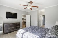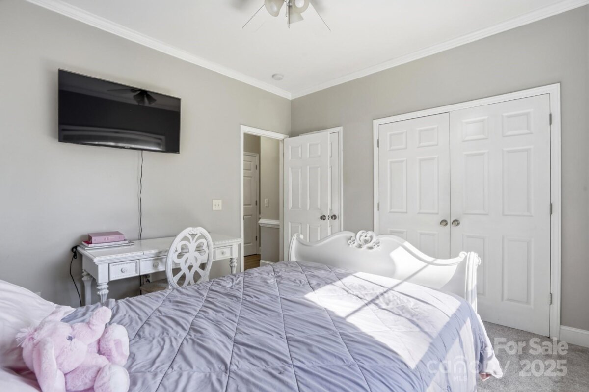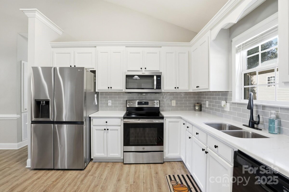 Welcome to your beautifully updated and meticulously maintained home! Step inside to find a fresh, neutral color palette that creates a bright and inviting atmosphere throughout. The open-concept living space seamlessly connects the kitchen and living room, highlighted by vaulted ceilings that add a sense of space and elegance. The kitchen has been thoughtfully upgraded with brand-new quartz countertops, a modern sink, and freshly painted cabinets adorned with stylish new hardware perfect for both everyday living and entertaining guests. The split floor plan offers privacy and comfort, ideal for families or guests, while crown molding adds a refined finishing touch to the home’s aesthetic. This home offers a serene lifestyle with quiet surroundings, making it the perfect retreat after a busy day.