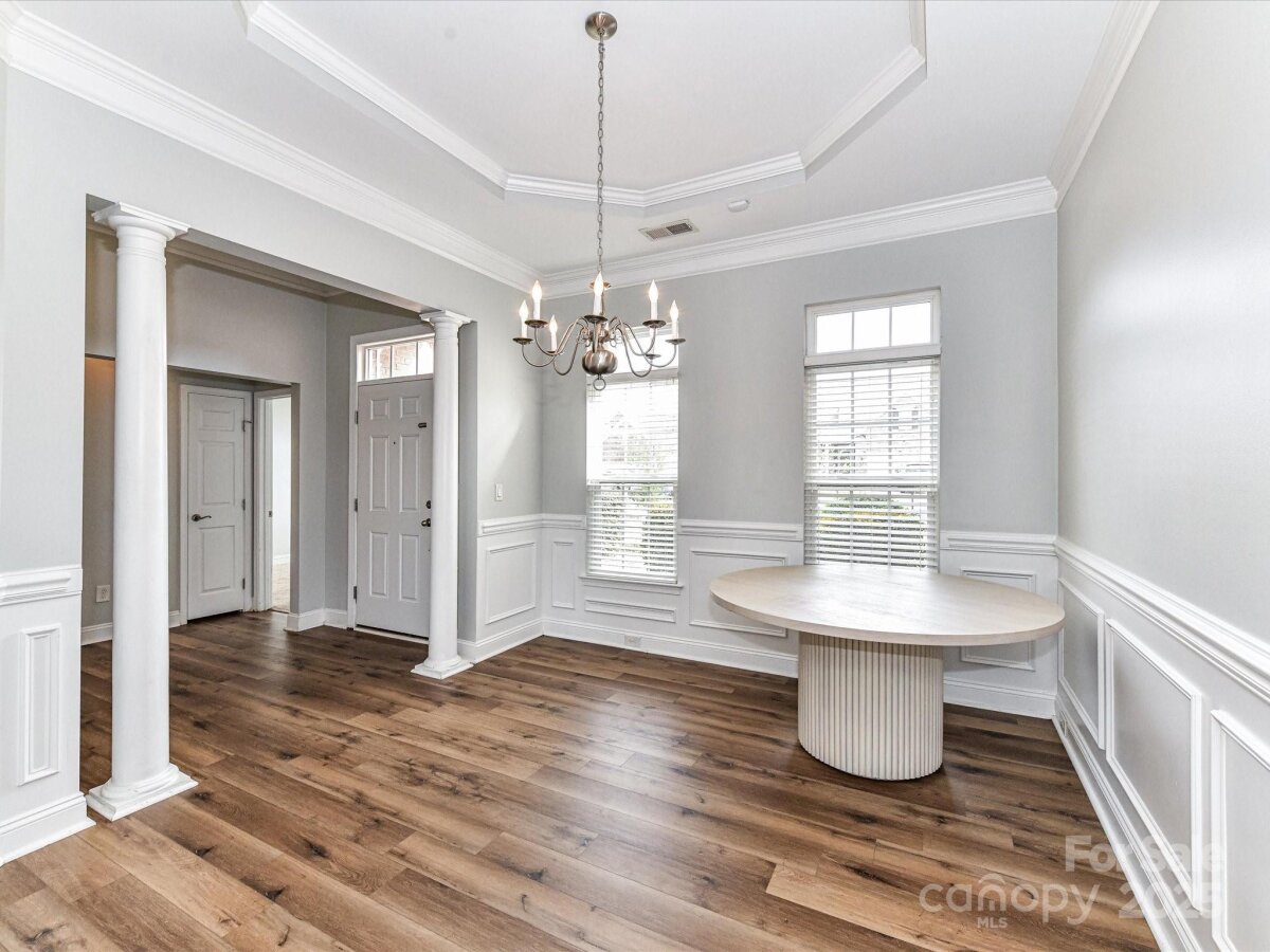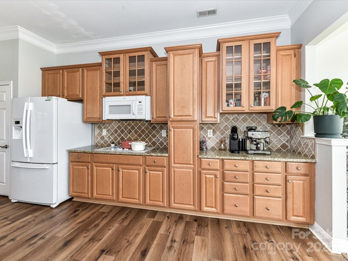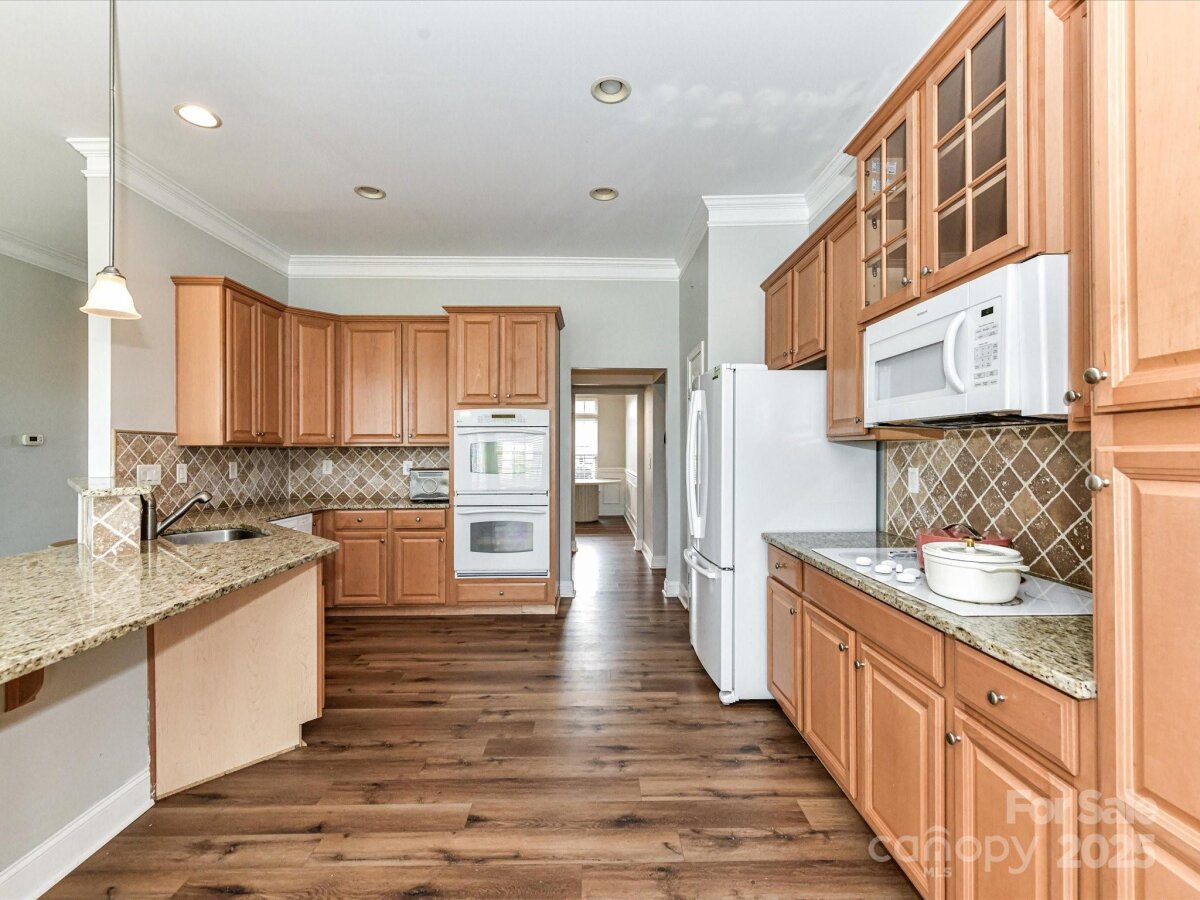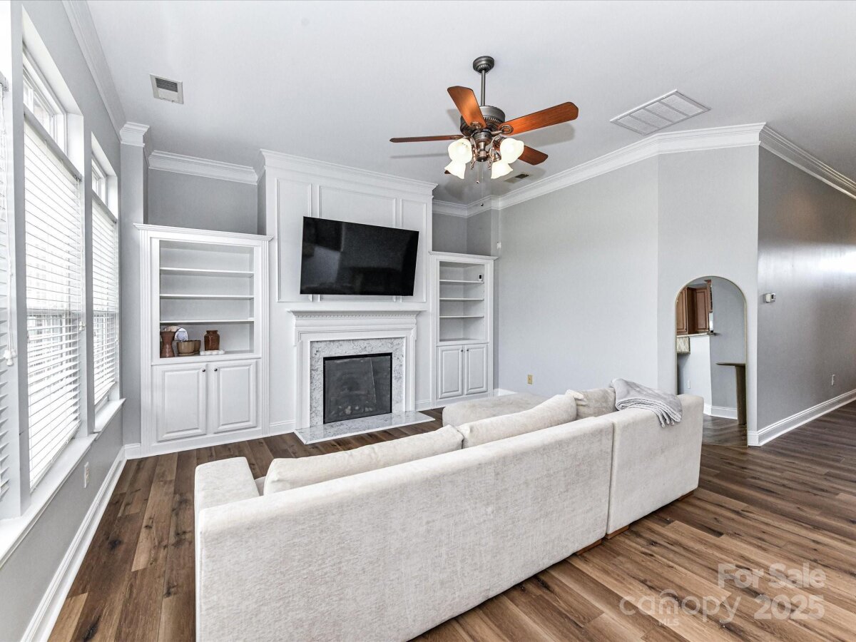 Beautifully maintained brick home on a quiet cul-de-sac street with a brand new roof in June 2025. When you enter you will find newer laminate wood floors and crown molding that flow through the home. The formal dining room to the left of the foyer has a tray ceiling, decorative columns and extensive moldings. The large open living room has built in bookcases on both sides of the gas fireplace and tons of windows letting in tons of natural light. The kitchen features granite counter tops with an attached island that is great for extra seating, 42" cabinets, tile backsplash and views into the sunroom that leads to the rear patio and yard. The split floor plan has the large primary bedroom in the rear of the home that has a tray ceiling and a private bathroom with dual sinks, soaking garden tub, separate shower and walk in closet. The laundry room with cabinets for storage and a sink is right outside the primary bedroom. 2 spacious secondary bedroom, one with vaulted ceiling, and a full bathroom are also located on the main level just off the foyer. Upstairs you will find another bedroom that has access to a full bathroom and a large bonus/media room with attic access for extra storage. The finished oversized 2 car garage also has a pedestrian door that leads out to the side of the house. Relax or entertain on the rear extended patio and back yard. The landscaping for this home is all included in the HOA dues so there is no need to worry about lawn care. The community also has a pool and playground. Great location in a very poplar subdivision close to everything.