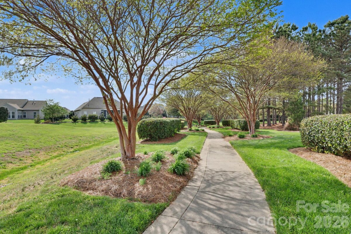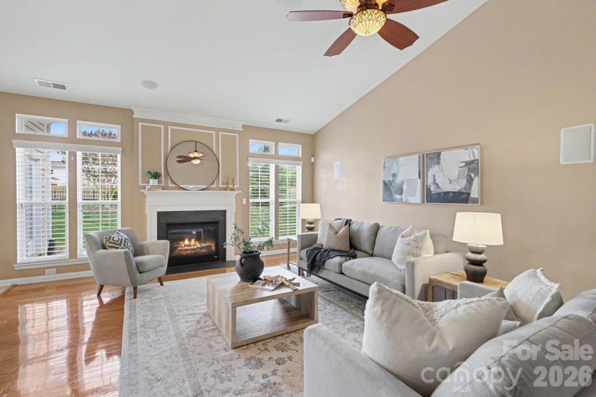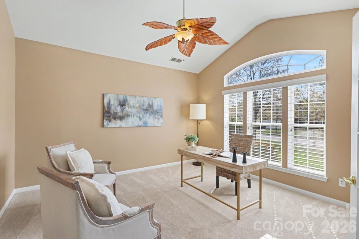 Charming home with inviting curb appeal and a covered front porch, offering a perfect blend of comfort and thoughtful design. The foyer opens to a spacious office with French doors and brand-new carpet. A formal dining room features a trey ceiling, crown molding, wainscoting, decorative columns, and transom windows, creating an elegant space for gatherings. Natural light fills the home through transom and palladium windows, highlighting wood floors, 9’ ceilings, and 3†blinds throughout the main living areas. The great room offers a cozy gas log fireplace with picture molding, while the kitchen is well-appointed with tile floors, abundant 42†cabinets with ShelfGenie pull-out trays, gas cooktop, wall ovens, pantry, coffee bar, and breakfast bar seating. The primary suite features a trey ceiling, new carpet, and a spa-like bath with tile floors, double vanity, tiled shower, and American Standard RevitaJet walk-in tub, plus large walk-in closet with Elfa shelving. The split-bedroom floor plan provides privacy, with secondary bedrooms on the opposite side—each with new carpet, and one with Elfa shelving. The laundry room has a folding table and utility sink. Home includes accessibility features—wide doorways, support bars and minimal-step entry. Enjoy outdoor living with a powered Marygrove awning and nicely landscaped, fenced yard—perfect for relaxing or entertaining. Community amenities include a clubhouse, walking trails, and lawn maintenance for easy living!