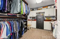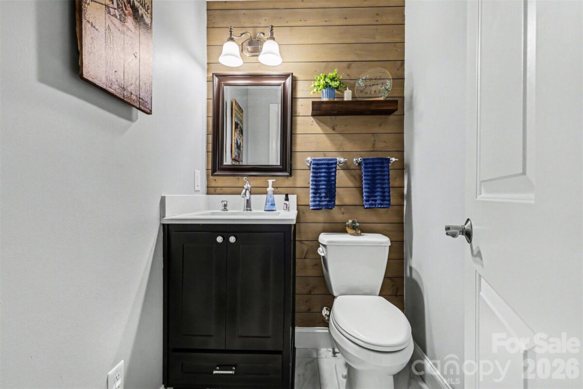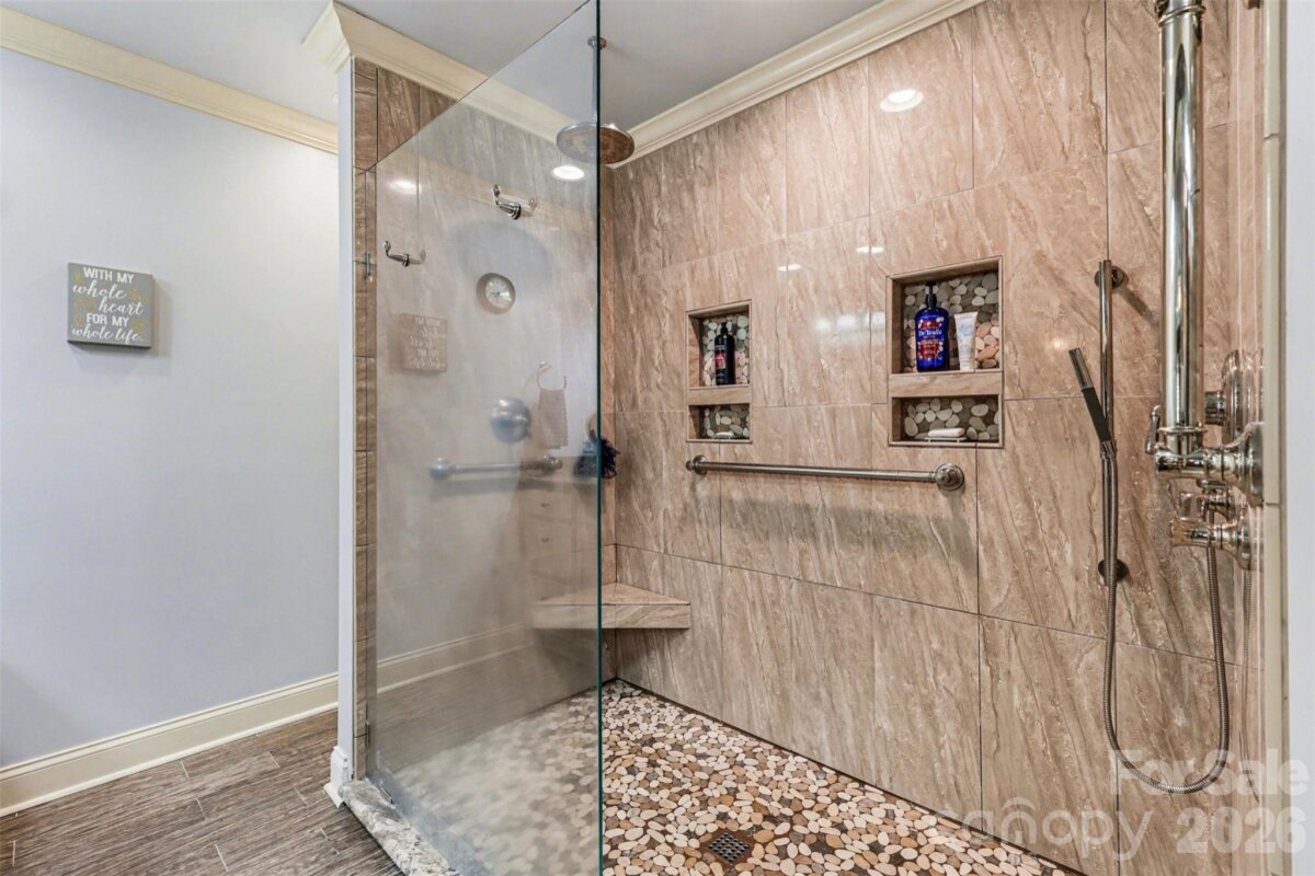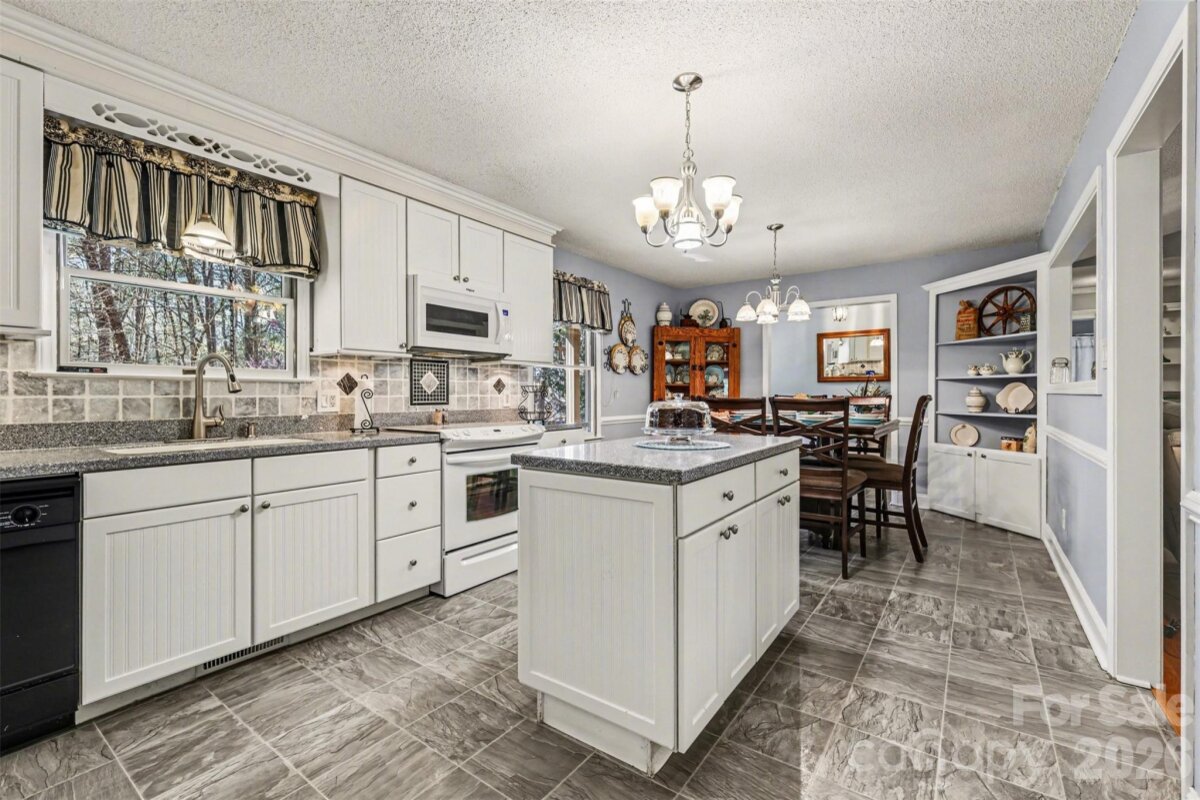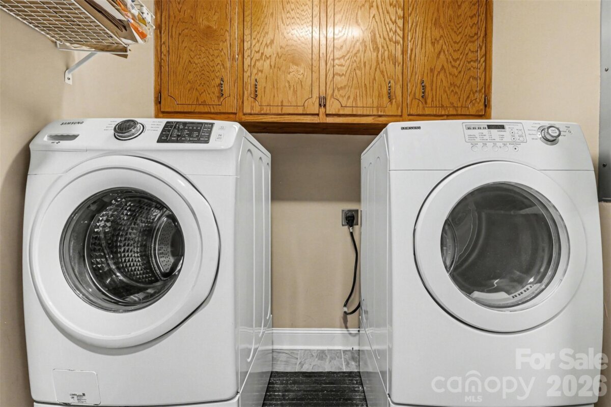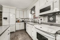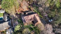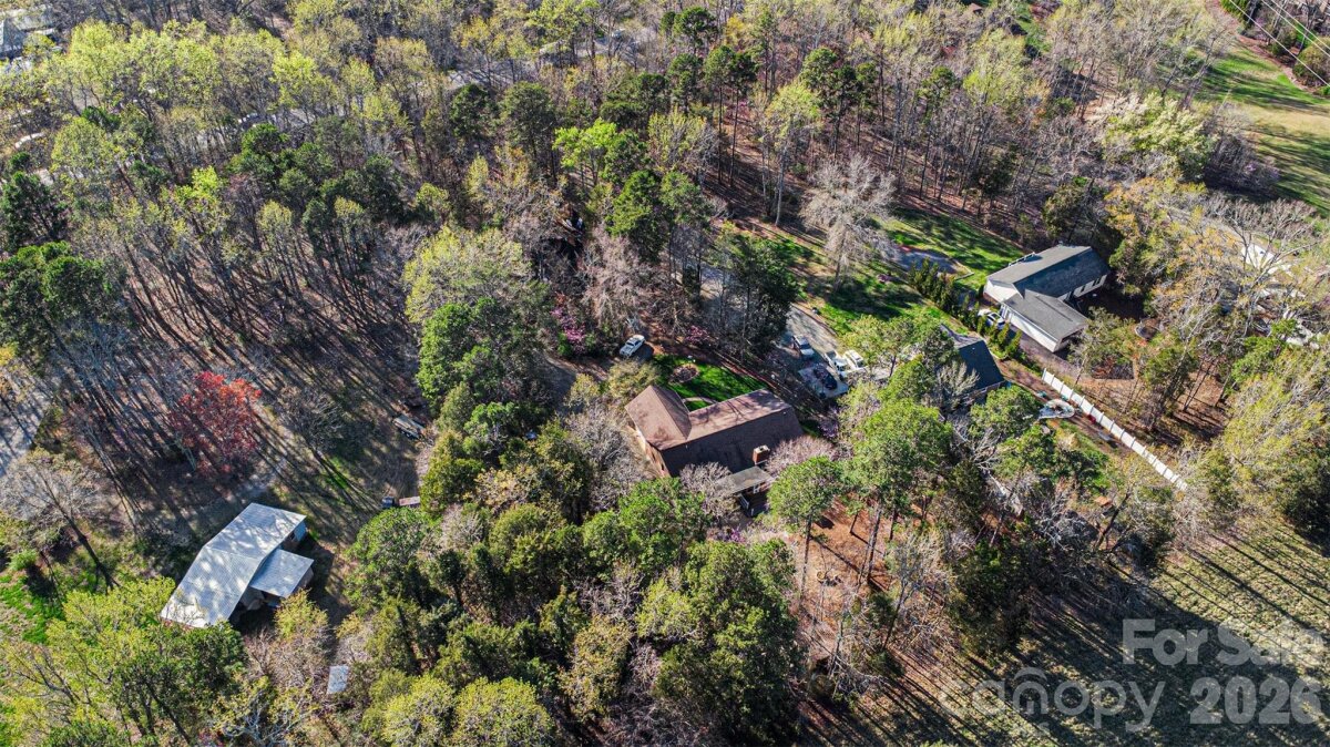 This beautiful cedar and brick ranch is tucked back on a wooded 1.3-acre lot, offering privacy and a thoughtfully curated landscape with a blend of lush lawn, hardscaping, and flowering trees, shrubs, and plants designed to provide a rotating display of seasonal blooms. Inside, the home is full of charm with fresh paint, lovely built-ins, and custom touches throughout. The kitchen features an island, white cabinetry, tile backsplash, pantry, and included appliances, and opens to the dining area with a built-in corner cabinet. The spacious great room showcases a vaulted ceiling and a wood-burning fireplace with stone surround and wood mantle. The very spacious primary suite serves as a relaxing retreat with a wood accent wall, a large bath featuring a stunning custom shower, dual vanities, and a built-in linen cabinet, along with an expansive closet complete with a built-in system, storage cabinets, and a safe that conveys. Two additional bedrooms, a full bath, a beautifully updated half bath, and a large laundry closet with washer and dryer included complete the interior. A long sunroom spanning much of the rear of the home provides year-round enjoyment of the surrounding views. Outdoor living is equally impressive with a rocking-chair front porch, covered back deck, large Trex-style deck, hot tub, patio, fire pit, and fenced backyard, all surrounded by mature landscaping and wooded privacy. The oversized 2-car garage includes some raised storage platforms around the perimeter. Ample space for hobbies, workshops, and storage with a 24x32 barn, 357 sq ft outbuilding, and 12x8 shed. Located in the Mooresville Graded School District, this property offers peaceful country living with convenient access to Mooresville and Concord, as well as I-77 and I-85.
