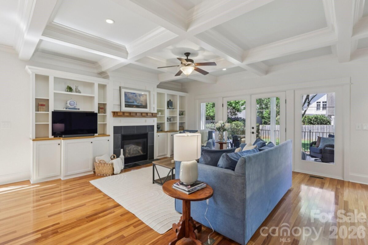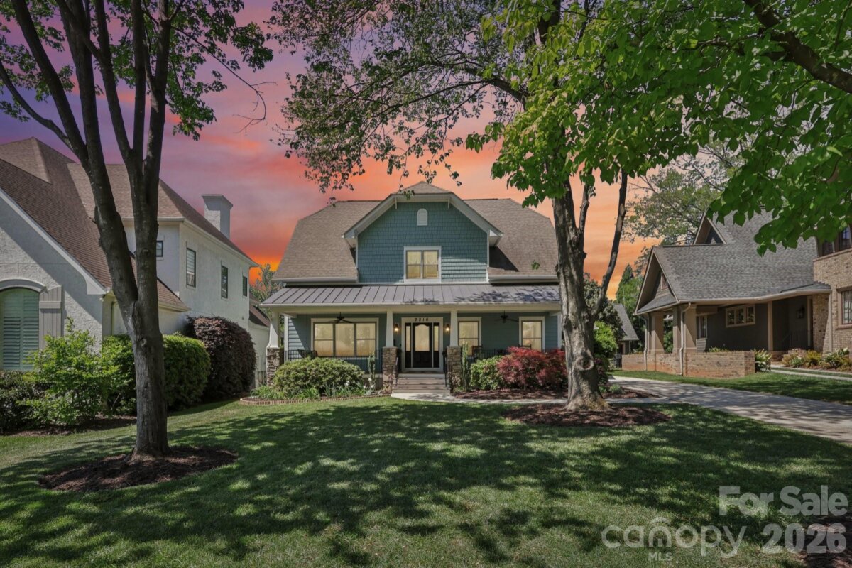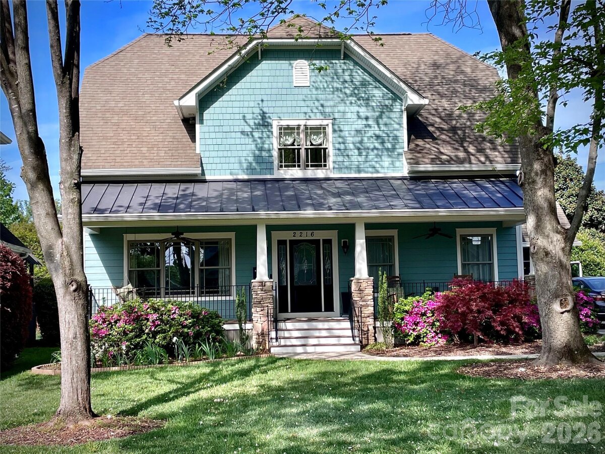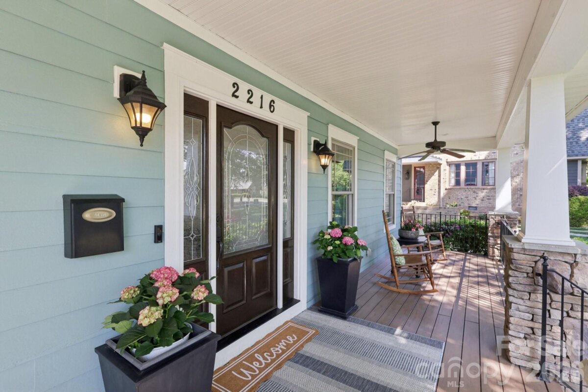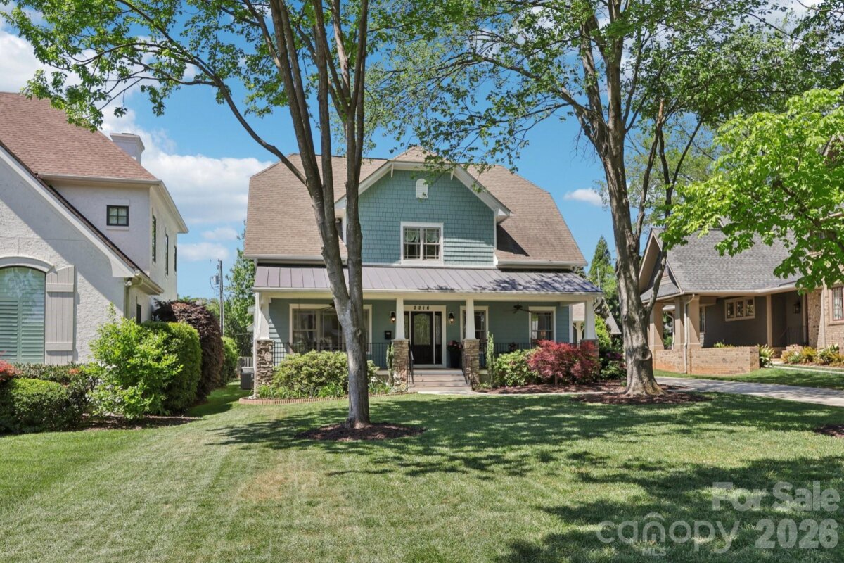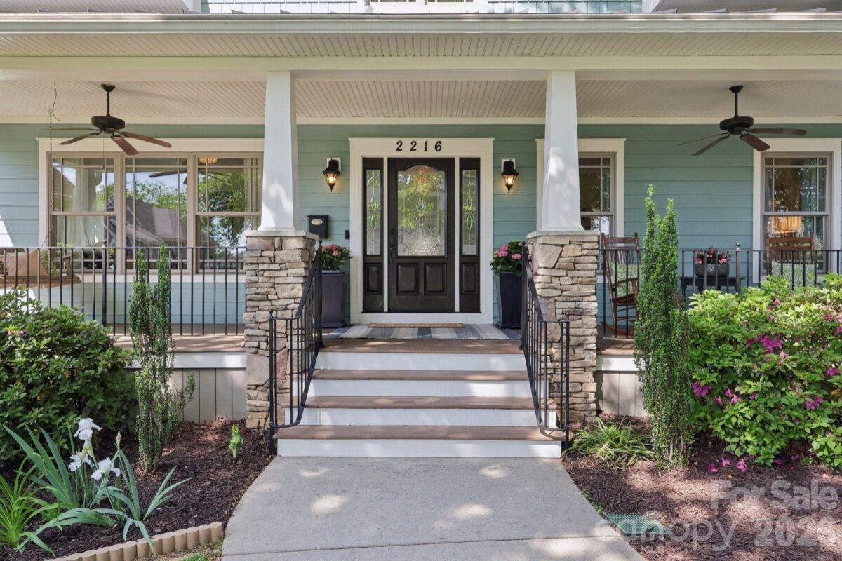 Welcome to 2216 Springdale Avenue - a beautifully crafted home where timeless design meets modern efficiency in the heart of Dilworth. Built in 2007 and offering over 3400 sq.ft., this residence seamlessly blends thoughtful detail, durable construction and a warm, livable flow. Natural sunlight fills the home throughout the day, highlighting the golden teak floors, rich millwork and custom trim, with Energy-conscience enhancements. The main level features an inviting layout with the primary suite, private bath and spacious walk-in closet. A second main-level guest suite creates a perfect arrangement for multigenerational living, long-term guests, or a dedicated home office with privacy. The kitchen includes solid-surface countertops, and transitions seamlessly into the family room, where coffered ceilings, built-ins and a gas fireplace create a warm gathering space. This area opens into a screened porch and a beautifully designed outdoor living area, including a stamped concrete patio and a generous, level backyard. Upstairs, two additional bedrooms, a large bonus room, and excellent walk-in and attic storage. Outside, the property offers a detached storage room and covered bay carport. The rocking-chair front porch is wired for surround-sound-ideal for quiet morning or evening entertaining. This home has been pre-inspected and meticulously maintained, offering beauty, efficiency, storage, and versatility in one of Charlotte's most coveted neighborhoods.
