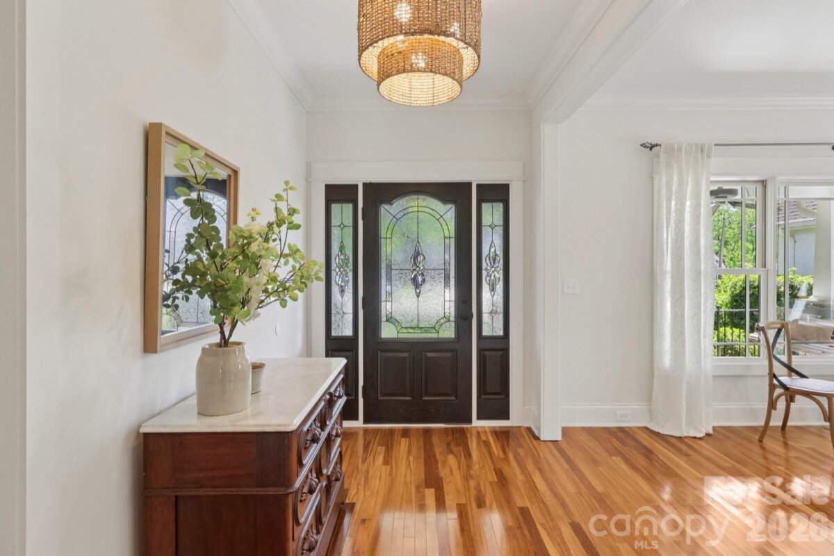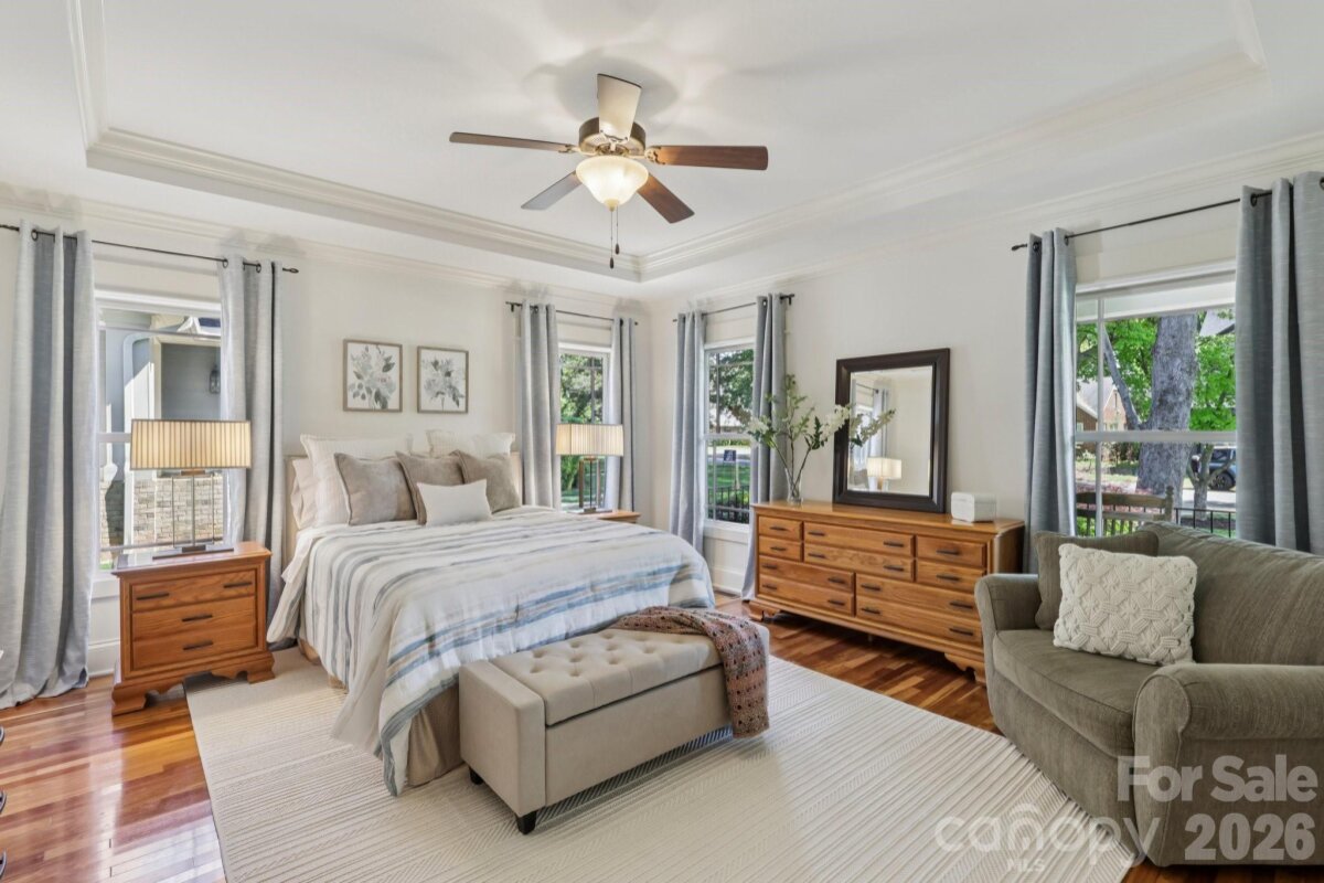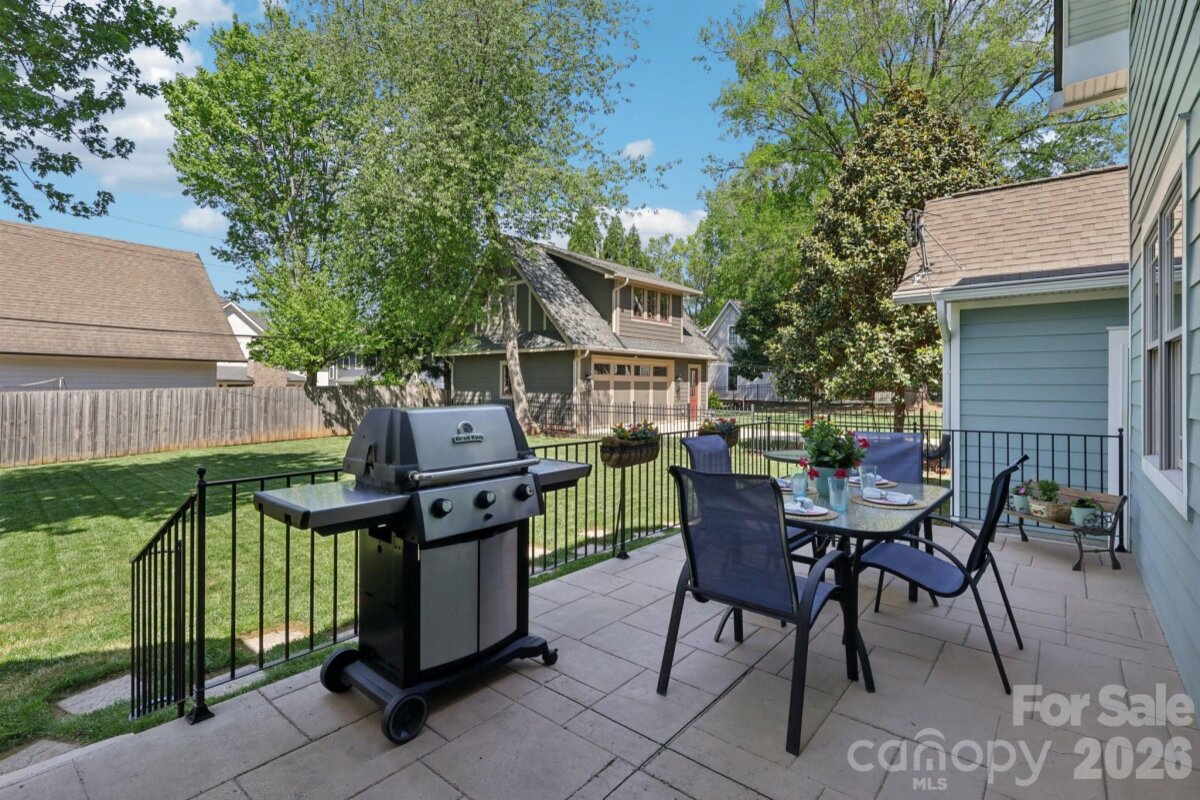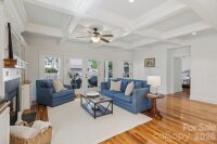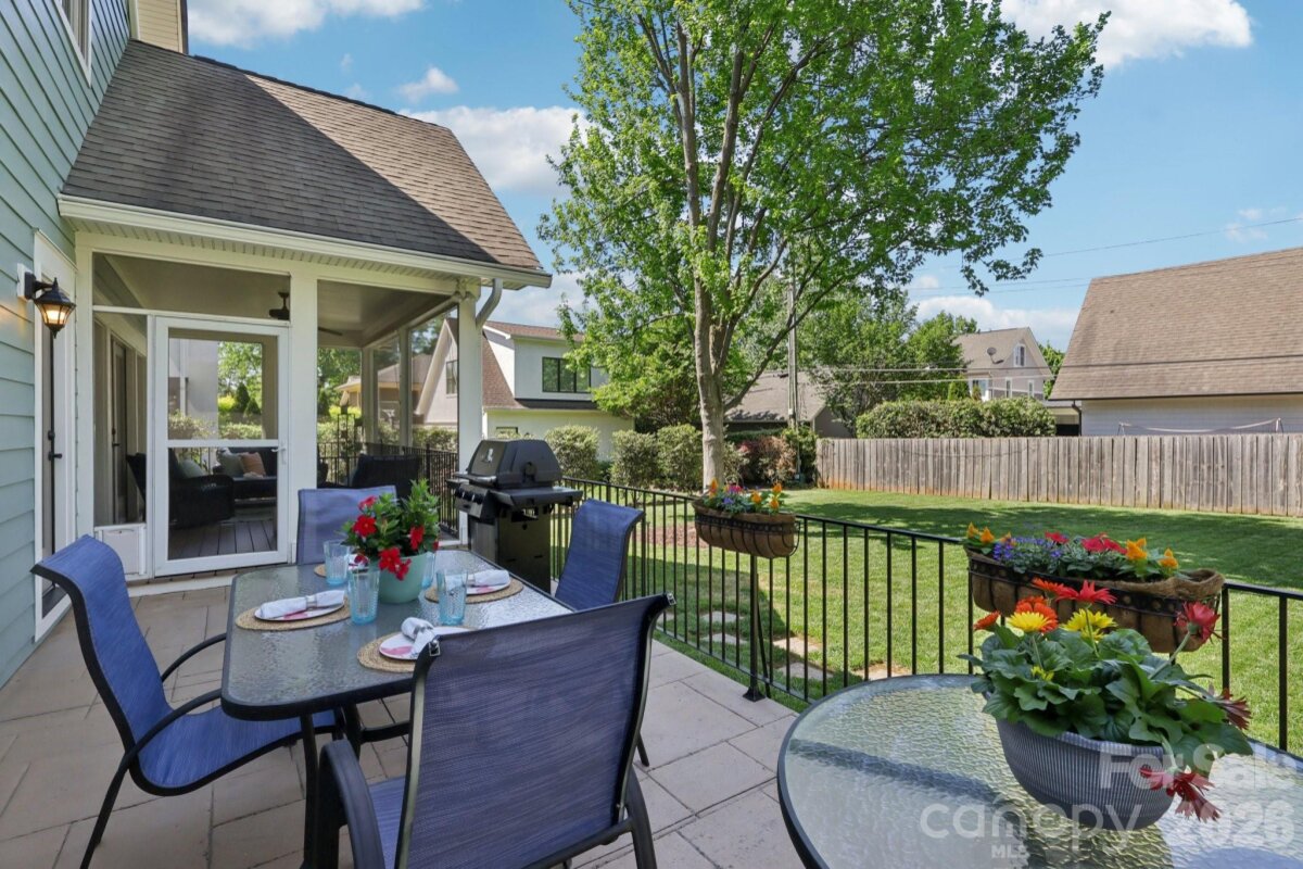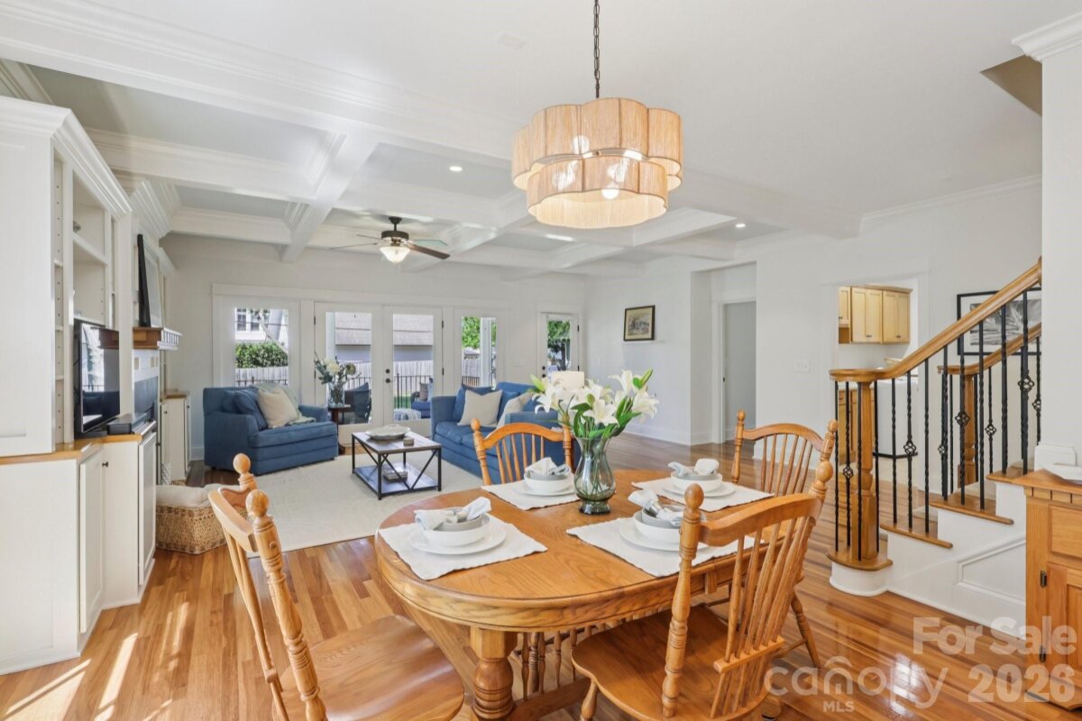 Welcome to 2216 Springdale Avenue - a beautifully crafted home where timeless design meets modern efficiency in the heart of Dilworth. Built in 2007 and offering over 3400 sq.ft., this residence seamlessly blends thoughtful detail, durable construction and a warm, livable flow. Natural sunlight fills the home throughout the day, highlighting the golden teak floors, rich millwork and custom trim, with Energy-conscience enhancements. The main level features an inviting layout with the primary suite, private bath and spacious walk-in closet. A second main-level guest suite creates a perfect arrangement for multigenerational living, long-term guests, or a dedicated home office with privacy. The kitchen includes solid-surface countertops, and transitions seamlessly into the family room, where coffered ceilings, built-ins and a gas fireplace create a warm gathering space. This area opens into a screened porch and a beautifully designed outdoor living area, including a stamped concrete patio and a generous, level backyard. Upstairs, two additional bedrooms, a large bonus room, and excellent walk-in and attic storage. Outside, the property offers a detached storage room and covered bay carport. The rocking-chair front porch is wired for surround-sound-ideal for quiet morning or evening entertaining. This home has been pre-inspected and meticulously maintained, offering beauty, efficiency, storage, and versatility in one of Charlotte's most coveted neighborhoods.