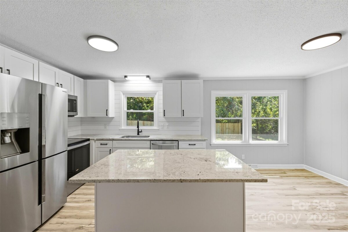 Behind its timeless all-brick exterior, this property is essentially a brand-new home. Taken down to the studs, most every system of this home has been rebuilt offering peace of mind and modern efficiency for years to come. With a brand new roof, windows, cedar shutters, new front porch, and a tastefully painted craftsman front door, this 3 bed, 2 bath home is ready for a lucky new homeowner! The entire interior was gutted and reimagined. New electrical outlets/switches and plumbing systems bring reliability, while the HVAC ensures year-round comfort. The open-concept design fills with natural light, creating an airy and inviting flow. Rooms connect seamlessly, eliminating the small, boxed-in feel of older homes. All bedrooms have newly refinished hardwood floors. Envision yourself cooking all of the holiday meals in this brand new and designed to impress kitchen: granite countertops, a tasteful shiplap backsplash, sleek cabinetry, stainless steel appliances, and modern fixtures. Both bathrooms are fully updated. Every detail is fresh, functional, and attractive. All LED lighting provides efficient brightness throughout, while the wood-burning fireplace anchors the spacious extra living area, adding warmth and character. Behind the fenced-in backyard of the main home, a rare bonus awaits: a detached, wired building of over 1,000 square feet with its own driveway off of 7th Avenue. It needs some TLC, but the space is there for your creativity and imagination. Set on nearly an 3/4 acre, the property offers room for outdoor living, gardening, or simply enjoying the space around you. The brick exterior brings curb appeal and low-maintenance durability. The creek running to the East of the house flows through the majority of the lot and could be landscaped beautifully if desired. Charlotte lies roughly 20-25 miles away, making it an easy commute for work or entertainment. While Gastonia itself offers schools, shopping, and services just minutes away.