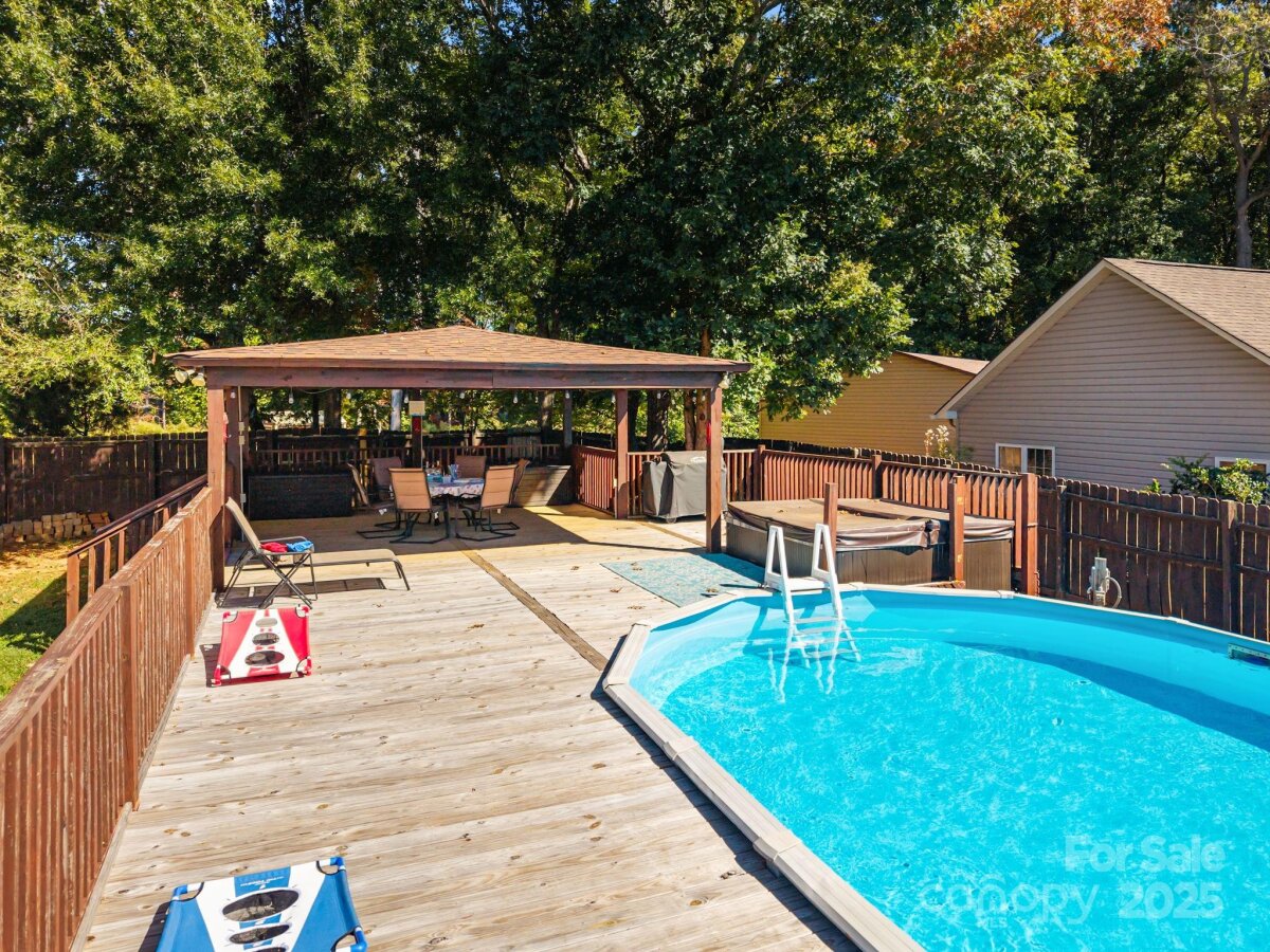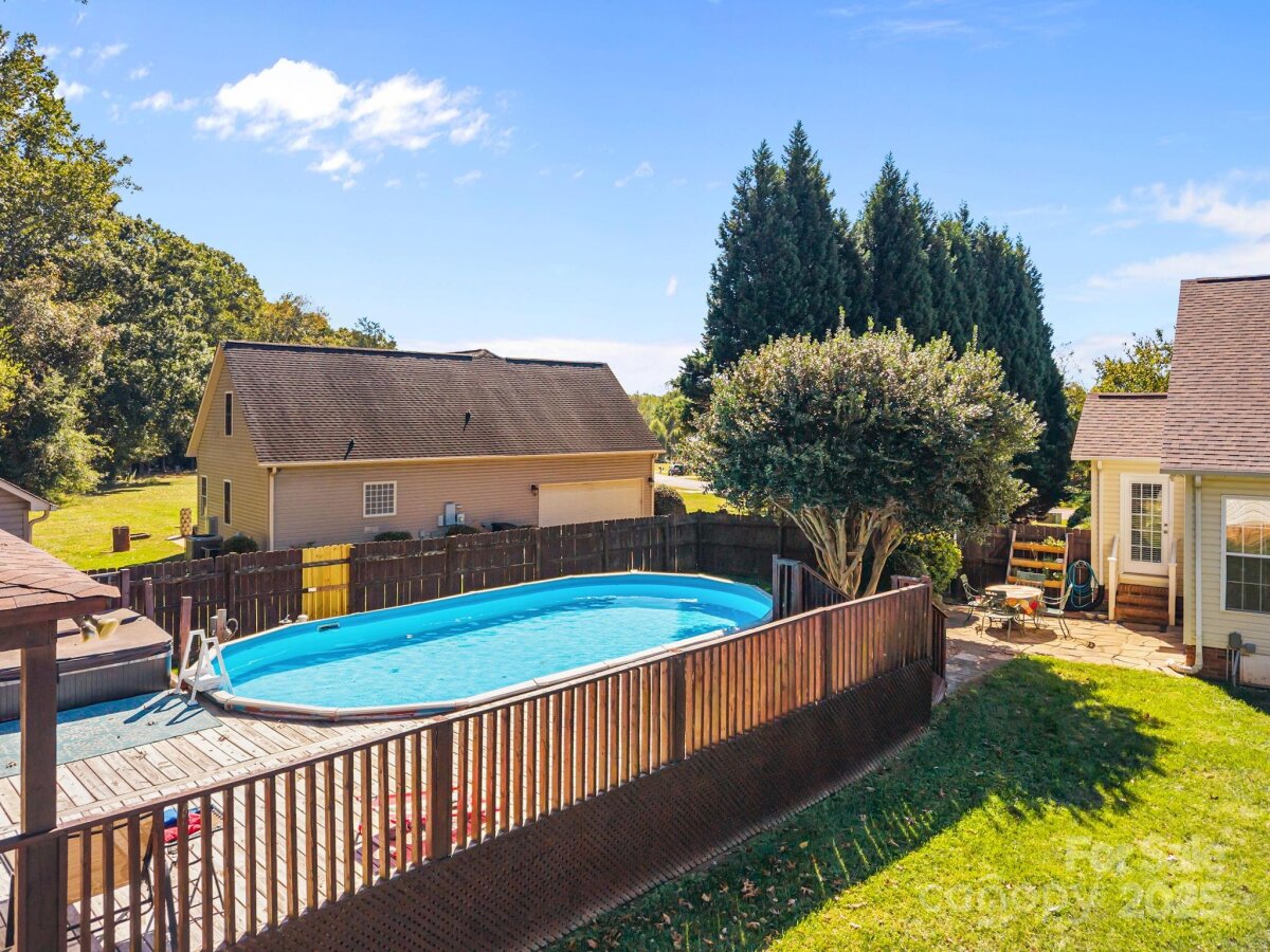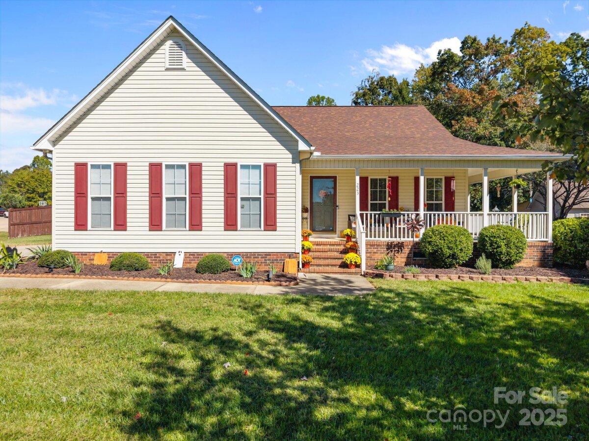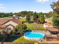 Charming 3-bedroom, 2-bath ranch with side-load garage nestled on a spacious half-acre corner lot in a peaceful country setting—No HOA - USDA Eligible! Enjoy relaxing on the wraparound porch or entertaining in the private, fenced backyard featuring a large above-ground pool with extensive decking (replaced 2024), a covered gazebo for shade, a hot tub, a jumbo, custom 3-tier playset, updated cozy fire pit (Nov 2024), and a 12x24 outbuilding with electricity—perfect for a workshop or extra storage. Inside, the kitchen shines with granite countertops, granite backsplash, and stainless steel appliances. All bedrooms are generously sized, featuring newer carpet. The primary suite offers two closets and a private bath. Major updates include a newer roof, HVAC, and water heater; septic tank inspected and pumped (May 2023); new electrical meter box (2024); garage door opener (June 2024); garage door electrical and springs replaced (June 2025); and several new window screens scheduled for installation (Nov 2025). Refrigerator, washer, and dryer convey.