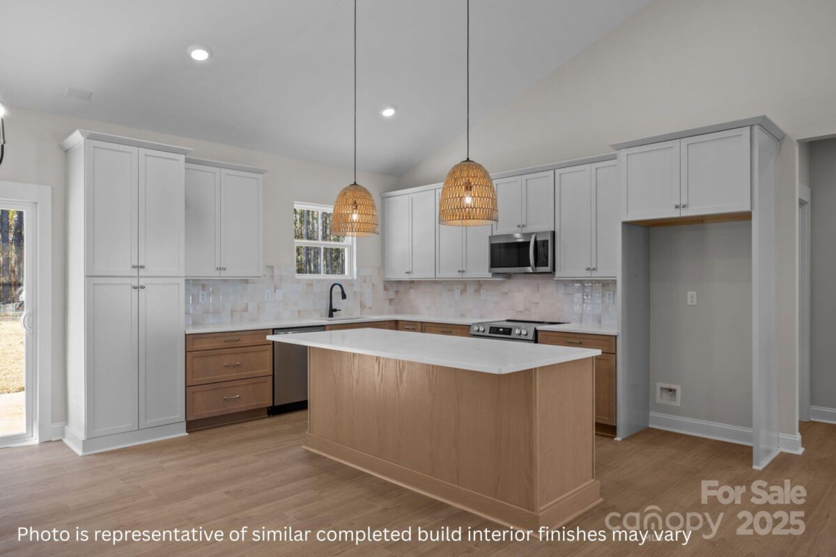Experience thoughtfully crafted single-level living in North Pines - new-construction by Brancer Homes. 2279 Lee Lawing Road blends modern comfort, elevated finishes, and the privacy of tree-lined homesites, all just 15 minutes from downtown Lincolnton and close to shopping in Sherrills Ford and Denver. Charming curb appeal begins with stone accents and a stained wood front-porch column, creating a warm and welcoming entry. Inside, this home features the builder’s Earthy Designer Package, showcasing nature-inspired tones, curated lighting, upgraded cabinetry, walk in pantry, and quartz countertops throughout. The open kitchen includes pendant lighting over the island, upgraded cabinetry combinations, and a bright flow into the main living spaces—ideal for daily living and entertaining. The spa-influenced primary suite offers a beautifully tiled shower wall, stand alone tub, and a calming design palette with crisp white ceilings. Additional features include a drop zone, added recessed lighting, and a laundry room with cabinets and a quartz counter for extra storage and functionality. The home also offers an extended two-car garage with exterior exit door and additional driveway parking, making everyday life even more convenient. Designed for low-maintenance living with a peaceful rural backdrop, this home combines thoughtful craftsmanship, modern design, and Carolina charm—perfectly positioned in the heart of Lincolnton. Current photos are representative of other completed homes.