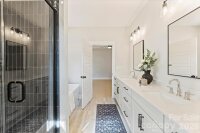 Just completed and now available, welcome to North Pines—Lincolnton’s newest community of thoughtfully designed single-level homes by Brancer Homes. This 1632-square-foot residence at 2295 Lee Lawing Road offers refined finishes, modern comforts, and the peaceful privacy of tree-lined homesites, all just 15 minutes from downtown Lincolnton and convenient to shopping in Sherrills Ford and Denver. The inviting exterior showcases brick accents and a stained wood front-porch column, creating warm, timeless curb appeal. Inside, the builder’s Lakeside Designer Package delivers an elevated aesthetic with upgraded lighting selections, mixed-tone high-end cabinetry, and quartz countertops throughout for a cohesive, upscale feel. The open-concept kitchen features pendant lighting over the island, a walk-in pantry, and seamless flow into the main living area—ideal for both everyday living and entertaining. The primary suite offers a spa-inspired retreat with a stand-alone soaking tub, full shower wall tile, and a calming designer color palette complemented by crisp white ceilings. Thoughtful details continue with a functional drop zone, added recessed lighting, and a well-appointed laundry room with cabinetry and quartz counters. Now that construction is complete, this home is part of a newly released collection in North Pines—offering a rare opportunity to own move-in ready new construction with elevated design and natural privacy in one of Lincolnton’s fastest-growing areas. Finishing touches include an extended two-car garage with an exterior exit door and additional driveway parking, offering both convenience and flexibility. Designed for low-maintenance living in a natural, rural setting, this home combines craftsmanship, comfort, and Carolina charm in the heart of North Pines.