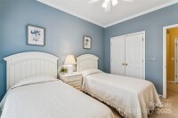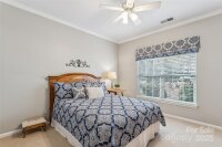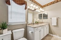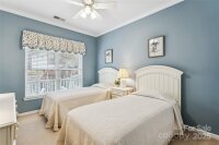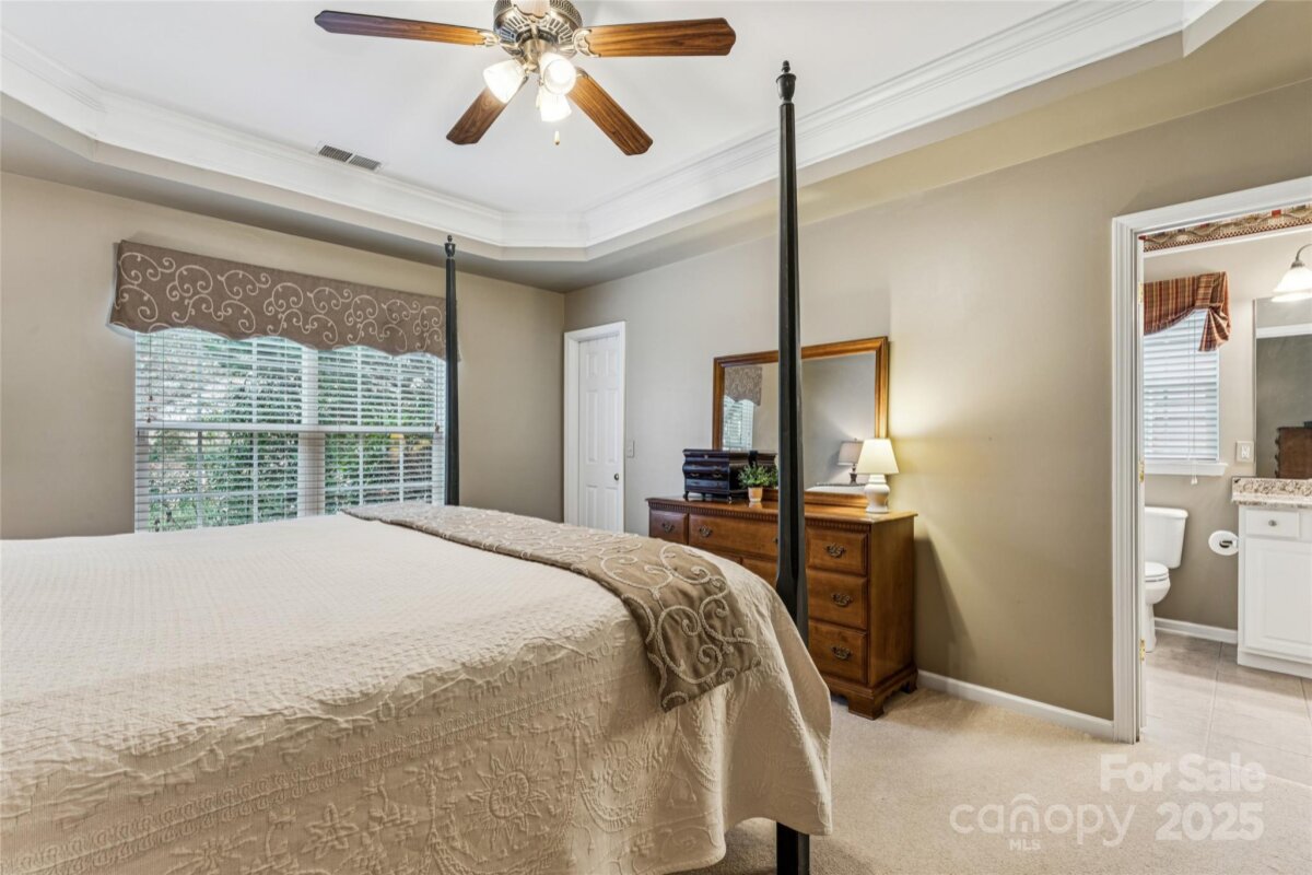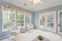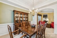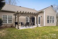 Located on the Cabarrus County side of Highland Creek and zoned for the highly sought-after Cox Mill School District, this beautifully maintained home offers the perfect blend of one-level living, timeless design, and private outdoor space. A welcoming covered front porch opens to a bright foyer featuring hardwood floors, wainscoting, and crown molding that immediately set a refined tone. The spacious family room offers crown molding, a ceiling fan, and a gas fireplace, creating a warm and inviting space with excellent flow for everyday living and entertaining. The formal dining room is highlighted by a tray ceiling with trim detail, elegant chandelier, wainscoting, and graceful archways, providing an ideal setting for gatherings and special occasions. The kitchen features granite countertops, abundant cabinetry, stainless steel appliances, recessed lighting, and a functional center island with butcher-block top. At the rear of the home, a light-filled sunroom surrounded by windows provides a peaceful retreat with views of the private, tree-lined backyard. French-style door leads to the rear patio with pergola, creating an ideal outdoor living space with exceptional privacy rarely found in neighborhood living. The main level includes three bedrooms, including a spacious primary suite with tray ceiling, crown molding, and ceiling fan. The ensuite bath offers dual vanities with granite countertops, a walk-in shower and generous storage. Two additional main-level bedrooms share a full bath, offering flexibility for guests or home office needs. Upstairs, a large bed/bonus room provides versatile space ideal for a home office, media room, or guest retreat. With classic architectural details, a functional layout, and a serene wooded backdrop, this home delivers comfort, flexibility, and privacy—all conveniently located near shopping, dining, golf, and major commuter routes.
