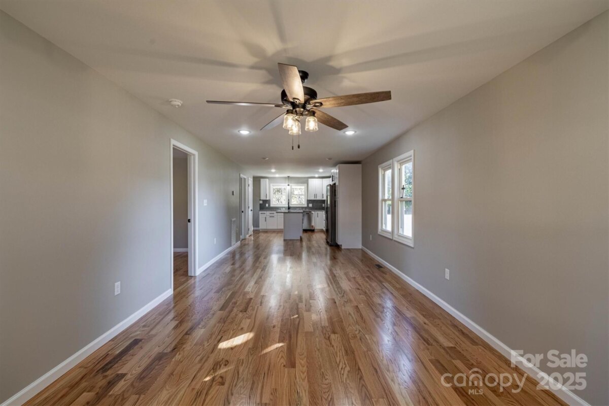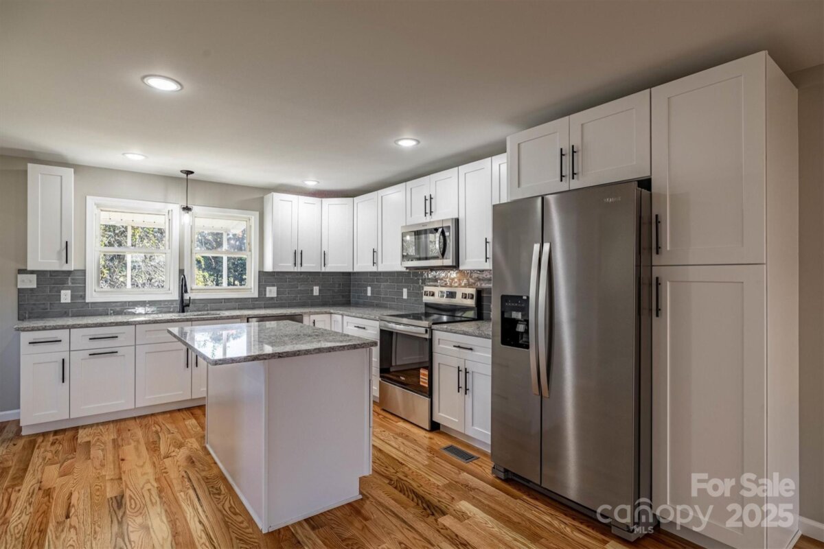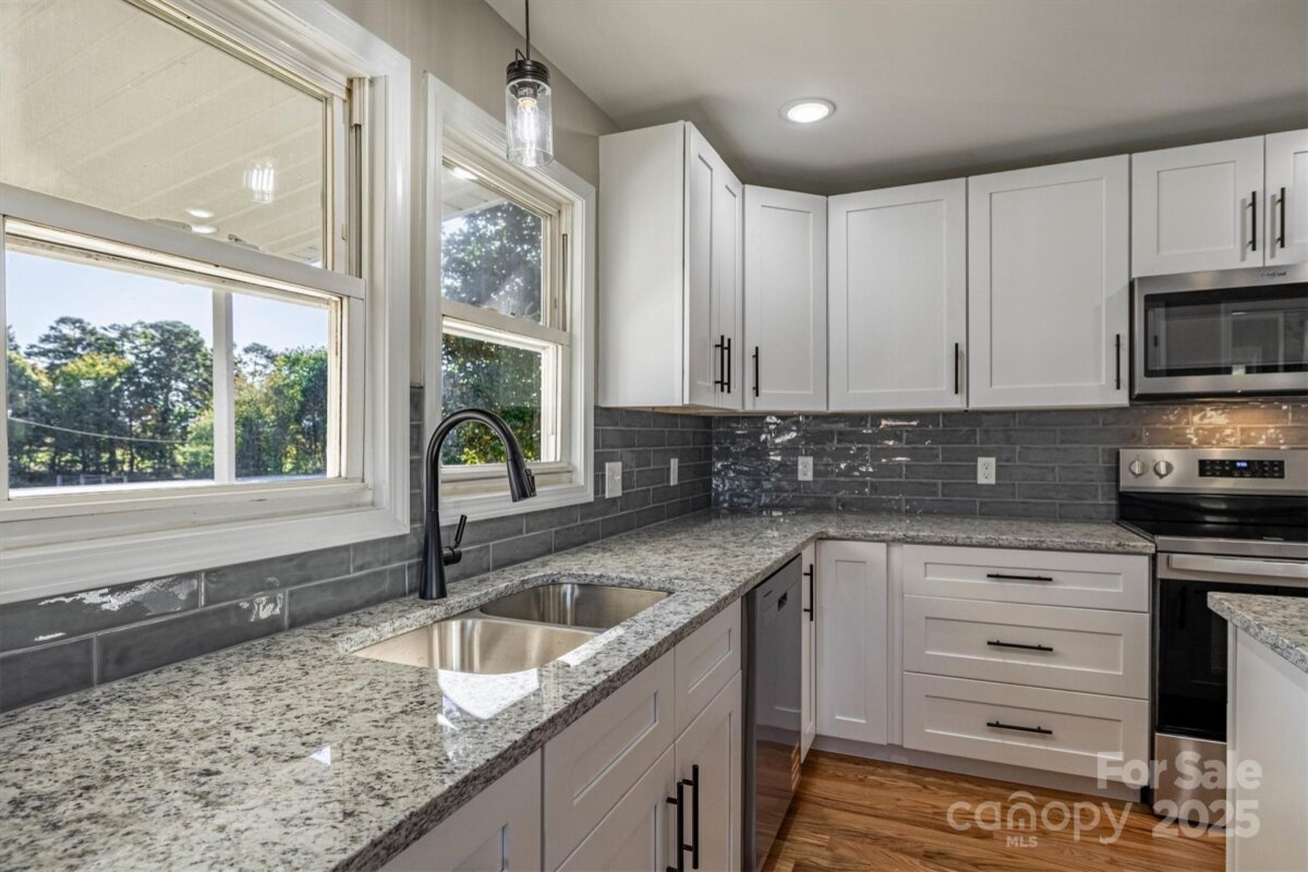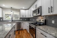 Welcome to modern living! This beautifully and completely renovated bungalow is a rare find, combining classic charm with sophisticated, contemporary finishes. Step inside and be greeted by a bright, open-concept floor plan flowing across stunning, newly installed hardwood floors. The entire home has been updated from top to bottom with fresh paint in a designer neutral palette and features recessed lighting throughout, creating a warm and welcoming atmosphere. The heart of the home is the brand-new gourmet kitchen. It boasts crisp white shaker cabinetry, elegant granite countertops, and a sleek, gray subway tile backsplash. Equipped with a full suite of modern stainless steel appliances and a convenient peninsula/island, it is perfect for casual dining and entertaining. The bathroom has been flawlessly updated with luxurious touches, including marble-look vanities, new tile flooring, and sophisticated matte black fixtures. Outside, you’ll love the classic covered front and back porches—perfect spot for your morning coffee. This property is truly turn-key and ready for its next owner. Located on a lovely lot with mature trees, it offers peace and privacy while remaining conveniently accessible. Don't miss the opportunity to make this completely refreshed house your new home!