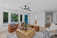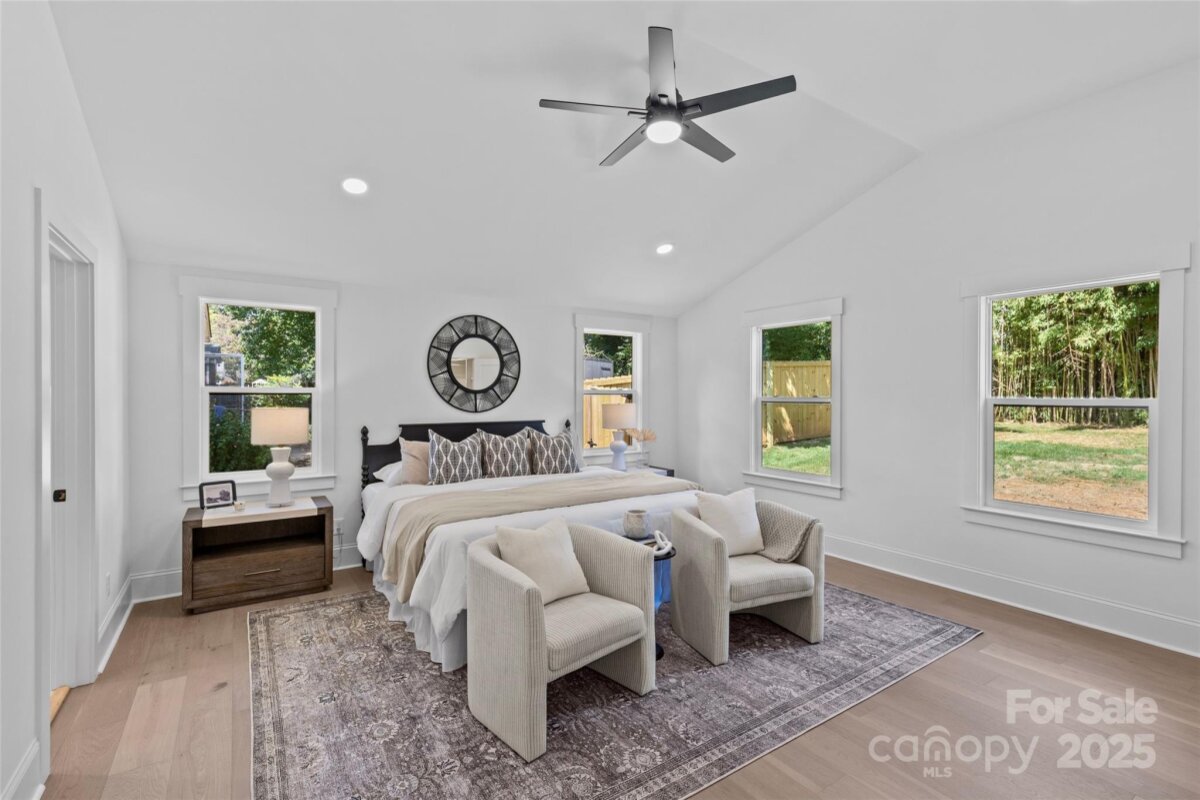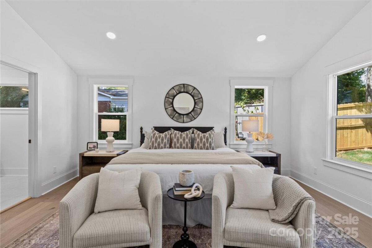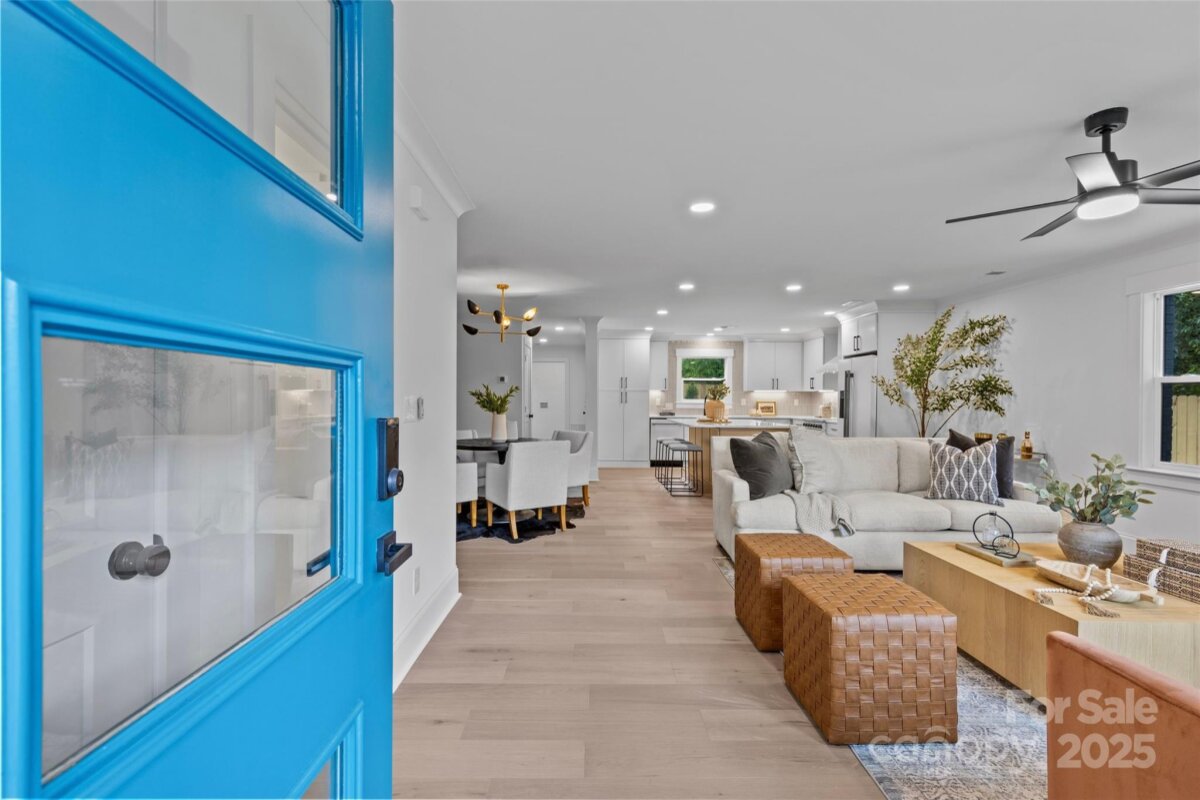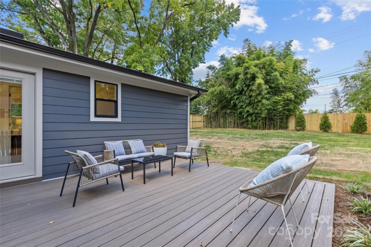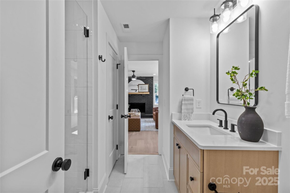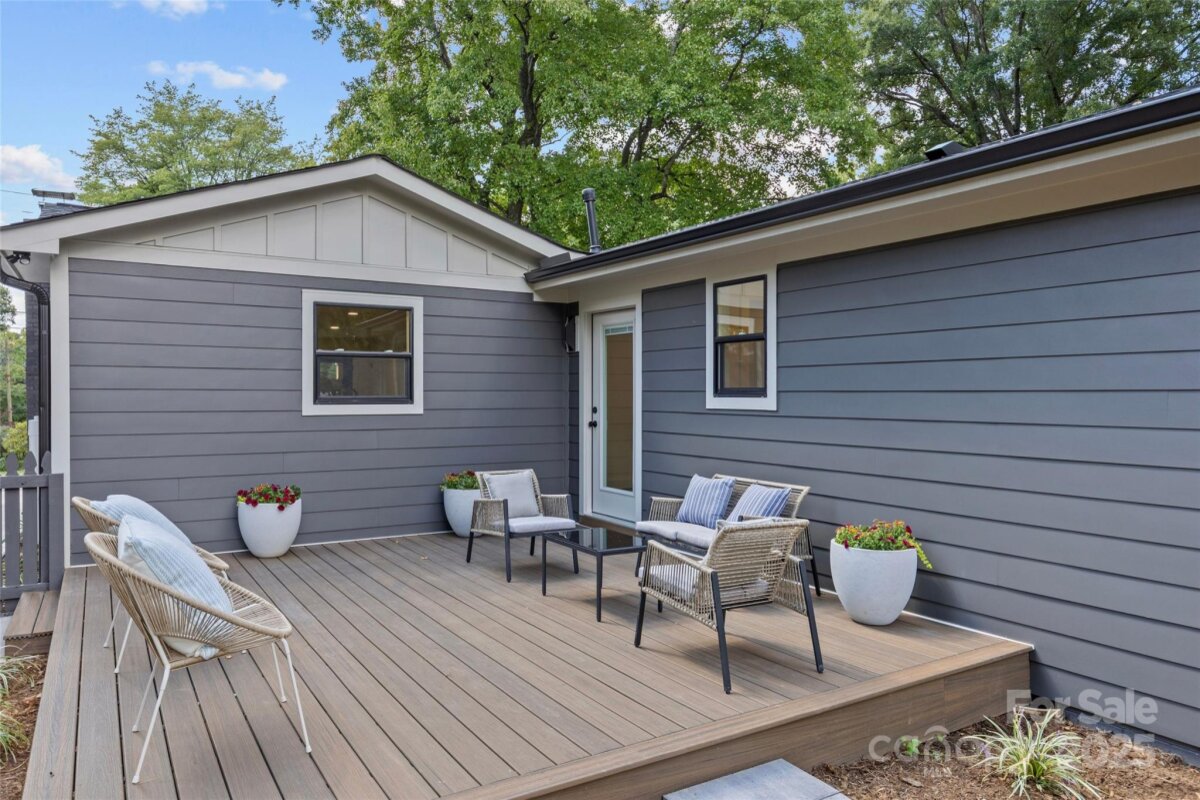 Welcome to 2461 Eaton Drive, a remarkable reinvention in the heart of Amity Gardens—a charming community near Commonwealth, Oakhurst, and Cotswold, and just minutes from Charlotte’s Center City. This 1950s ranch has been fully transformed into a modern home with timeless curb appeal, featuring true full cedar porch columns that set the tone for the craftsmanship inside. Taken down to the studs, the home boasts all new wiring, plumbing, insulation, drywall, windows, HVAC, tankless water heater with recirculating pump, and an architectural shingled roof. This is essentially a brand-new build wrapped in the charm of an established neighborhood. Inside, a wide-open floor plan creates effortless flow between the living, dining, and kitchen. White oak engineered hardwood floors run throughout, lending warmth to the home’s contemporary modernist aesthetic. The living room centers on a stylish fireplace with gas ceramic ball set, anchored by a cedar mantel—a perfect gathering spot for everyday living. The kitchen is sleek and functional, appointed with quartz countertops, modern cabinetry, and designer finishes. Bathrooms mirror the same quality with quartz vanities, stylish tilework, and carefully curated details. A rear entry drop zone with a cute bench and storage makes everyday life easy, while a full-size laundry room offers true convenience. The huge primary suite is a standout retreat, designed with vaulted ceilings, generous proportions, and a spa-like en suite bath. Two additional bedrooms, each with its own private bath, provide flexibility and comfort. Outdoor living is just as appealing. The welcoming front porch overlooks the neighborhood, while the 16’ x 16’ Trex deck offers a spacious, low-maintenance spot for entertaining or relaxing. The fenced backyard creates a private escape for pets, gatherings, or play. Every detail has been thoughtfully considered to create a warm yet sophisticated home, blending clean modern design with timeless materials. With its complete rebuild, elegant finishes, and inviting layout, this home is truly move-in ready. The location is just as impressive—nestled in Amity Gardens with quick access to Commonwealth, Oakhurst, and Cotswold Village for dining and shopping, and only minutes to Plaza Midwood and Uptown. 2461 Eaton Drive is more than a renovation; it is a reinvention—an opportunity to own a one-of-a-kind home that combines modern comfort, warm style, and unbeatable convenience.