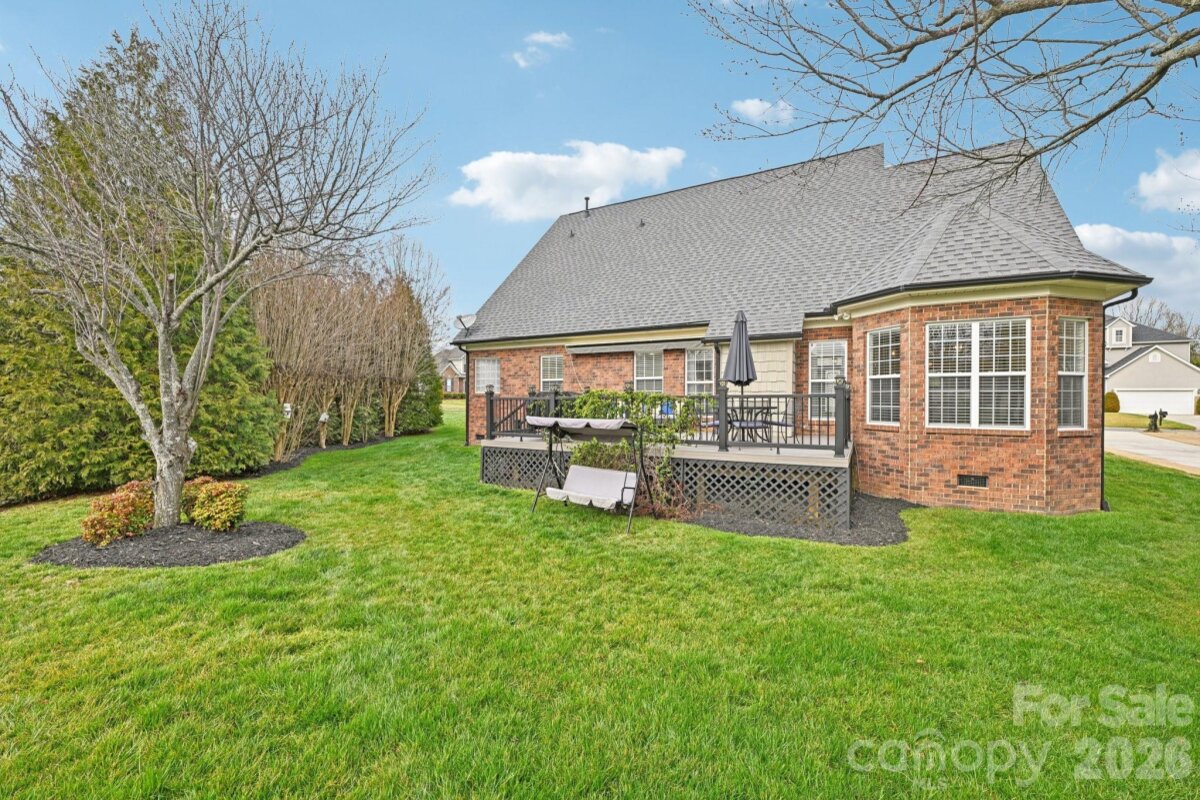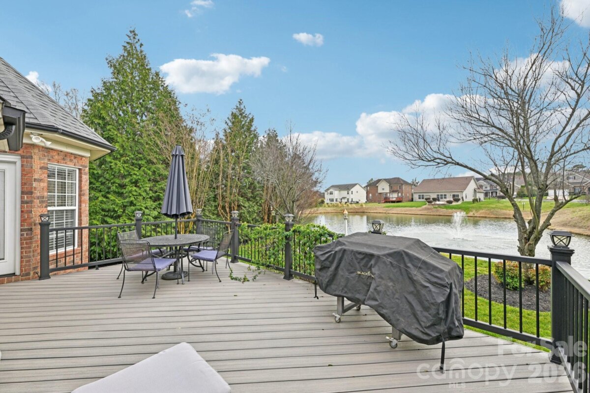 Stunning full-brick retreat offering the perfect blend of elegance and serenity. This 4-bedroom, 3-bath gem welcomes you with a charming front porch and a grand two-story foyer. The main level features a soaring vaulted great room with a gas fireplace, flowing seamlessly into a gourmet kitchen. Chefs will love the granite countertops, double ovens, gas cooktop, breakfast bar and a sun-drenched breakfast room with a bay window overlooking the water. The primary suite is a private sanctuary on the main floor, boasting trey ceilingm walk in closet and a spa-like bath with a garden tub and walk-in tile shower. A rare second bedroom and full bath on the main level provide ultimate flexibility. Upstairs, discover two additional bedrooms and a massive bonus room with abundant storage. The outdoor oasis is unmatched: an oversized Trex deck with a retractable awning, a dedicated gas line for grilling, and sweeping views of a tranquil pond with a fountain, all framed by mature privacy trees and maintained by in-ground irrigation. Experience the best of Indian Land living in this stunning full-brick waterfront retreat! Perfectly situated in a premier location near dining, shopping and entertainment, top-rated schools, and medical facilities, this neighborhood offers a resort-style lifestyle with a pool, clubhouse, and a stocked pond for fishing.