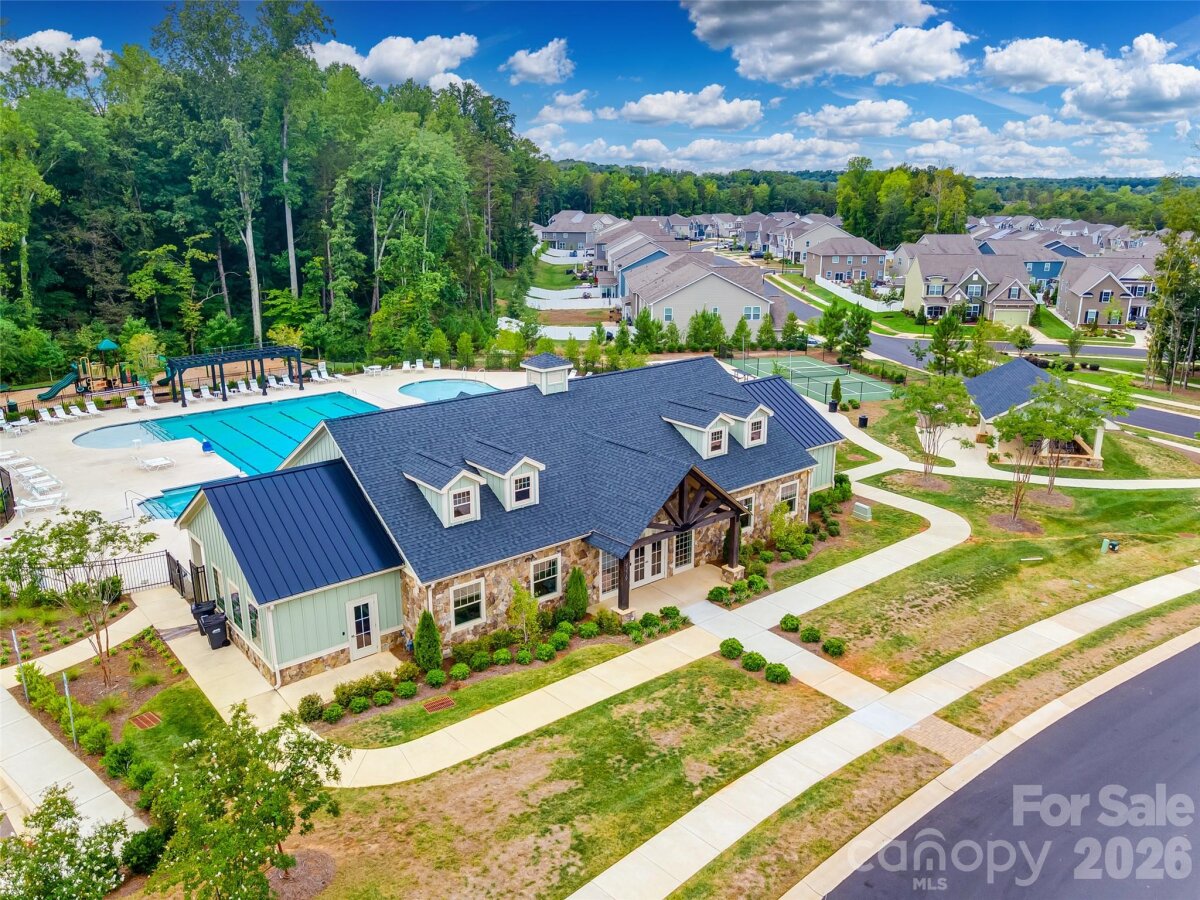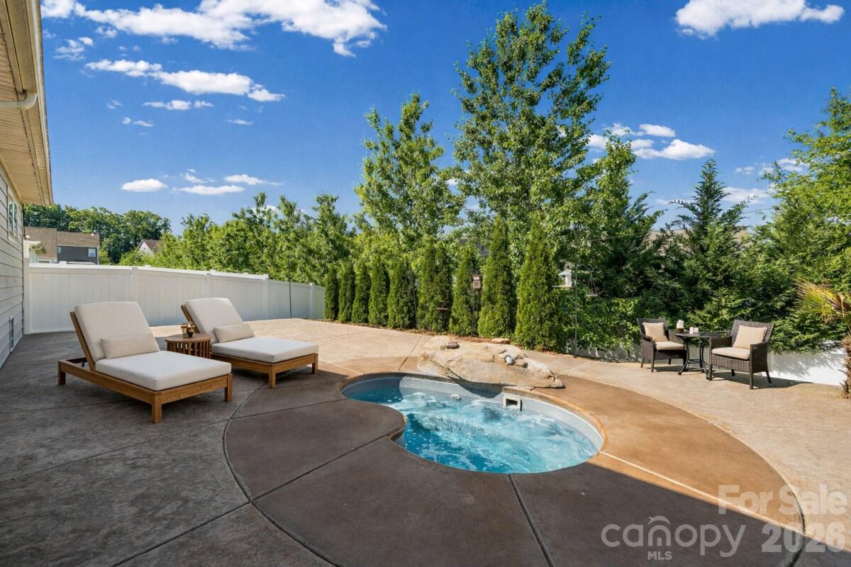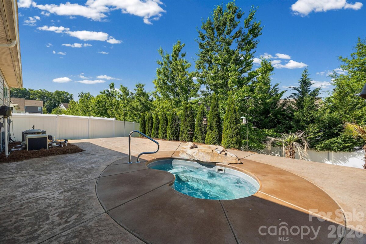 Vacation all year long from your own private resort-style backyard. Enjoy a luxurious custom kidney-shaped spa with adjustable jets and a natural rock waterfall, perfect for relaxing day or night. Surrounded by nine evergreens, a 6' privacy fence, and lush tropical landscaping including two palm trees and a banana leaf tree, this outdoor space offers exceptional privacy and a true escape at home. Extensively upgraded to create a stunning outdoor retreat designed for both peaceful relaxation and effortless entertaining. Ready to move in. Well designed floor plan. Neutral throughout! Tons of upgrades! Granite in the kitchen and bathrooms. Hardwoods. Gas Fireplace in the great room. Open deluxe kitchen with large island, gas stove and big walk in pantry. Refrigerator included. Tank less water heater. Laundry room conveniently located near the primary bedroom. Washer and dryer included. Owners suite has two walk in closets, frameless glass shower, and upgraded tile. Rocking chair front porch. Great location in the heart of Lake Wylie. Close to Lake Access, Shopping and restaurants. Award winning Clover Schools including the New Lake Wylie High School. Lots of amenities including club house, tennis courts, pool, fitness center, playground, and pickle ball court.