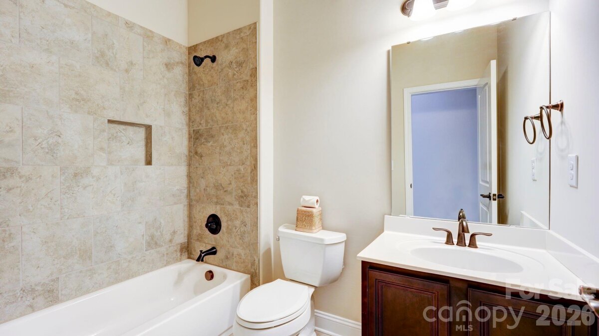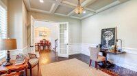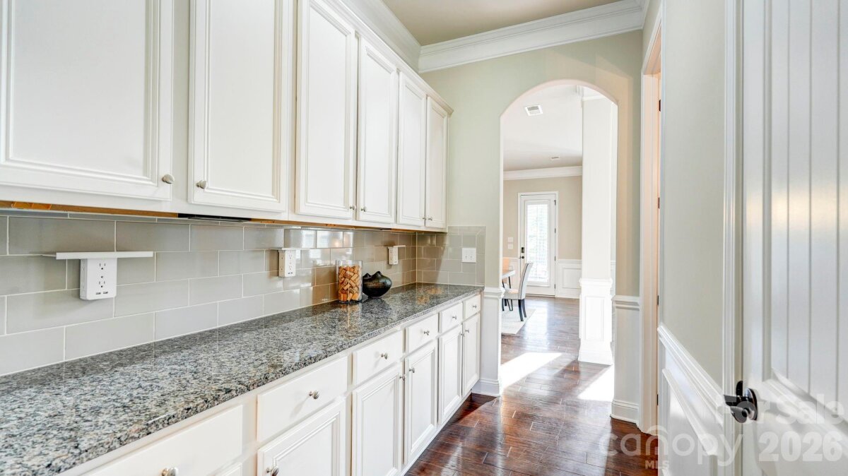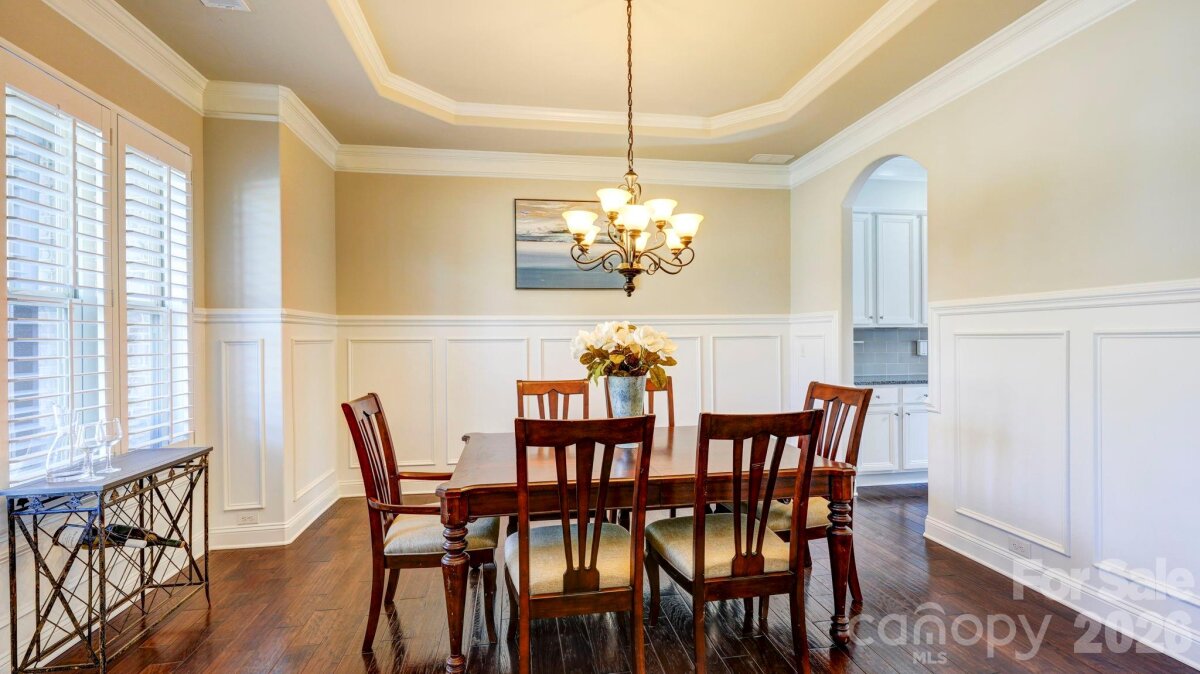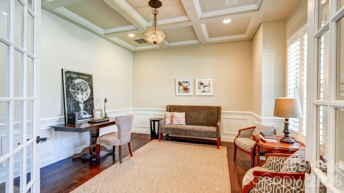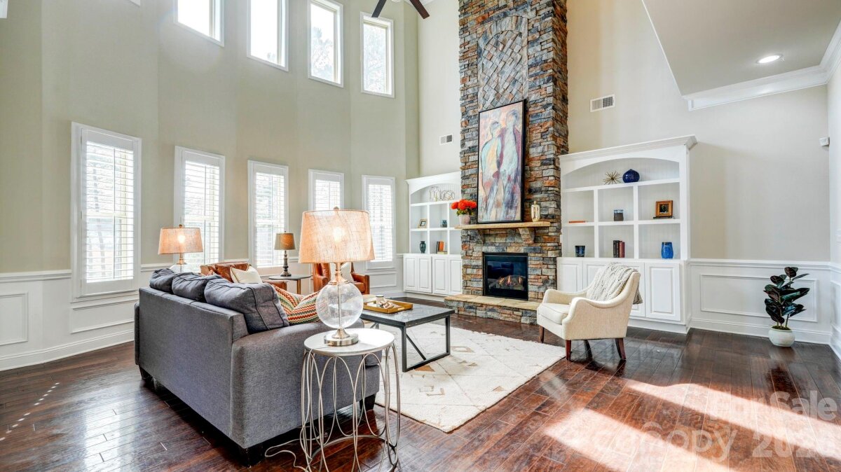 SO MUCH HOUSE FOR THE MONEY! Plenty of space, heavily upgraded, and prime corner lot. This all brick/stone 2-story with basement welcomes you with a rocking chair front porch, and double doors to a striking two-story foyer. It opens to the study/office, and the formal dining room with butler's pantry. The 2-story great room is dramatic with built-ins, a stone fireplace, and a wall of windows. It connects to the breakfast area, and the kitchen with white cabinetry, gas cooktop, double ovens, and a spacious island. From there, you'll find what could be a second pantry, used most recently as a second home office. The drop zone leads to the 3-car garage with epoxy floors. There's also a main floor guest suite. Upstairs, there are 4 more bedrooms, and 3 full baths including the expansive primary suite with sitting area and fireplace. The bath has dual vanities, tub and separate shower, and not one, but two walk-in closets, one the size of a bedroom. The full daylight basement offers even more opportunities, with flex areas for gaming/gym, a bar with sink/fridge and microwave, and a home theater. Plantation shutters throughout the house, even in the basement, and incredible storage areas with custom shelving. Relax on the covered back porch with composite decking, or on the lower paver patios, including one with a fire pit and fountain. Amenity filled community offers a clubhouse, pool and splash pad for the kids and is assigned to award-winning Clover Schools. Welcome home!