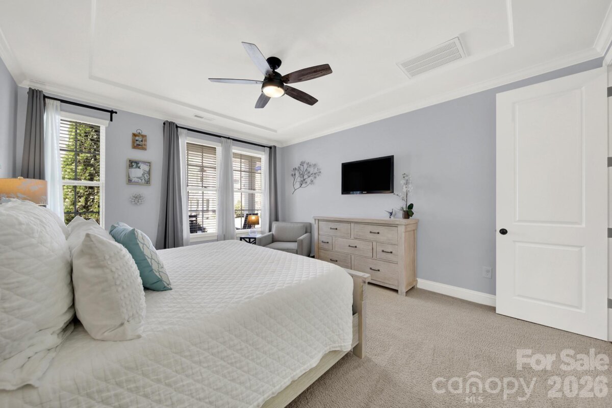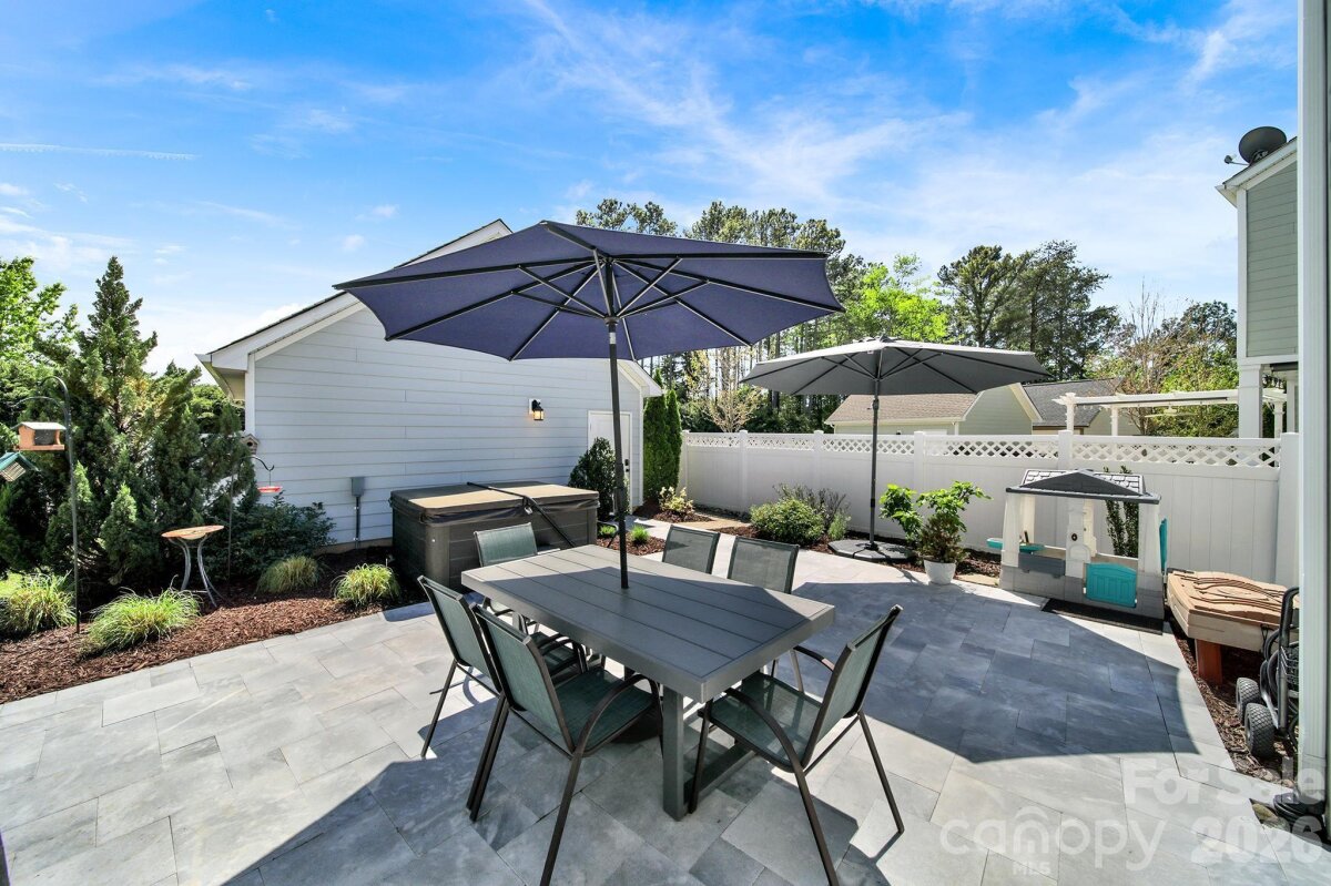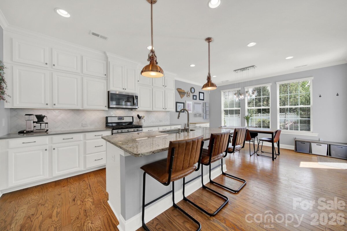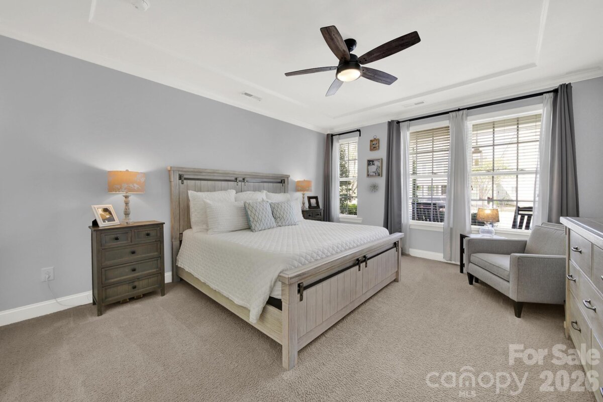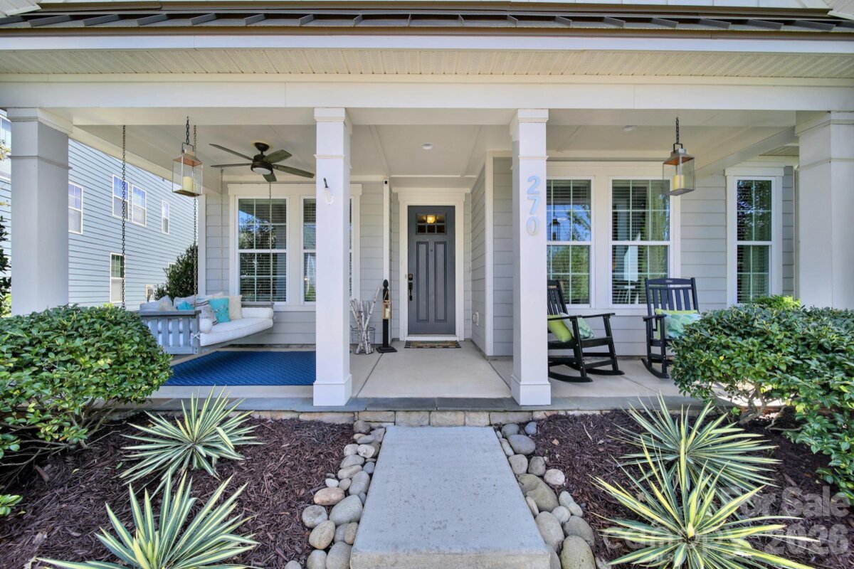 This stunning open-concept home is drenched in natural light and boasts a professionally landscaped yard with irrigation, extensive paver patio, and fully fenced yard, complete with an oversized Charleston-style covered front porch—perfect for relaxing evenings or morning coffee. The kitchen is a chef’s dream, featuring an oversized island with ample seating, stacked cabinets, gas range, stainless steel appliances, and an open dining area that flows seamlessly to the patio for effortless indoor-outdoor living and entertaining. The main level is highlighted with beautiful pre-engineer hardwood floors, a private office with French doors, and a spacious living room ideal for family gatherings. The primary suite on the main floor offers a spa-like bathroom, with a walk-in closet, creating a private retreat. Laundry room is conveniently located on the main level with extra storage closet. Upstairs, you’ll find a versatile loft, two additional bedrooms, a full bath, and a large walk-in storage closet completing the second level. Enjoy a vibrant community lifestyle with amenities including a clubhouse, pool, two playgrounds, walking trails, two scenic ponds, and nearby walkable dining options. All of this is located within the award-winning Fort Mill School District. This home combines modern comfort, thoughtful design, and an ideal location. Welcome home!