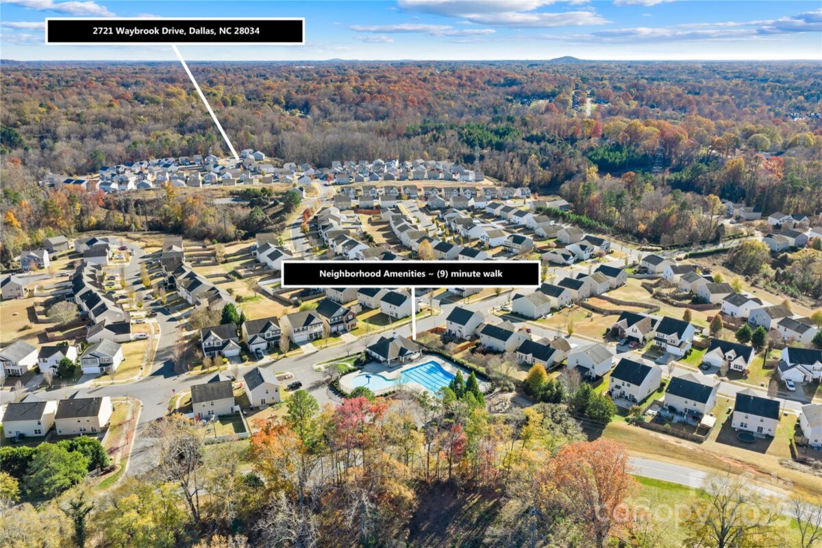 Welcome to 2721 Waybrook Drive, located in the desirable Spencer Mountain Village community in Dallas, NC! With it's community’s swimming pool, playground, cabana, and 7,400+ feet of paved walking trails, Spencer Mountain Village is the perfect place to call home. 2721 Waybrook is a well-maintained two-story home built in 2021 that offers 3 bedrooms, 2.5 baths, and approximately 1518sf of living space on a .13 acre lot. Designed for both comfort and convenience, the Brandon floor plan features a spacious living area that flows seamlessly into the kitchen and dining space—perfect for gatherings and everyday living. The kitchen offers plenty of cabinet and counter space, a pantry, and all major appliances including the refrigerator. Upstairs, you’ll find the laundry area (washer and dryer included), two secondary bedrooms, a full hall bath, and a large primary suite featuring a vaulted ceiling, walk-in closet, and private ensuite bath. Additional highlights include a one-car garage, covered front porch, and a backyard ready for your personal touch. This home also includes the Home Is Connected® Smart Home package, featuring a programmable thermostat, Z-Wave door lock and wireless switch, touchscreen control device, automation platform, and video doorbell—bringing modern convenience to your everyday routine. The garage is also equipped with a EV charger. The remainder of the builder’s 10-year structural warranty is fully transferable to the new homeowner, offering peace of mind for years to come. With its low-maintenance exterior, thoughtful layout, and close proximity to downtown Dallas, shopping, dining, and major highways, this home is truly move-in ready. Don’t miss your opportunity to make 2721 Waybrook Drive your new address—schedule your showing today!