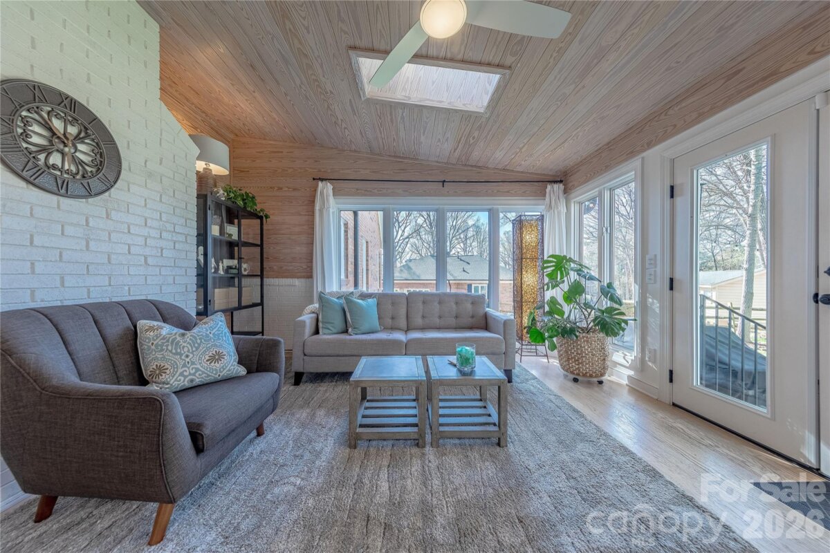 Welcome to this beautifully updated full-brick ranch nestled in the established Willowbrook neighborhood of Matthews. This charming home offers an abundance of upgrades inside and out, blending timeless character with modern style. Step into a thoughtfully designed floorplan highlighted by a vaulted great room featuring natural wood beam detail and skylights that flood the space with natural light, along with a stunning brick fireplace that creates a warm and inviting focal point. The home showcases laminate hardwood floors throughout and fresh, bright interior paint that enhances its airy feel while showcasing the original trim. The kitchen is a true standout, complete with new quartz countertops, a custom island, and upgraded pantry cabinetry, perfect for both everyday living and entertaining. Stylish light fixtures have been updated both indoors and outdoors. Just off the main living area, a cozy sunroom provides a peaceful retreat, offering views of the private, fenced backyard. Step outside to enjoy the extended patio, ideal for relaxing evenings or hosting gatherings in your own outdoor oasis.