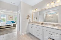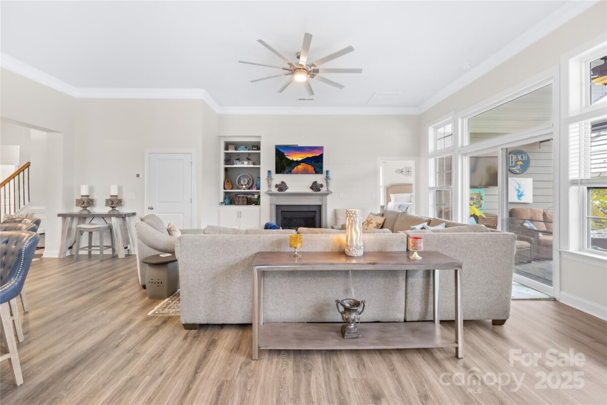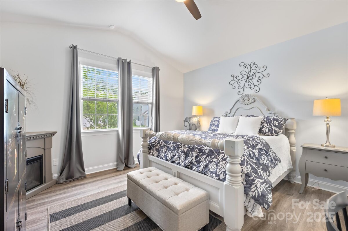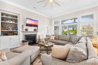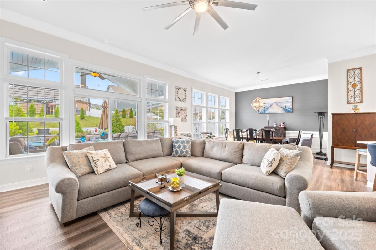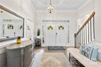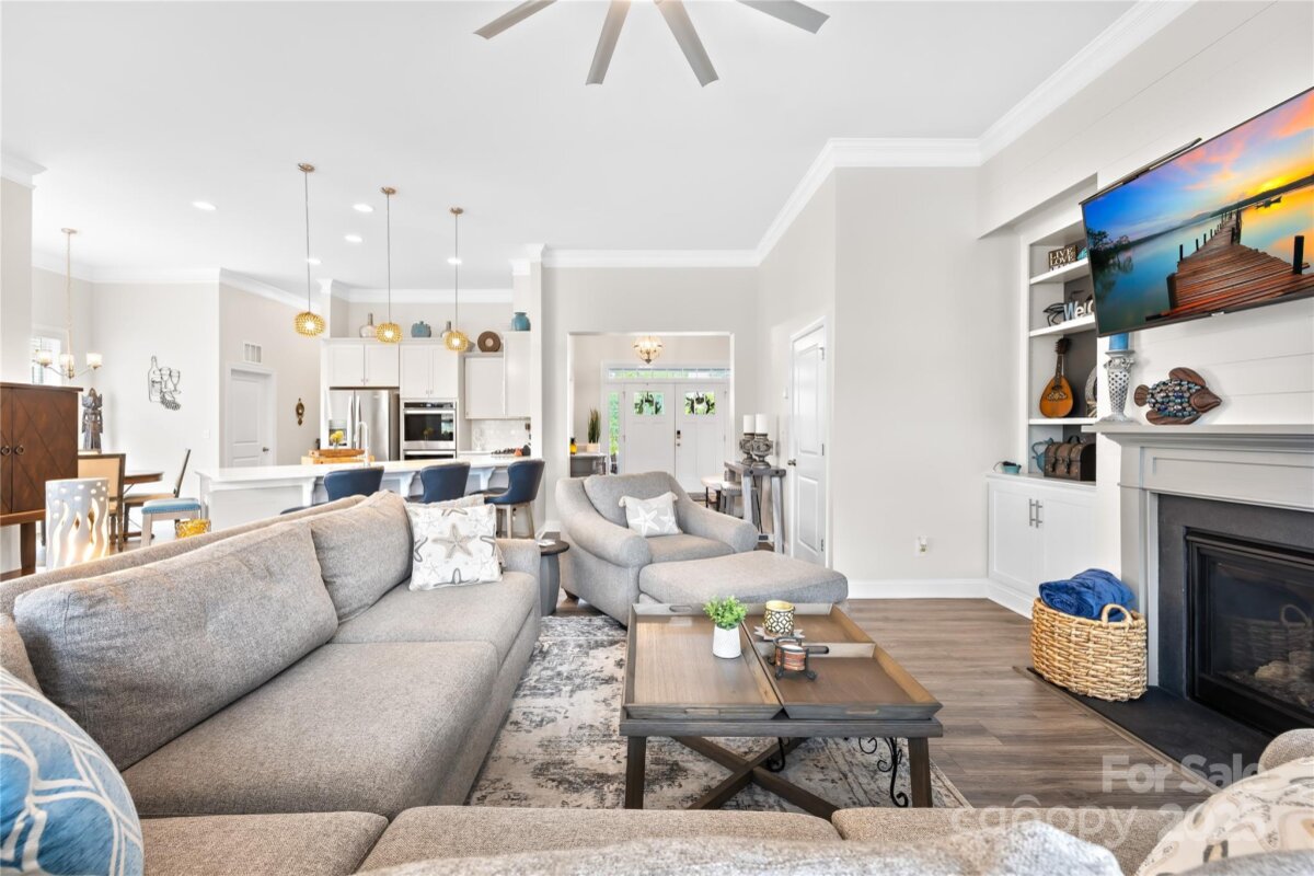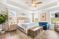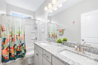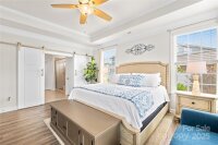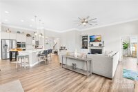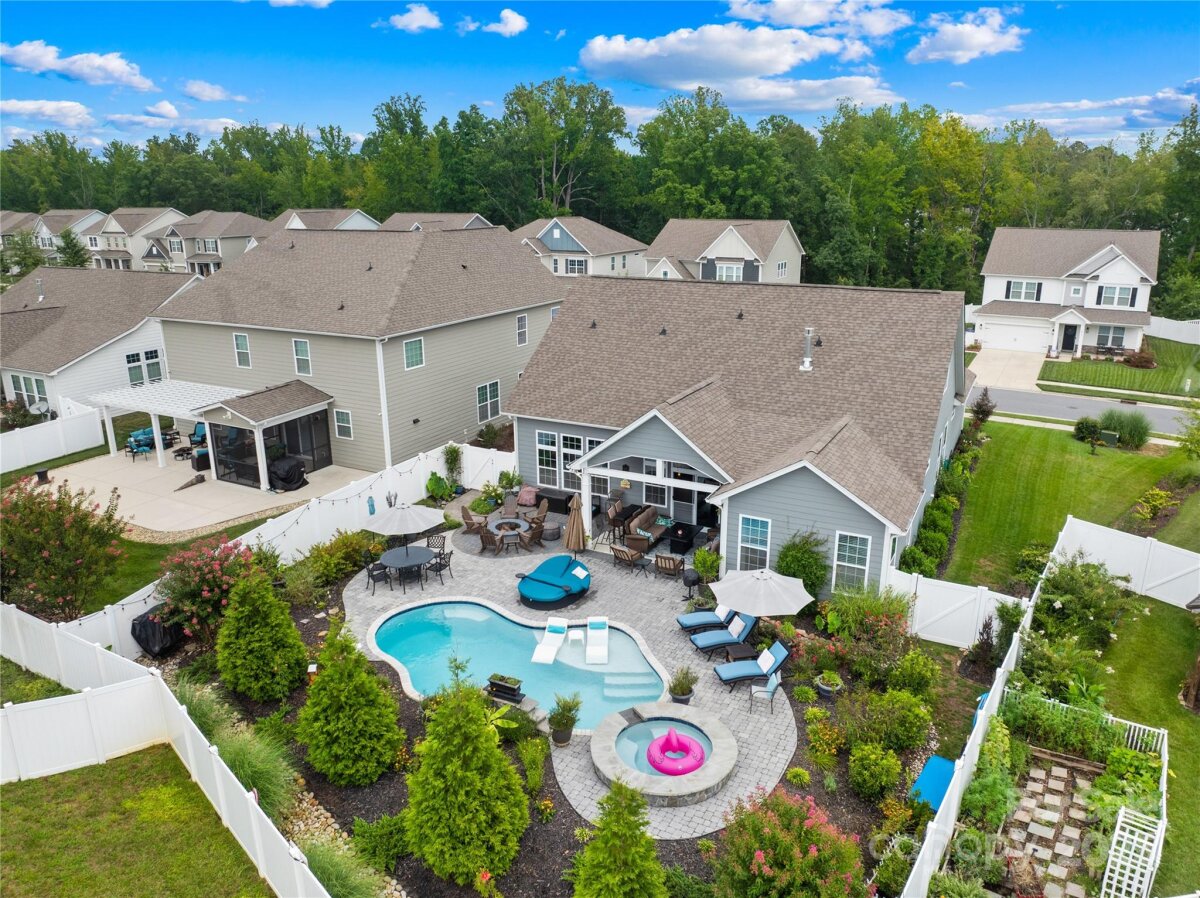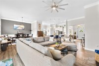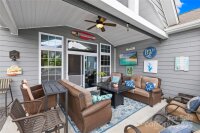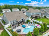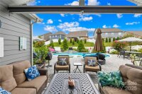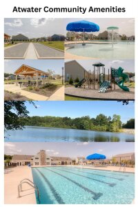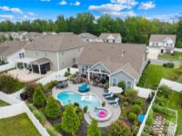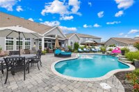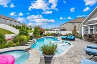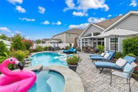 Main-level living! Double front doors welcome you inside this 5 bedroom ranch. The 'Coastal' plans offers high-end finishes including hardwood flooring on the main level, an open kitchen flowing into the living room that's perfect for entertaining. Step outside to your private backyard oasis showcasing an inground pool and built-in hot tub, lush landscaping, paver patio, privacy fencing, and a large wood-burning firepit. Enjoy outdoor living with a covered back porch and extended driveway with added walkway. Beautiful drainage with river rock adds curb appeal. The main floor Primary Bedroom ensuite is sure to impress with barn doors leading to a spacious primary bath with walk-in shower. More details: custom light fixtures, tasteful shiplap accents, built-ins, added ceiling fans, custom pantry shelving. Heat-blocking window film on windows keep things cool. Epoxy-coated garage floor completes the package. Community has pool, clubhouse and more. Shows like a model and move-in ready.