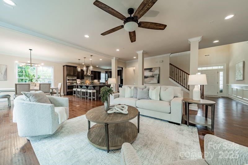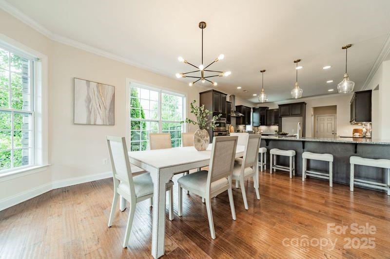 The one you have been waiting for is finally on the market! This popular Blythe Floorplan by M/I Homes has been upgraded with thoughtful details and ready for its new owner! Downstairs features wood floors throughout, chef’s kitchen with ample counter & cabinet space, center island + separate breakfast bar, wall oven + microwave, gas cooktop, walk-in pantry & breakfast area + formal dining room! Spacious great room with fireplace & downstairs bedroom / bathroom. Upstairs, the primary suite is a true retreat—complete with spa-like bathroom, dual vanities, soaking tub, and a custom walk-in Closet-by-Design that’s to die for! Step outside to your private balcony overlooking the backyard sanctuary. Movie nights come alive in the oversized bonus/media room, complemented by an open loft area for even more living space. Three additional bedrooms, two full baths complete the upstairs. Nestled on a landscaped .35 acre lot, the backyard is a fenced private oasis featuring lush gardens, a koi pond, and an extended paver patio ideal for entertaining or quiet relaxation. The courtyard driveway leads to a two-car garage plus an additional one-car garage. Fresh interior and exterior paint make this home shine. Located in the desirable Blume community, enjoy sidewalks throughout plus a pool, playground, tennis courts, and volleyball courts. With Top rated schools, nearby grocery stores, restaurants, shopping and easy access to I-485, come experience why this home is so loved!