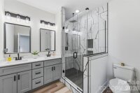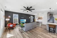 Modern Farmhouse in Hawthorne Commons! Welcome to this stunning newer construction home in the highly desirable Hawthorne Commons subdivision — a fully built-out community where opportunities like this are rare. Save on taxes with this property located outside of Albemarle city limits. Designed with both style and functionality in mind, the open-concept main level features wide-plank flooring, abundant natural light, and a spacious kitchen complete with custom cabinetry, quartz countertops, tile backsplash, stainless steel appliances, and a large peninsula ideal for gathering. The home offers two en suite bedrooms, providing flexibility for guests or multigenerational living. The primary suite includes a tiled walk-in shower with dual shower heads, including an overhead rain shower feature, double vanity, and generous storage. Custom closet systems are installed in all bedrooms. Additional highlights include shiplap accent walls, tile showers, a welcoming wrap-around porch featuring stained wood shiplap detail, a privacy-fenced backyard, and a two-car garage. Meticulously maintained with quality upgrades throughout and conveniently located near shopping, dining, and major commuting routes in Albemarle and throughout Stanly County.