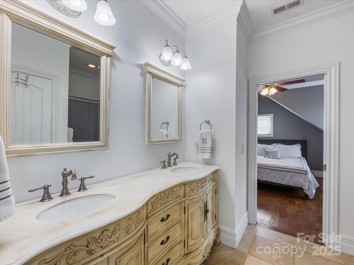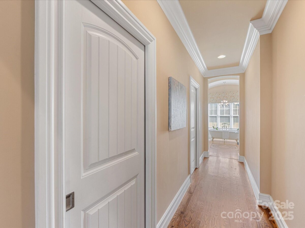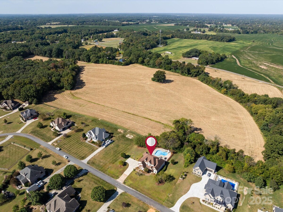 Welcome to this beautiful farmhouse-style home nestled in serene Smith Field, ideally located just minutes from I-485 and local schools. Step through the grand foyer with elegant tile inlay into the main level, where a luxurious primary suite awaits with dual walk-in closets and a spa-style bath. Relax in the living space with custom built-ins or enjoy movie nights in the dedicated theatre room. The heart of the home features a custom exposed-brick kitchen with upscale cabinetry and a large island, flowing into the dining room with vaulted wood ceilings. Step outside to the covered veranda to enjoy your morning coffee overlooking the expansive yard, pool with waterslide, and farmland views. Upstairs offers five well-sized bedrooms, including a private suite and multiple Jack-and-Jill bathrooms for family convenience. Don’t miss your chance to own this one-of-a-kind home!