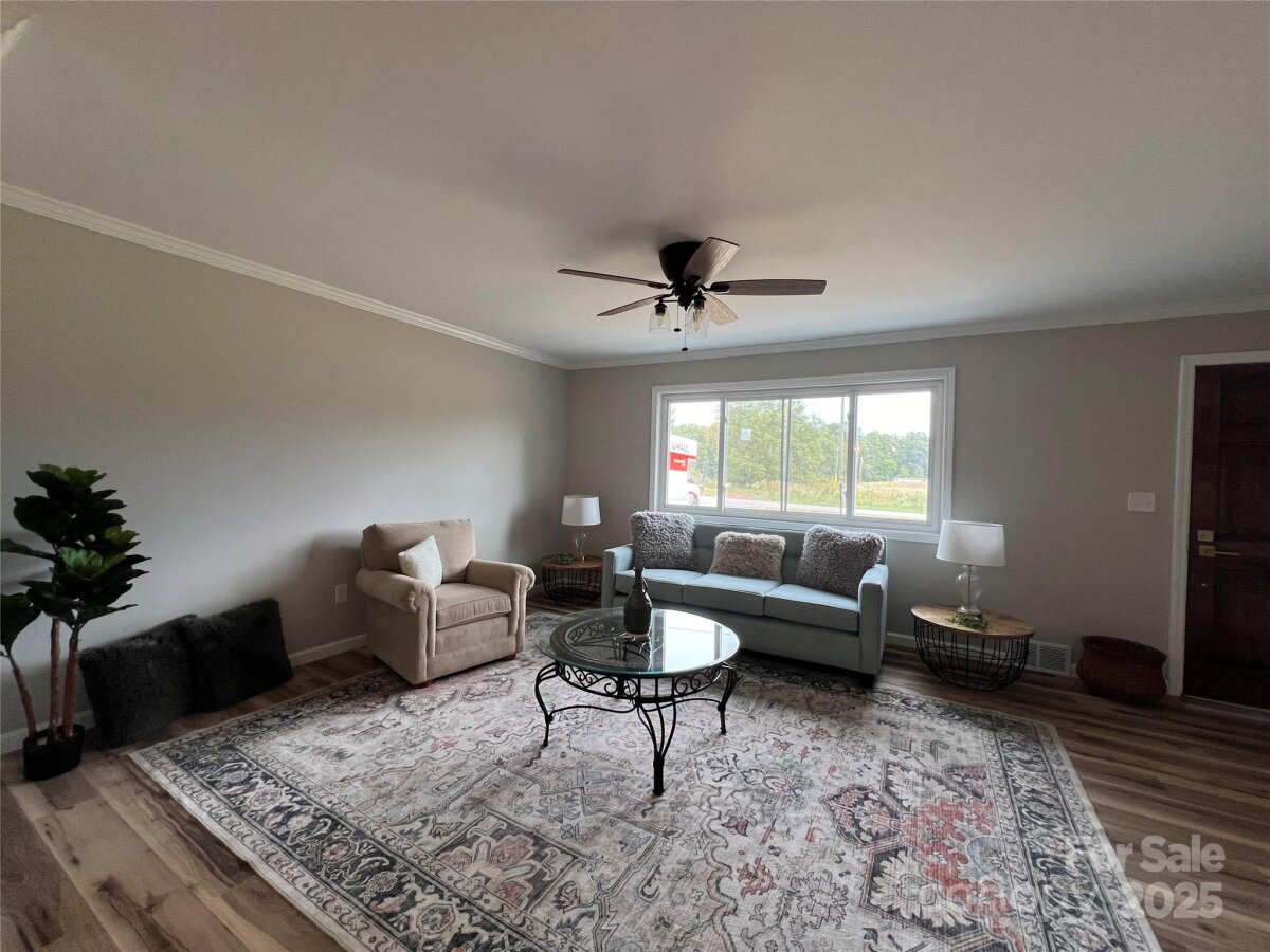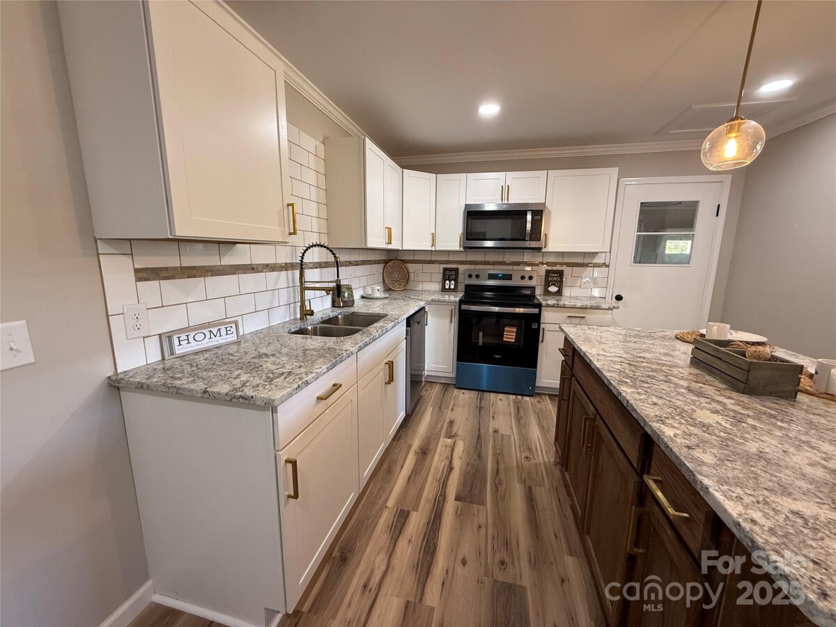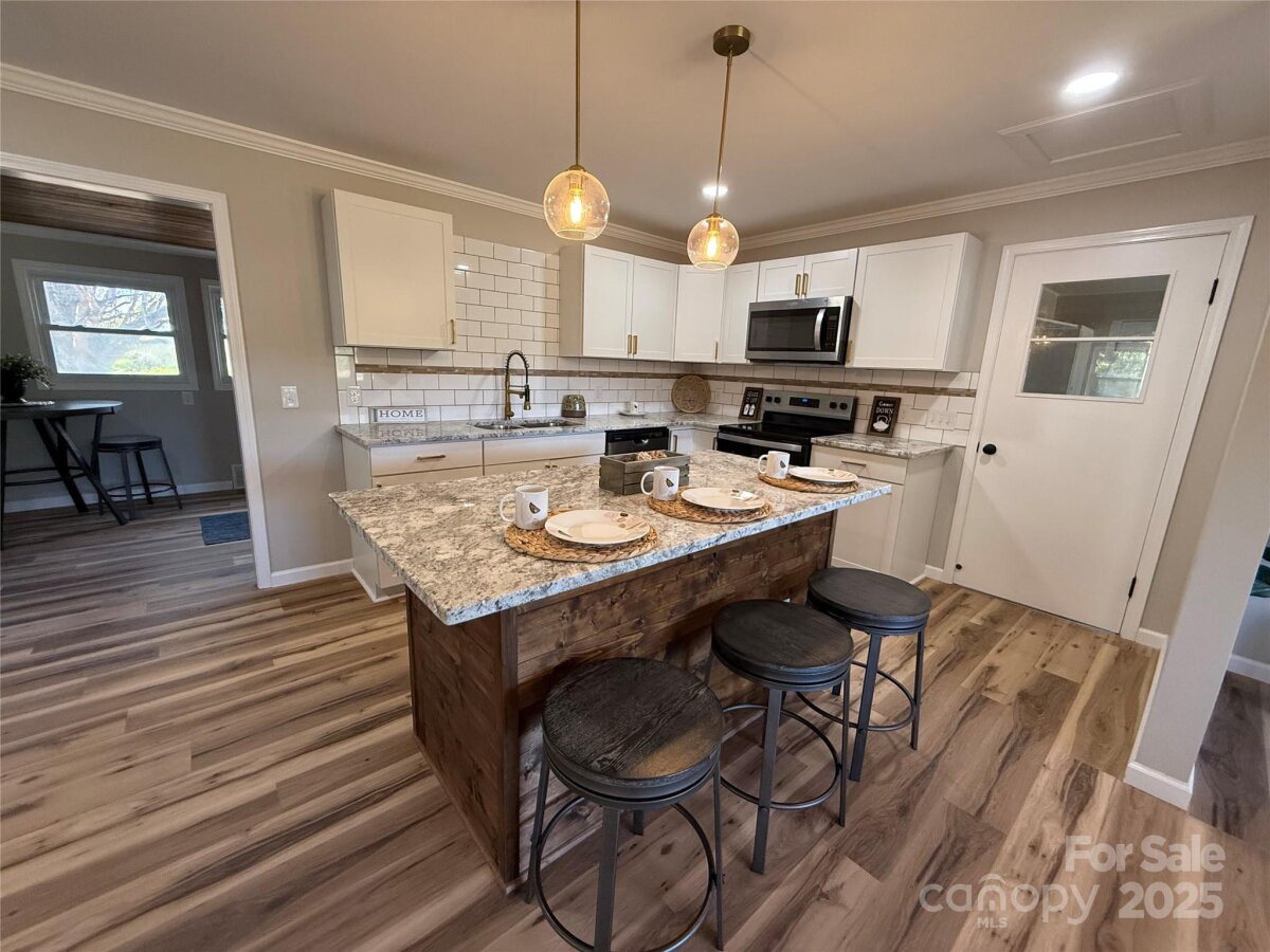 NICELY RENOVATED AND MOVE IN READY! This gorgeous 3BR/2BA home on .61 acres offers modern updates and timeless charm. Enjoy relaxing on the front porch before stepping into the open floorplan featuring a spacious living room, LVP flooring, crown molding, and neutral paint w/brushed gold accents throughout. Fabulous kitchen w/granite countertops, tile backsplash, island, abundant cabinet space, and brand-new appliances. The primary suite boasts a walk-in closet and a spa-like en-suite bathroom with walk in shower and pine board ceiling. Additional bedrooms are bright and spacious. Guest bathroom has dual vanity sink, tub/shower and pine board ceilings. A dedicated laundry area, a mudroom off the attached single car garage and paved drive add to the home’s functionality. Additional storage building included. Just 20 minutes from Clemmons, 30 minutes from Winston-Salem and Elkin. Schedule a tour today!