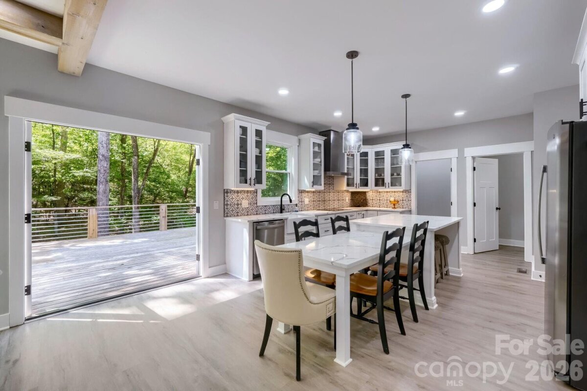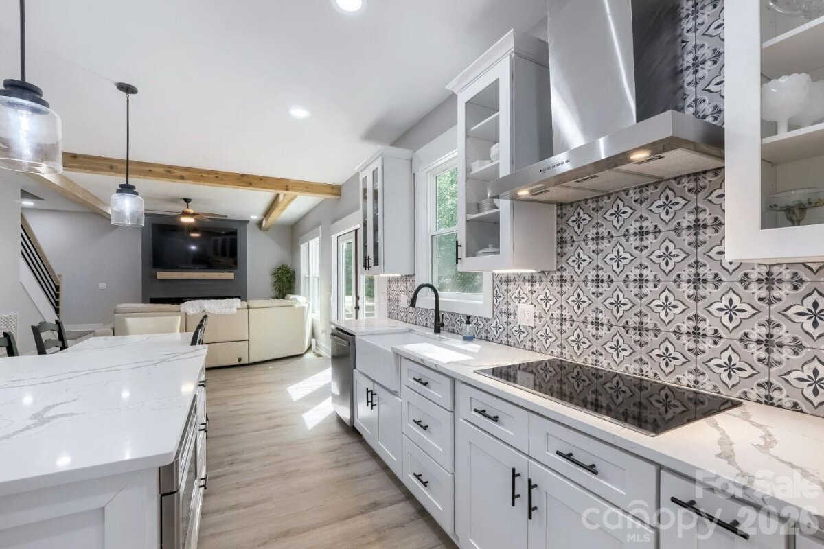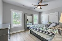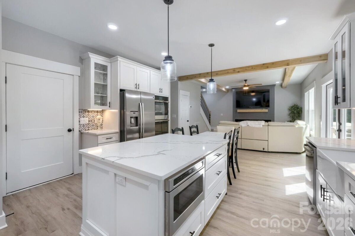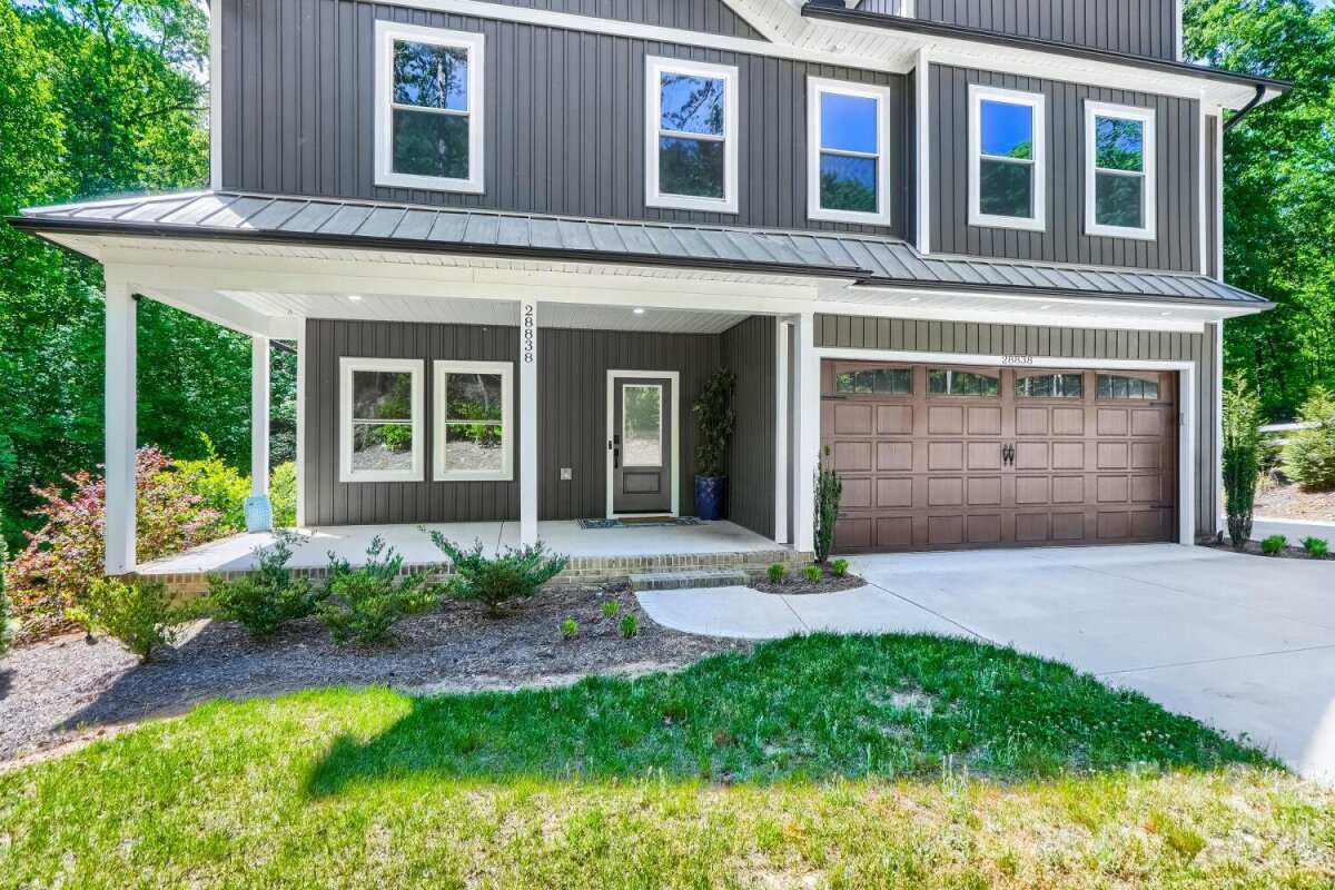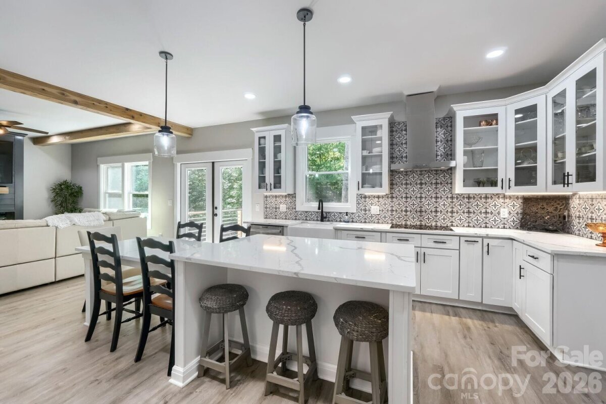 Welcome to this stunning farmhouse-style retreat nestled on just under an acre of nature lover's paradise — complete with a wooded backyard, babbling creek, and the kind of privacy that's nearly impossible to find. From the moment you arrive, the charcoal board-and-batten exterior, covered front porch, and landscape lighting set the tone for what awaits inside. Step through the foyer, and you're immediately greeted by a thoughtfully designed first floor featuring laminate wood flooring throughout. A private office off the foyer with double French doors is tucked away from the main living areas, making it ideal for remote work or a quiet retreat. The open-concept great room impresses with soaring natural wood ceiling beams, an electric fireplace framed in shiplap, recessed lighting, and a wall of windows overlooking the lush wooded backyard — all flowing seamlessly into the kitchen. The kitchen is an absolute showstopper and the heart of this home. White shaker cabinets with glass-front uppers are paired with a dramatic artisan tile backsplash, quartz countertops, and a large custom island with seating. A ceramic farmhouse sink is centered under a window with backyard views, and the stainless steel appliance package includes double wall ovens, an electric cooktop, a dishwasher, and a microwave. Pendant and recessed lighting, black hardware, and an oversized pantry with a built-in butler's pantry — perfectly styled as a coffee bar — complete this chef's dream space. The informal dining area features a built-in table with a quartz countertop connected to the island, plus French doors that open to the impressive 20x20 deck with cable railing, overlooking a stunning canopy of mature trees and the creek below. Whether you're sipping morning coffee or entertaining at sunset, this outdoor space is pure magic. Also on the main level is a stylish powder room with a quartz vanity and black fixtures. The finished attached two-car garage features epoxy flooring, a MyQ smart opener, recessed lighting, and extra storage. Upstairs, the spacious landing leads to four well-sized bedrooms, all with laminate wood flooring and ceiling fans. The primary suite offers a large walk-in custom closet and a spa-quality ensuite with a double quartz vanity, black fixtures, and an oversized walk-in tile shower with wave-texture wall tile, dual niches, mosaic floor tile, and a window that brings the outdoors in. Three additional bedrooms are generously sized — each with laminate wood flooring and ceiling fans — with one bedroom offering peaceful wooded views through dual windows. All three are served by a well-appointed hall bath with quartz vanity, black fixtures, and a tub/shower combo. A laundry room that redefines the standard — white cabinetry, quartz countertop, artisan tile backsplash, floating wood shelf, and a window. Exterior extras include black gutters, landscape lighting, an extra parking pad, and a creek-side backyard that truly cannot be replicated. And the location? Better than you'd expect. Less than 10 miles to Lake Tillery, under 4 miles to Uwharrie Vineyards, ~3 miles to Downtown Albemarle — Goody Shop Cafe, Connie's Coffee and Cafe, Five Points Public House, Albemarle Sweet Shop & more. Catch summer baseball with the local Wampus Cats at Don Montgomery Park, and within about an hour of Uptown Charlotte. This one is special — and homes like this don't come around often in this area.