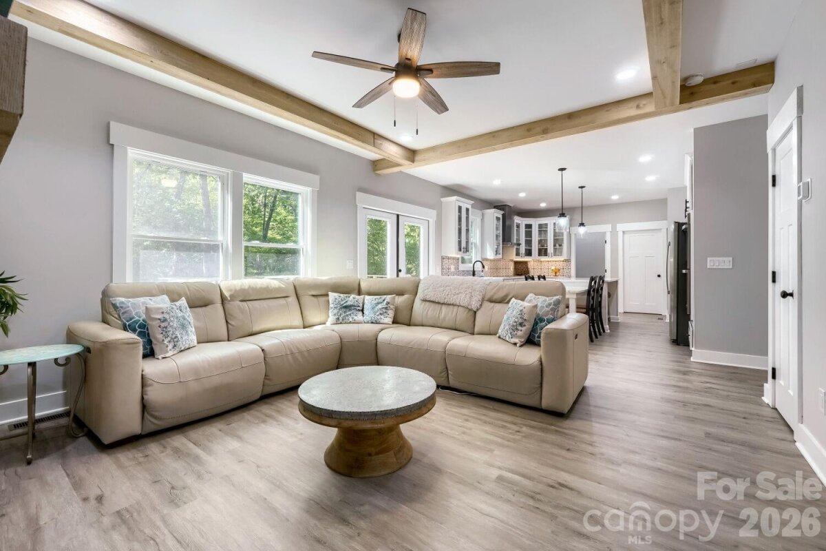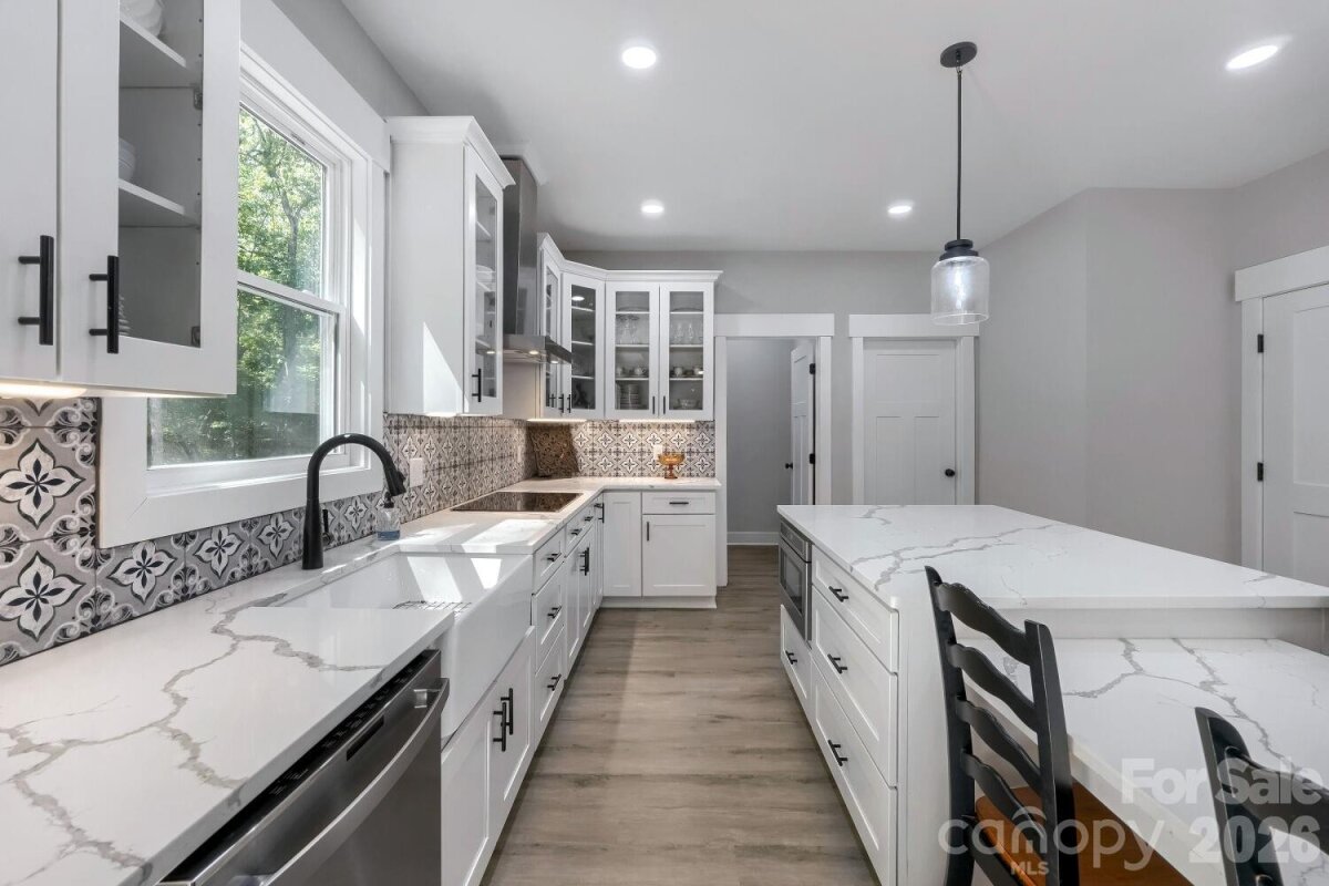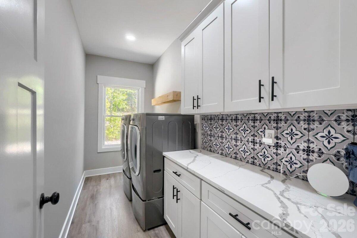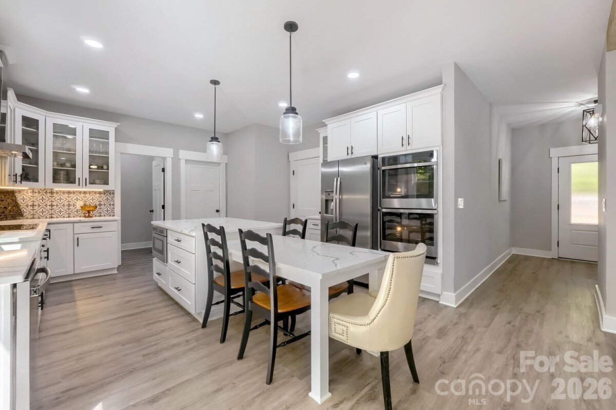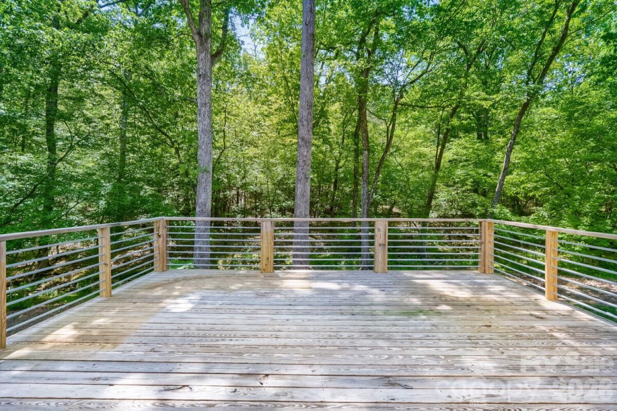 Welcome to this stunning farmhouse-style retreat nestled on just under an acre of nature lover's paradise — complete with a wooded backyard, babbling creek, and the kind of privacy that's nearly impossible to find. From the moment you arrive, the charcoal board-and-batten exterior, covered front porch, and landscape lighting set the tone for what awaits inside. Step through the foyer, and you're immediately greeted by a thoughtfully designed first floor featuring laminate wood flooring throughout. A private office off the foyer with double French doors is tucked away from the main living areas, making it ideal for remote work or a quiet retreat. The open-concept great room impresses with soaring natural wood ceiling beams, an electric fireplace framed in shiplap, recessed lighting, and a wall of windows overlooking the lush wooded backyard — all flowing seamlessly into the kitchen. The kitchen is an absolute showstopper and the heart of this home. White shaker cabinets with glass-front uppers are paired with a dramatic artisan tile backsplash, quartz countertops, and a large custom island with seating. A ceramic farmhouse sink is centered under a window with backyard views, and the stainless steel appliance package includes double wall ovens, an electric cooktop, a dishwasher, and a microwave. Pendant and recessed lighting, black hardware, and an oversized pantry with a built-in butler's pantry — perfectly styled as a coffee bar — complete this chef's dream space. The informal dining area features a built-in table with a quartz countertop connected to the island, plus French doors that open to the impressive 20x20 deck with cable railing, overlooking a stunning canopy of mature trees and the creek below. Whether you're sipping morning coffee or entertaining at sunset, this outdoor space is pure magic. Also on the main level is a stylish powder room with a quartz vanity and black fixtures. The finished attached two-car garage features epoxy flooring, a MyQ smart opener, recessed lighting, and extra storage. Upstairs, the spacious landing leads to four well-sized bedrooms, all with laminate wood flooring and ceiling fans. The primary suite offers a large walk-in custom closet and a spa-quality ensuite with a double quartz vanity, black fixtures, and an oversized walk-in tile shower with wave-texture wall tile, dual niches, mosaic floor tile, and a window that brings the outdoors in. Three additional bedrooms are generously sized — each with laminate wood flooring and ceiling fans — with one bedroom offering peaceful wooded views through dual windows. All three are served by a well-appointed hall bath with quartz vanity, black fixtures, and a tub/shower combo. A laundry room that redefines the standard — white cabinetry, quartz countertop, artisan tile backsplash, floating wood shelf, and a window. Exterior extras include black gutters, landscape lighting, an extra parking pad, and a creek-side backyard that truly cannot be replicated. And the location? Better than you'd expect. Less than 10 miles to Lake Tillery, under 4 miles to Uwharrie Vineyards, ~3 miles to Downtown Albemarle — Goody Shop Cafe, Connie's Coffee and Cafe, Five Points Public House, Albemarle Sweet Shop & more. Catch summer baseball with the local Wampus Cats at Don Montgomery Park, and within about an hour of Uptown Charlotte. This one is special — and homes like this don't come around often in this area.